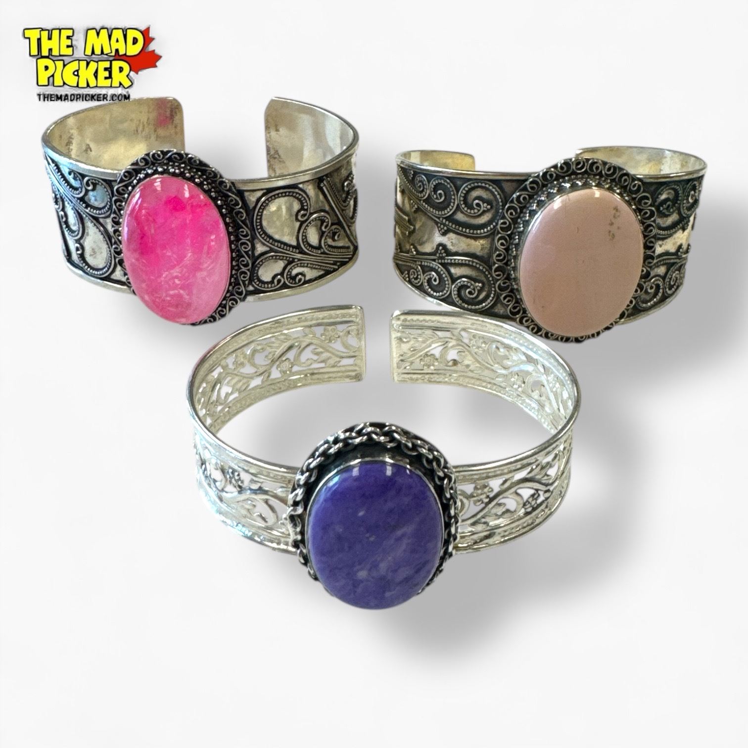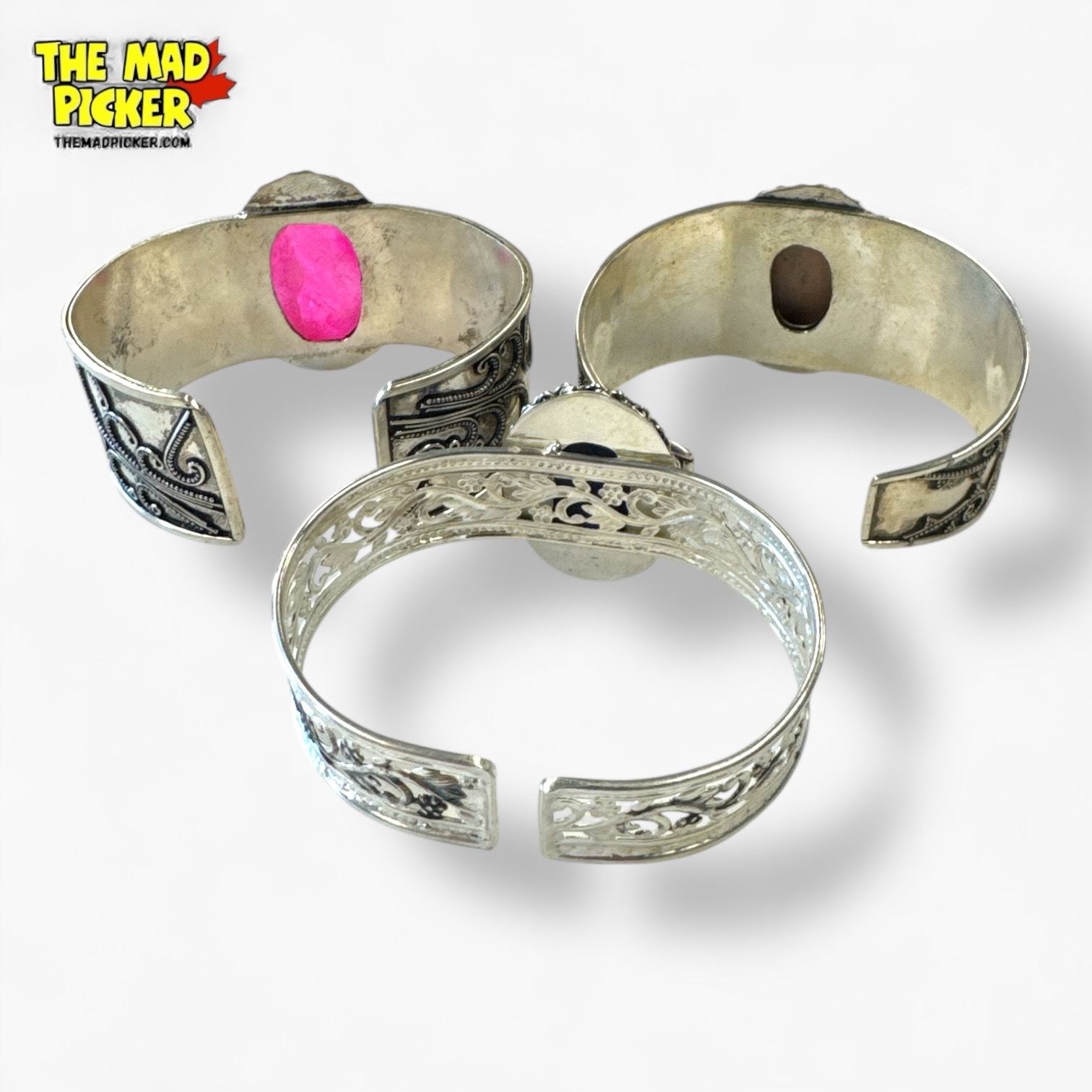 3 New Wide Polished Gemstone Bracelets in Silver Setting (all stamped .925) - Total weight: 126.6 grams