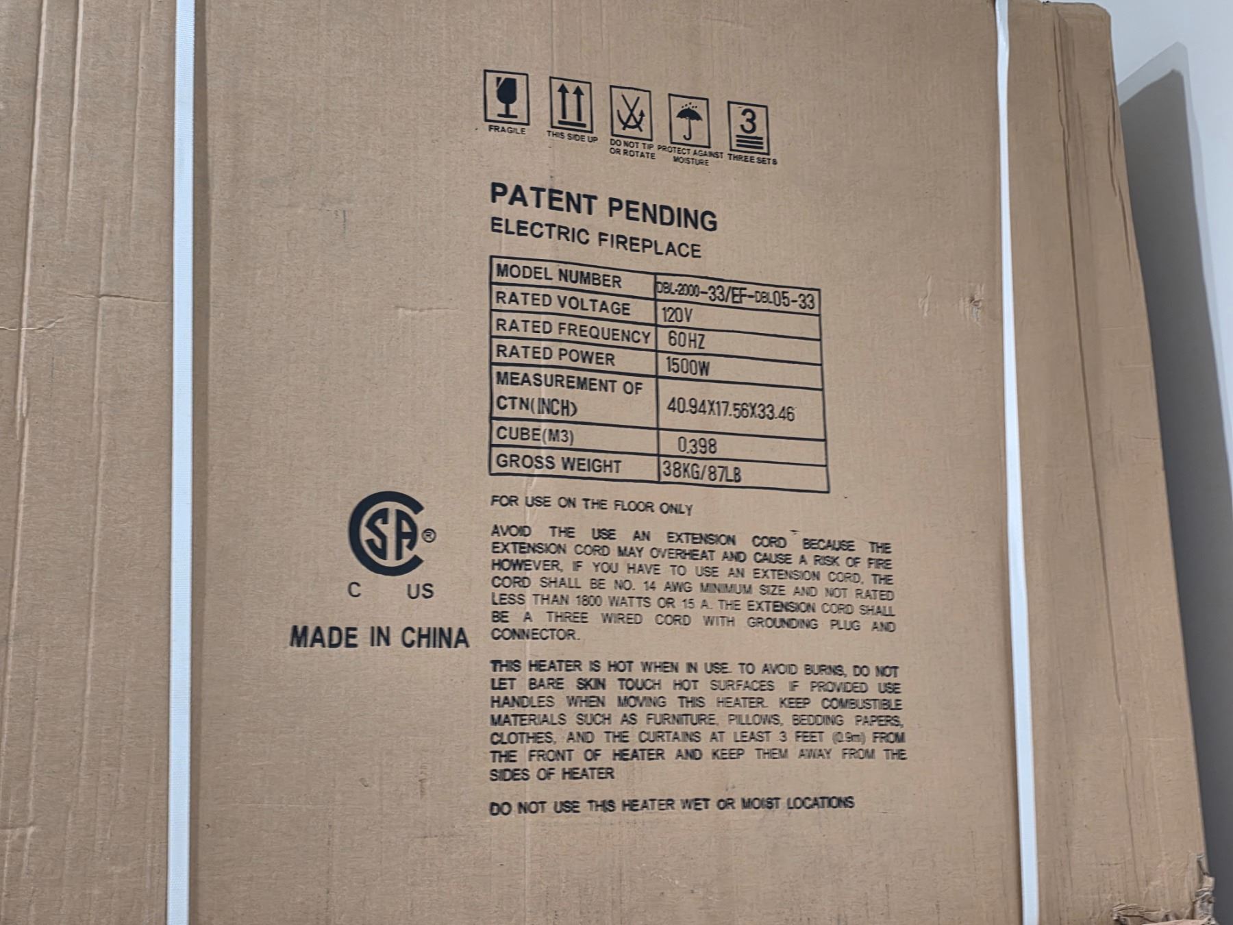 3-Pcs Electric Fireplace - Box 1 of 2 only (DBL-2000) and 4-Pcs Fireplace Trim Kit 34" x 36"