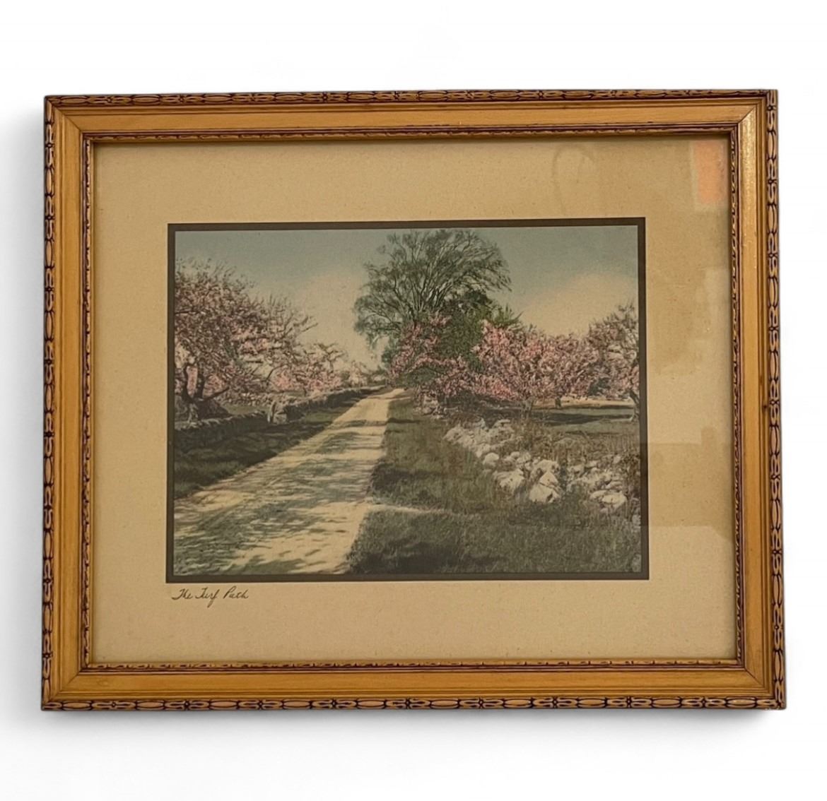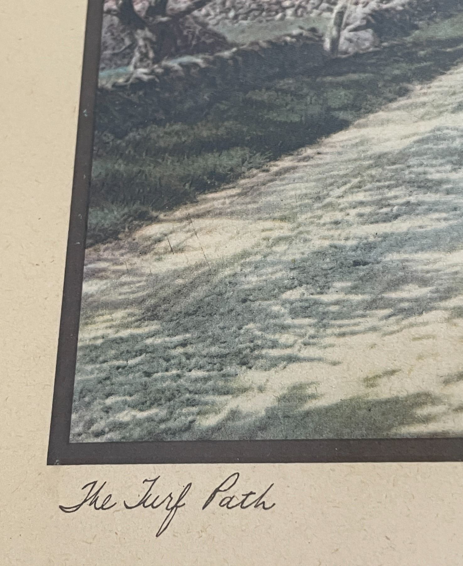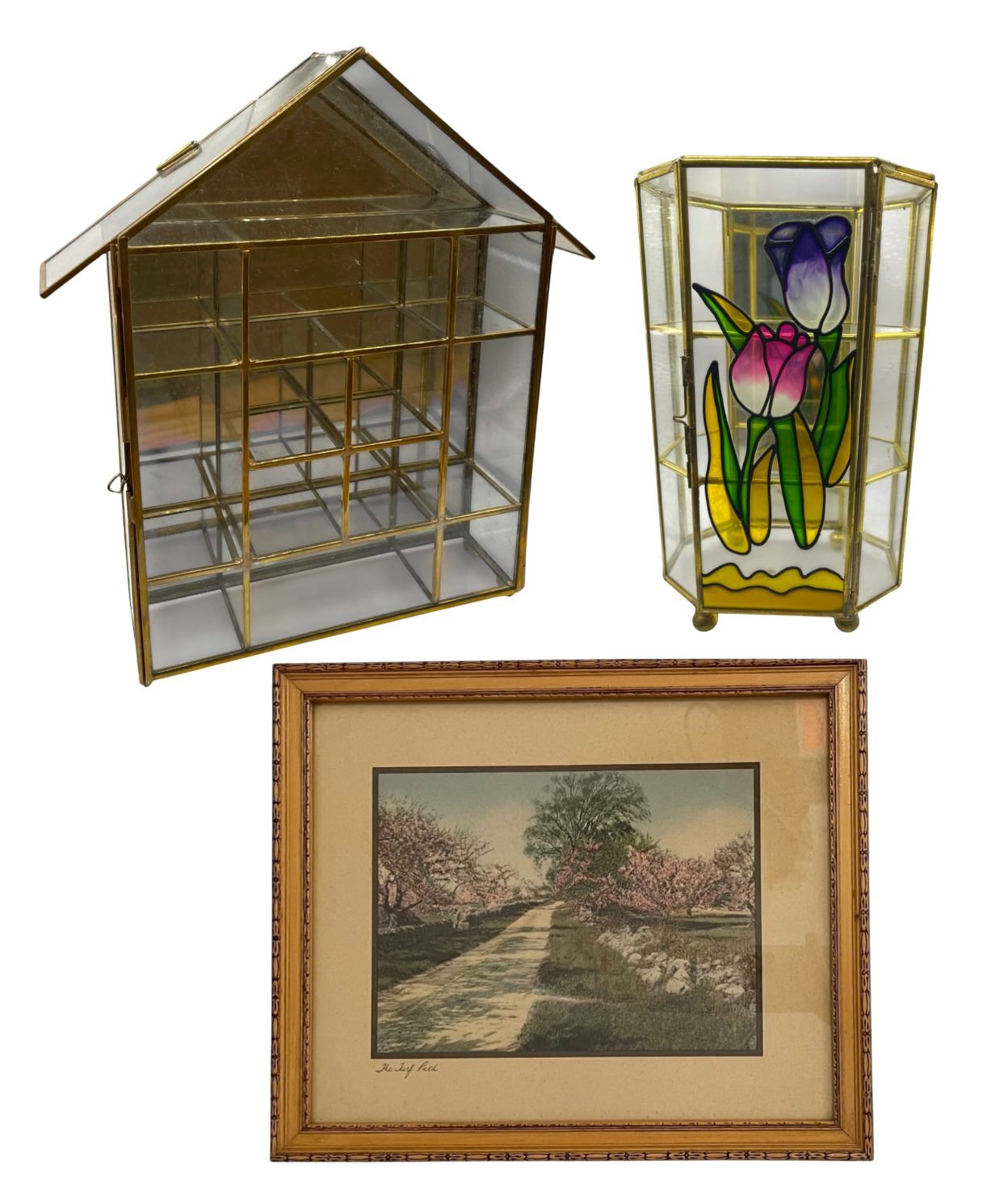 3 Pcs - Wallace Nutting Print "The Turf Path", Wall Grid Display, Hexagonal Stained-Glass Tabletop Cabinet