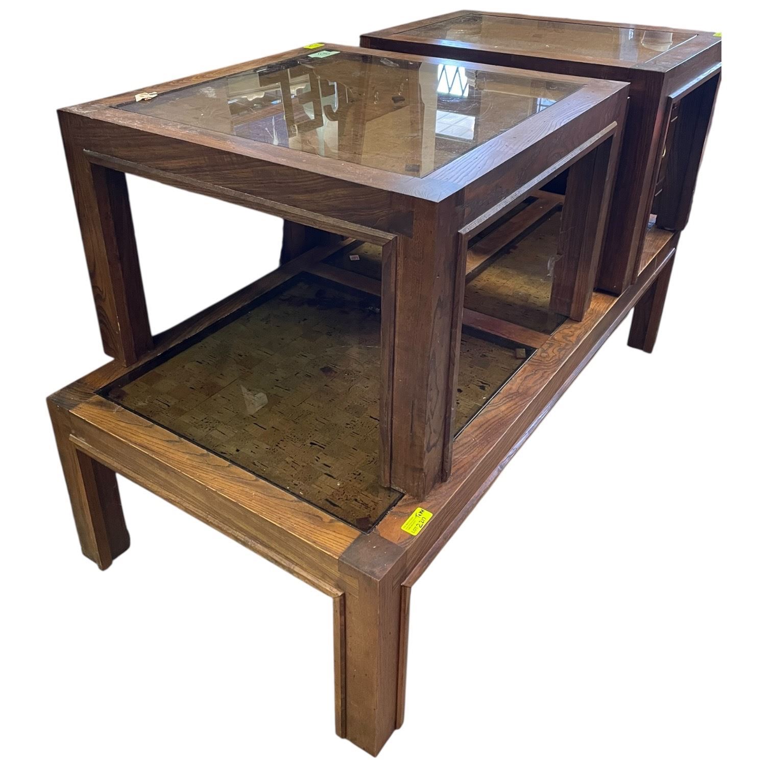 3 Piece Wood Coffee Table Set with Smoke Glass Inserts