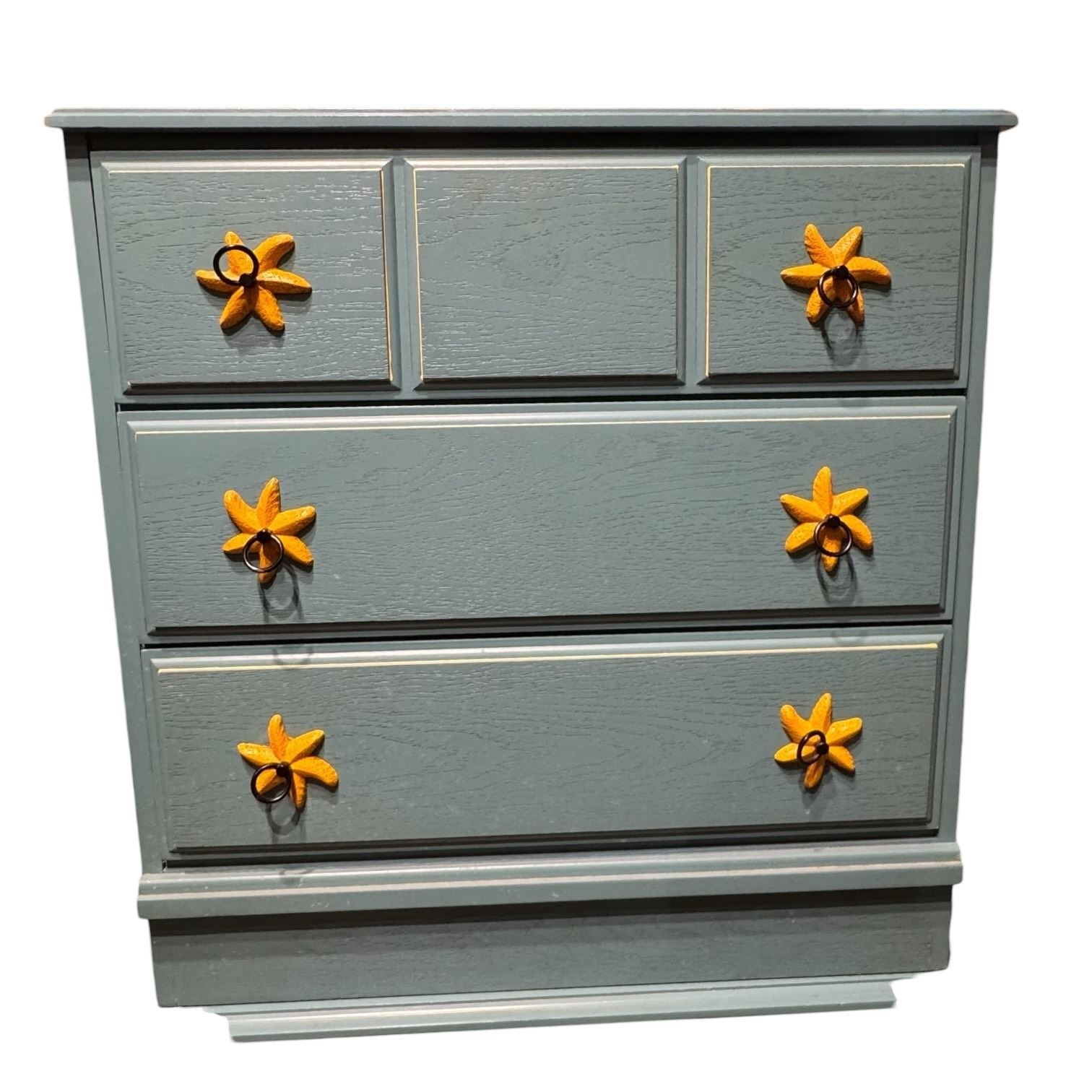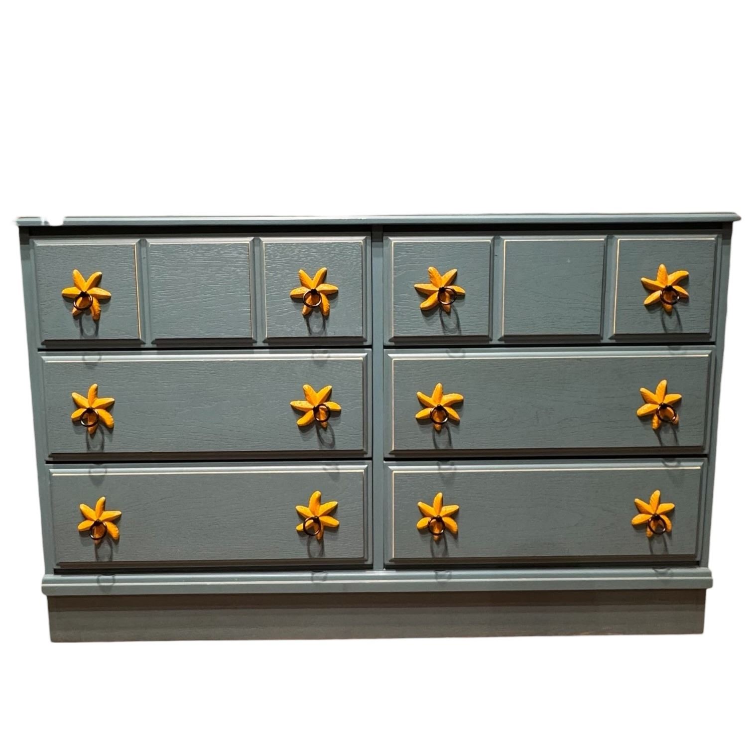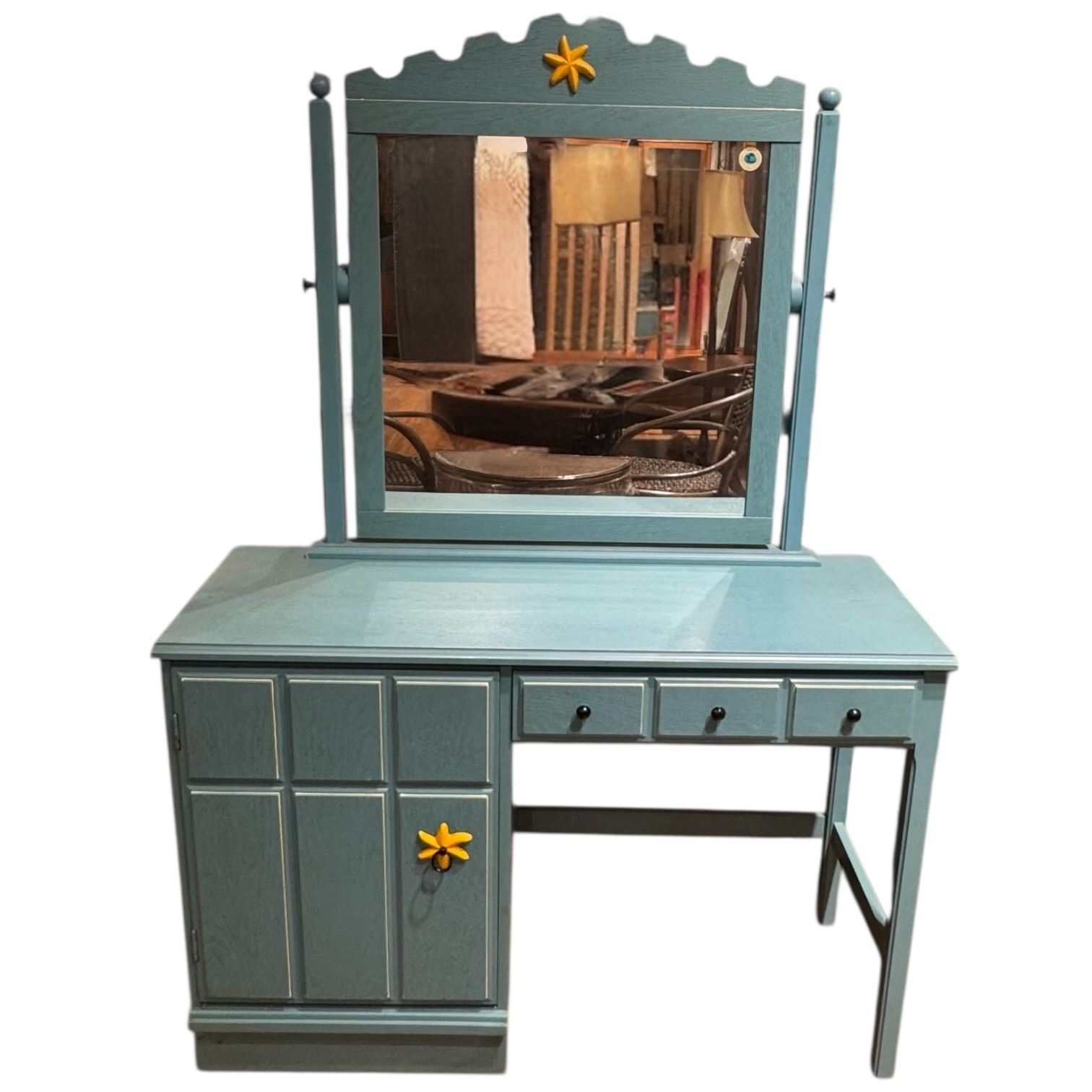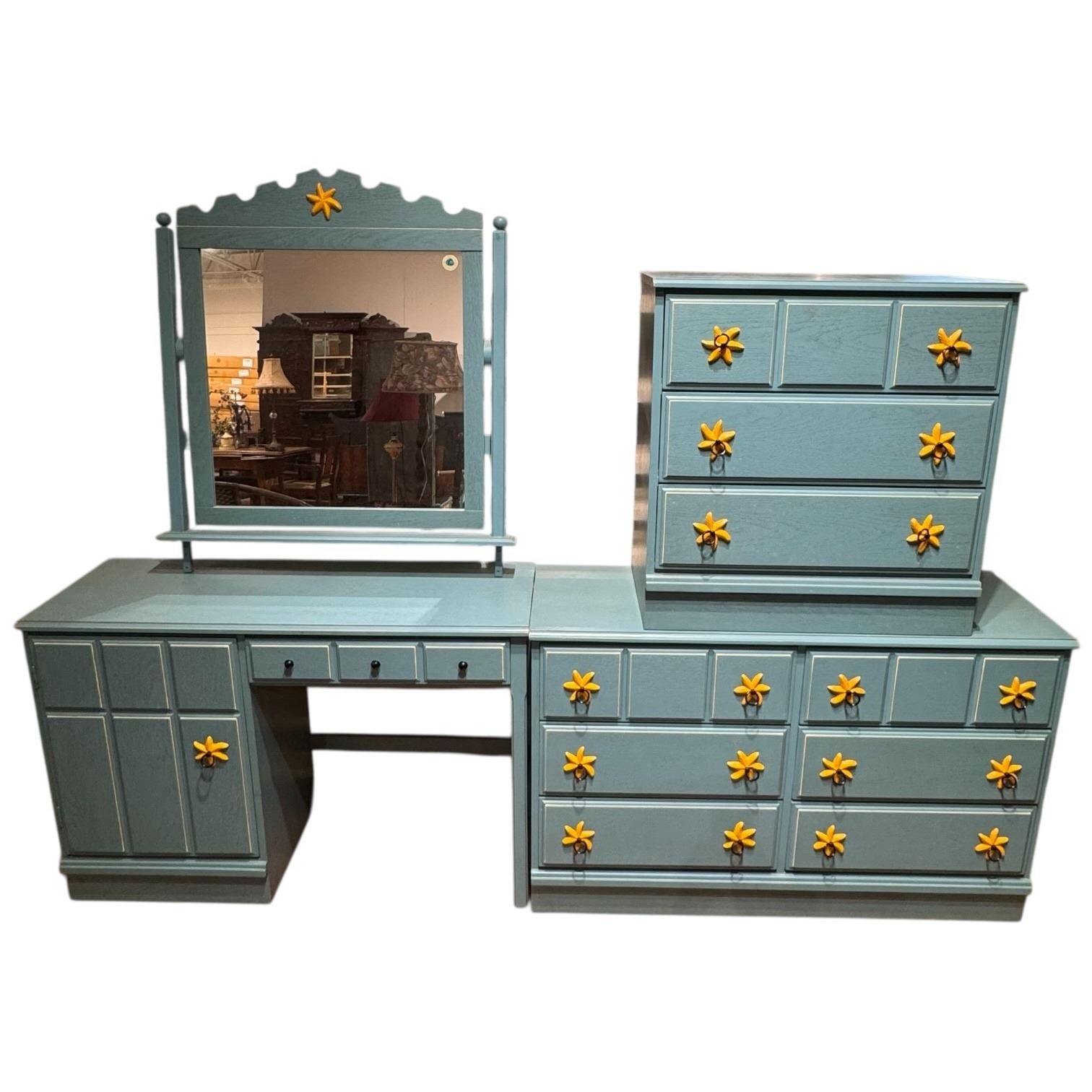 3 Piece Wood Dresser Set Painted Bright Blue with Starfish Pulls (Vanity Table, 6 Drawer Dresser & 3 Drawer Chest) Companion Pieces to Lot 76 - Bluer than the photo.
