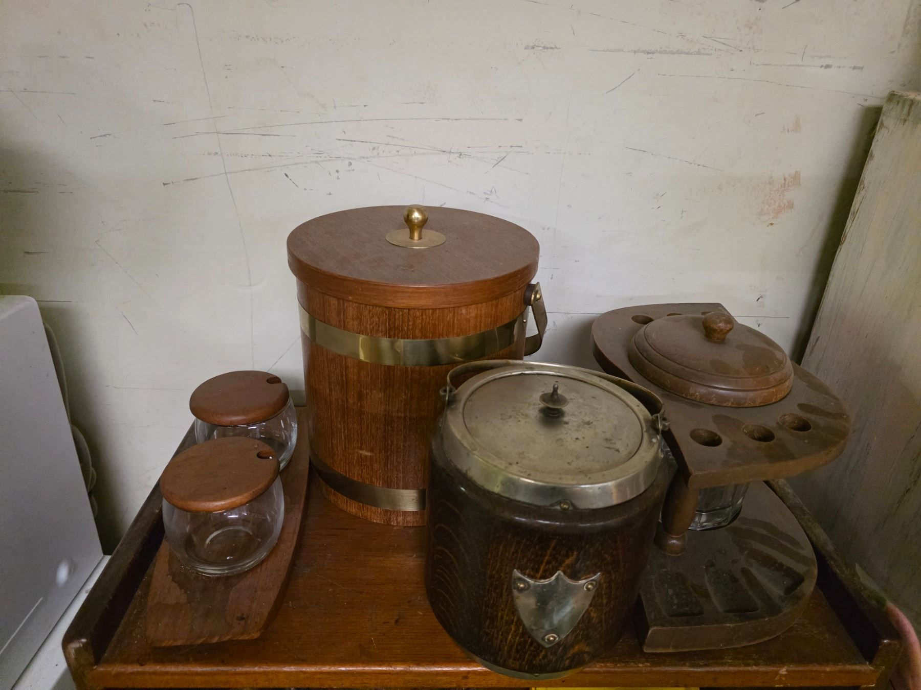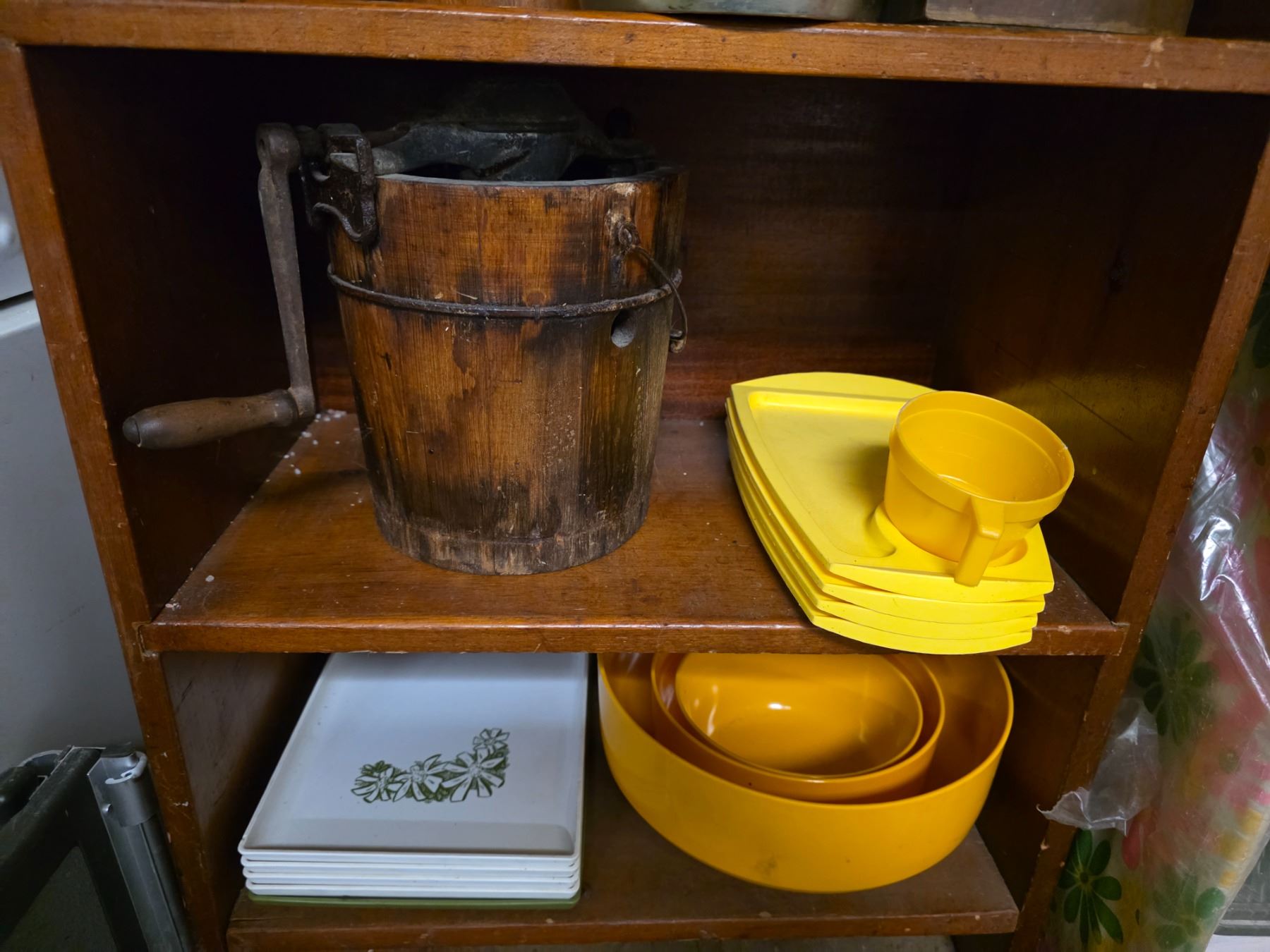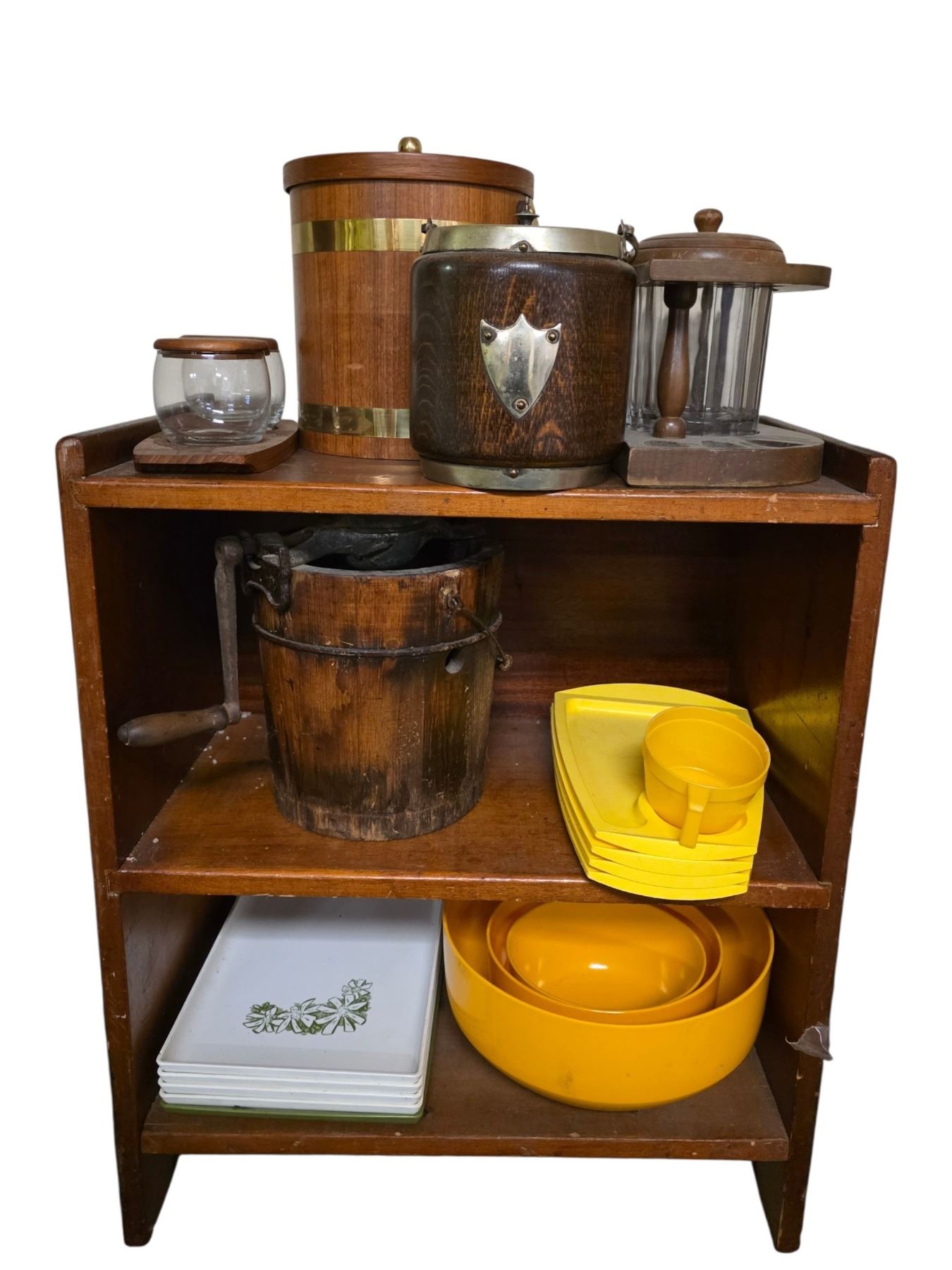 3-Shelf of Wooden Buckets, Yellow Plastic Dish Set and Misc Kitchenware