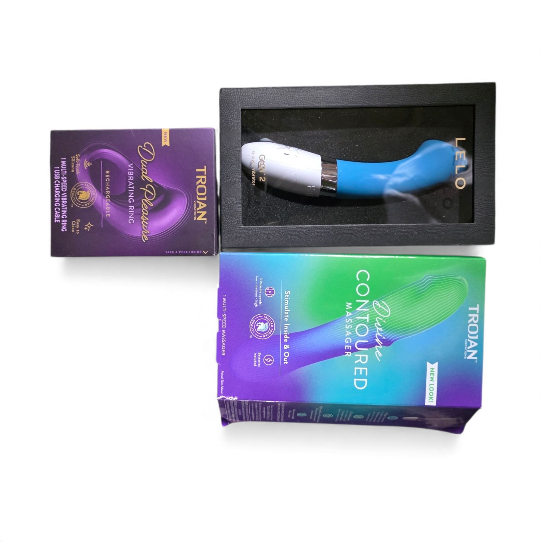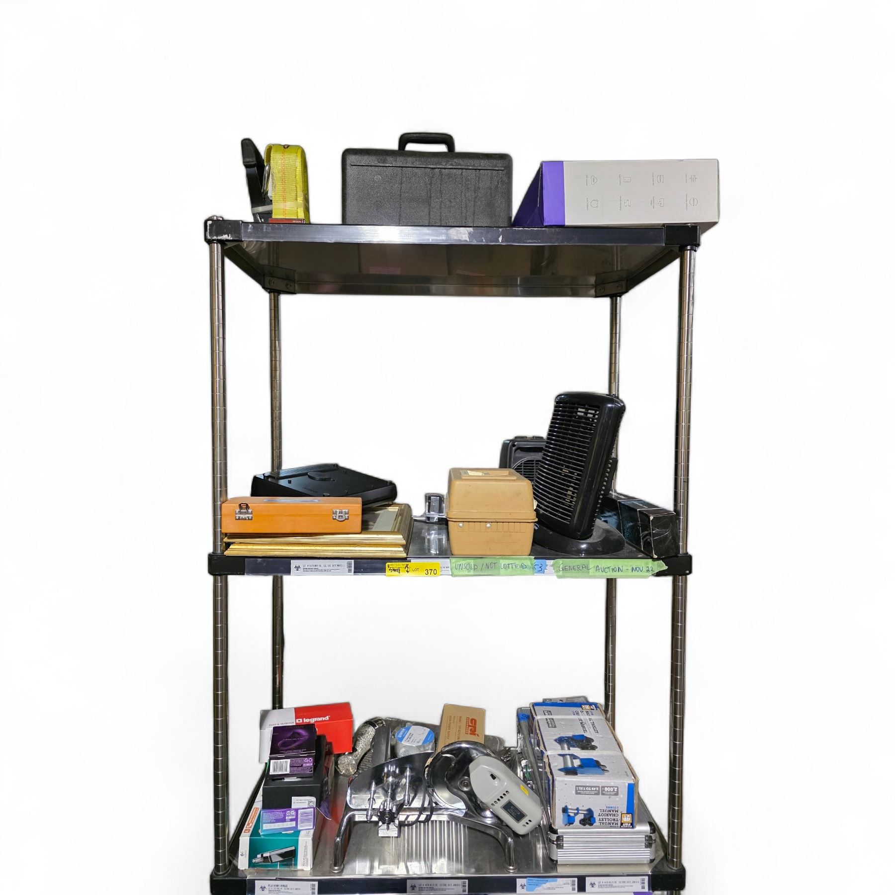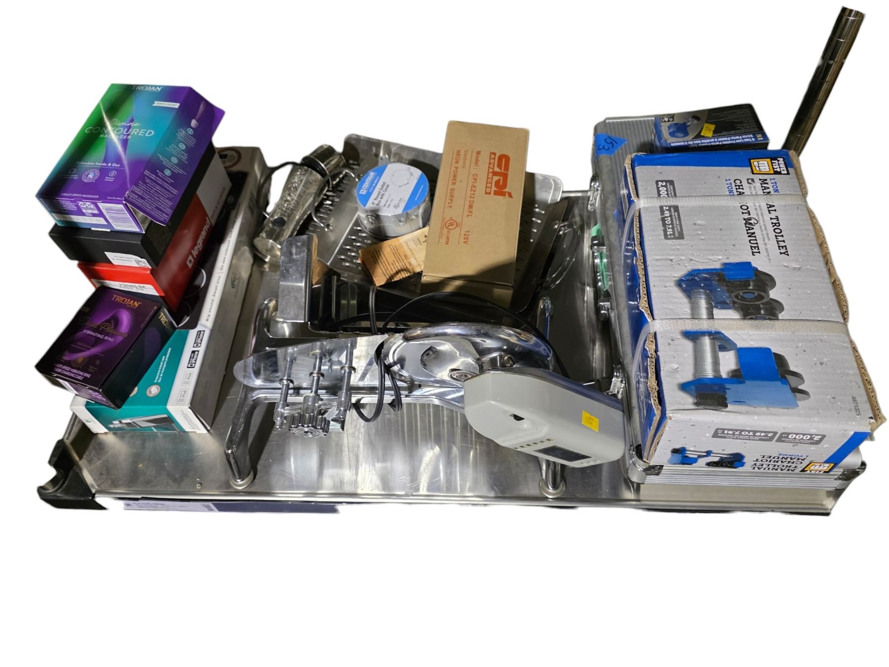 3 Shelves Assorted Misc Items - Adult Toys, 1 Ton Manual Trolley, Kitchen Tools, and More