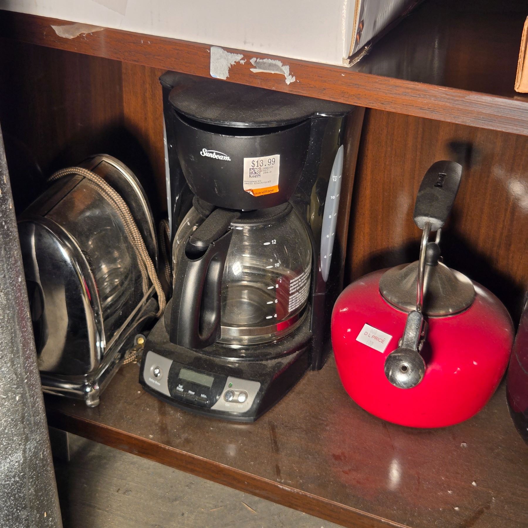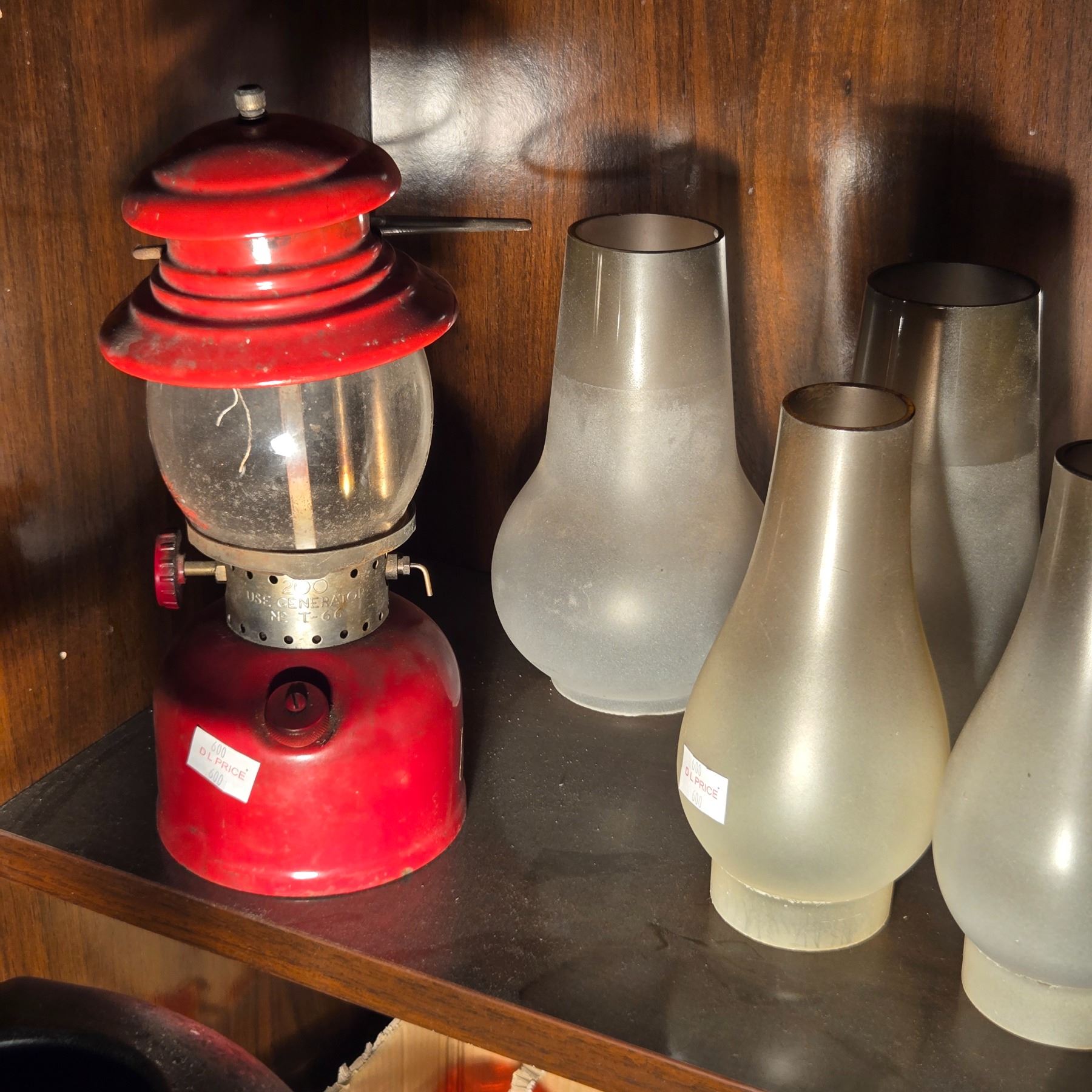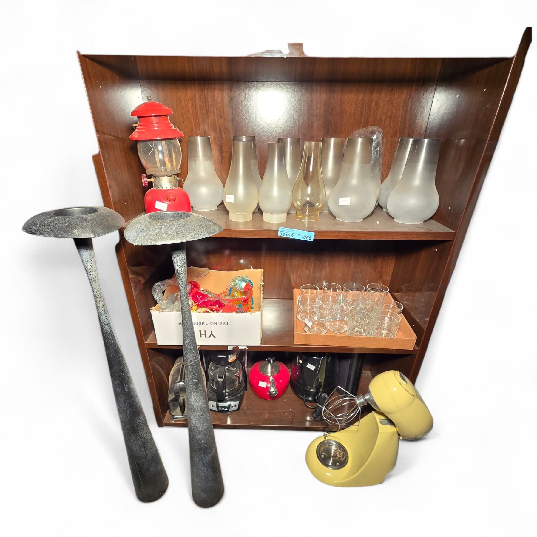 3 Shelves of Frosted Lamp Shades, Tea Pot, Coffee Maker, Glasses, Etc.