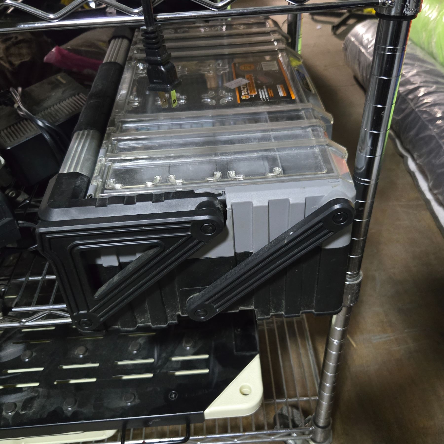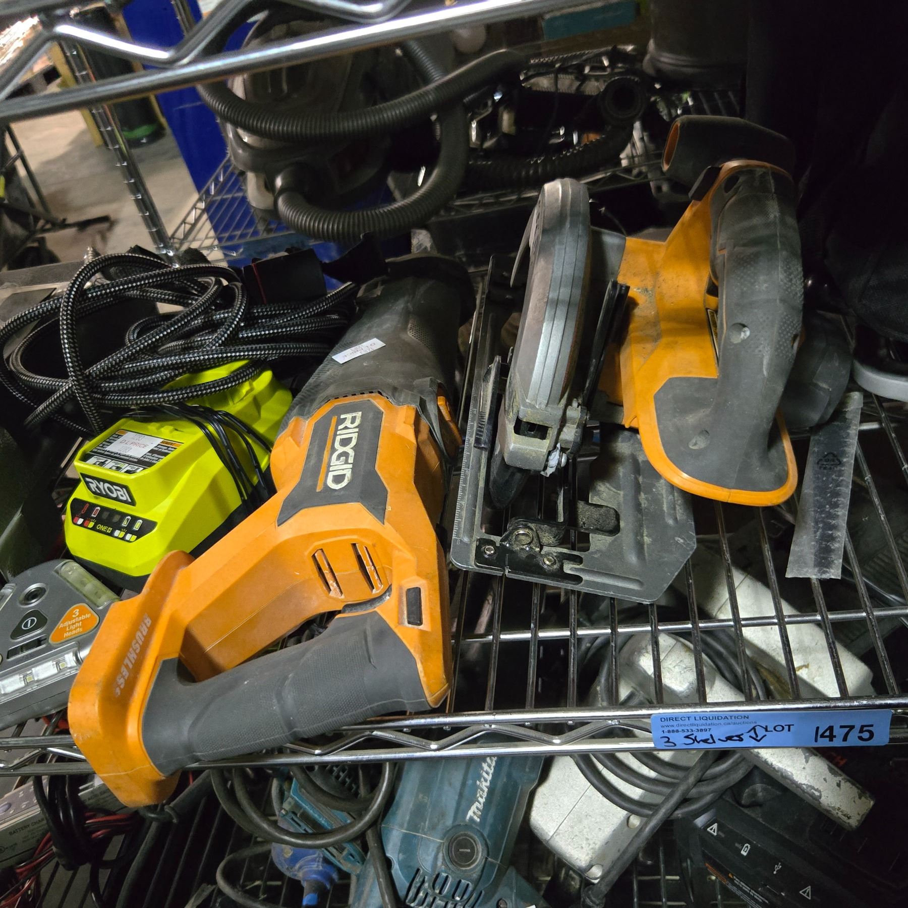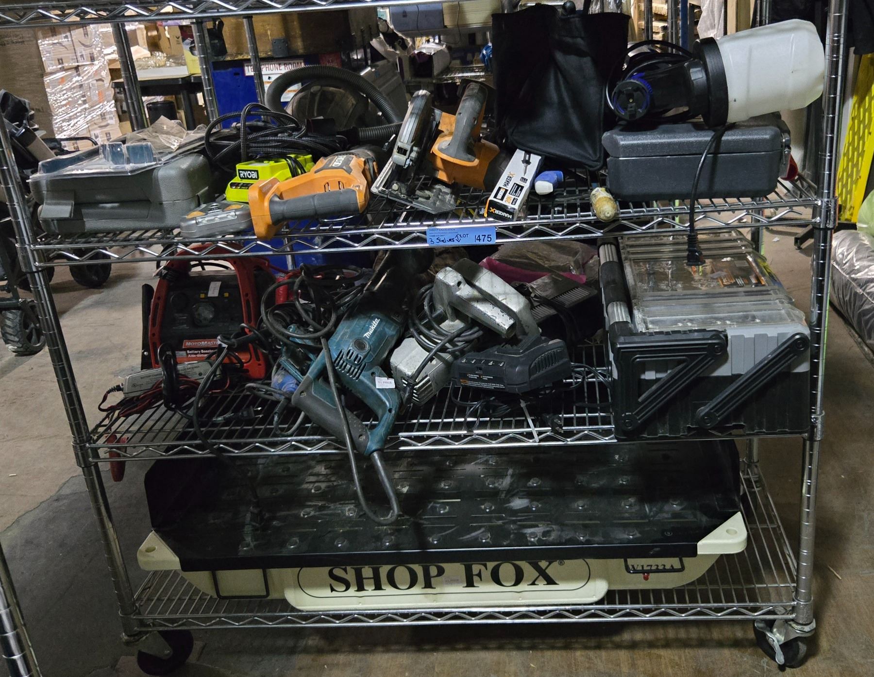 3 Shelves of Misc - Rigid Saw, Ryobi Charger, Ridgid Table Saw, Tactix Tool Box, Etc.