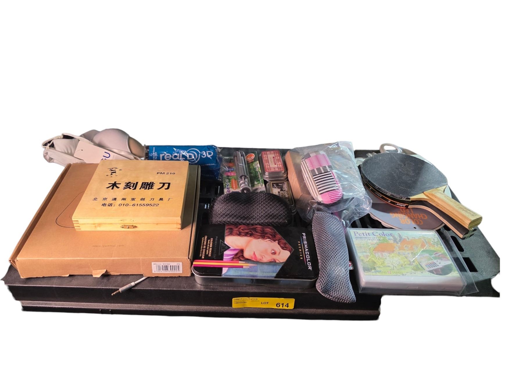 3 Shelves of Misc - Scale, Bra, Glasses w/Case, Colour Pencils, Tin Foil, Meat Grinder, Etc.