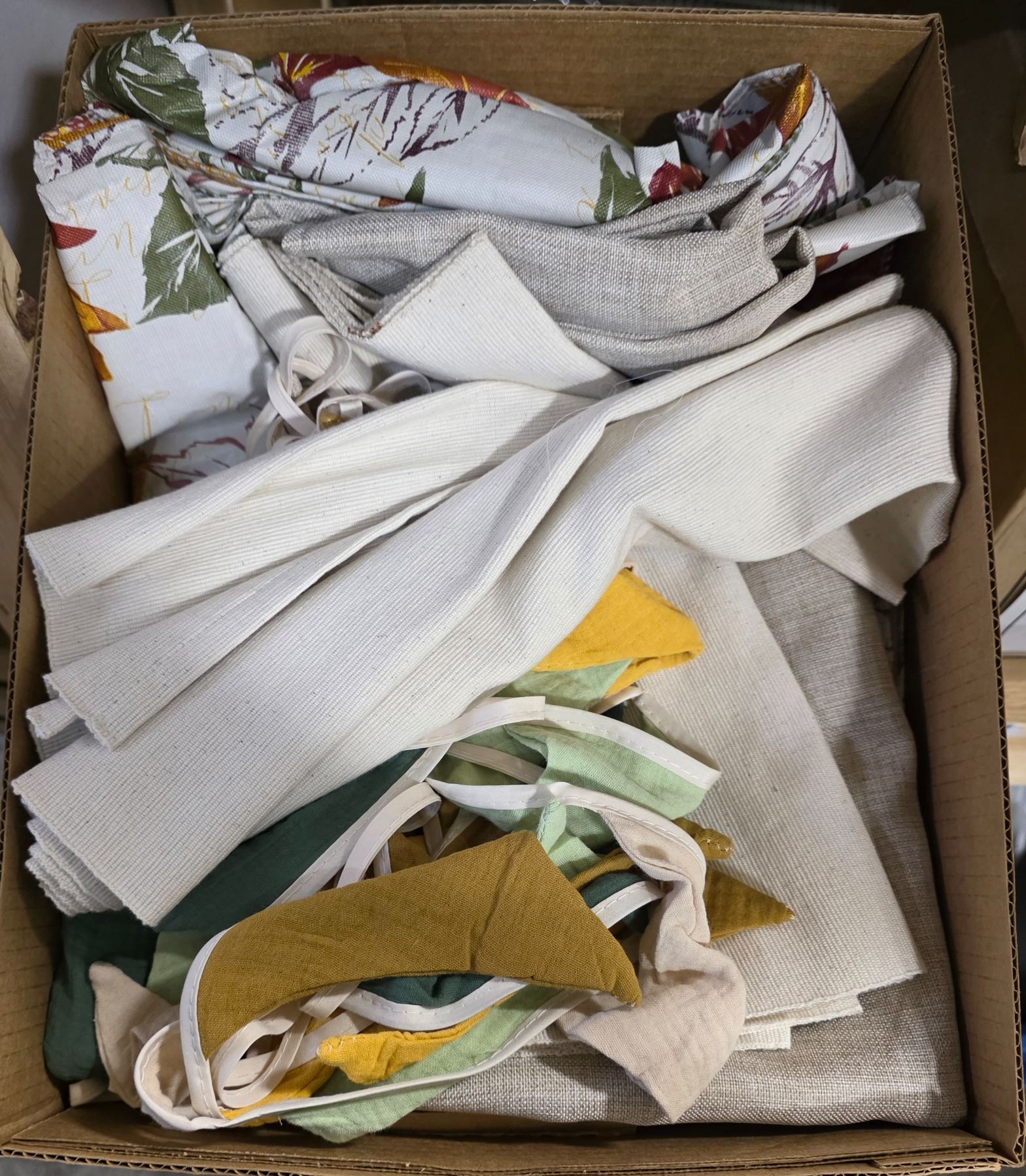 3 Shelves of Misc Set Dec - Kitchen Equip, Table Cloths, Glass Vessels, Dishes, Etc.