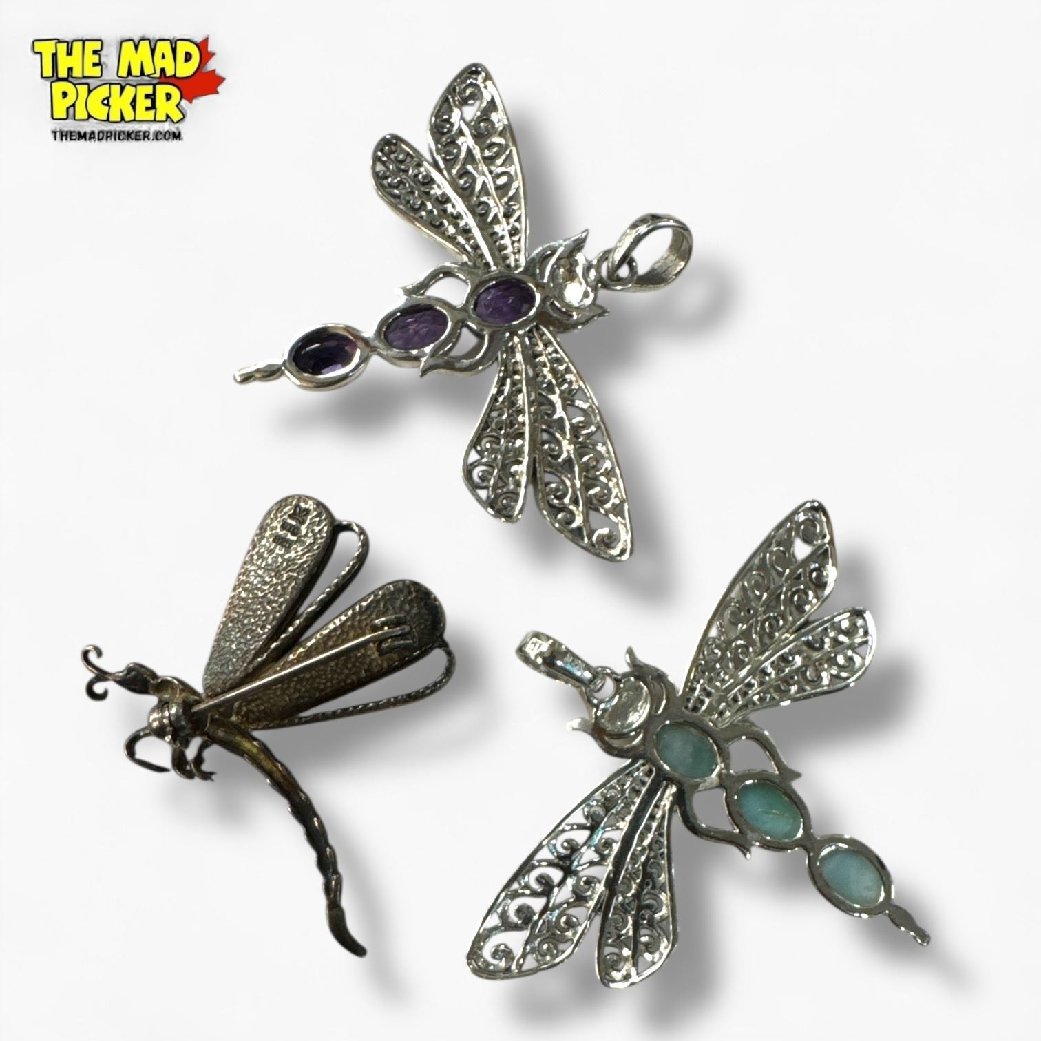 3 Sterling Silver Dragonfly Jewelry - 2 Gemstone Pendants & 1 Abalone Brooch - Total weight: grams