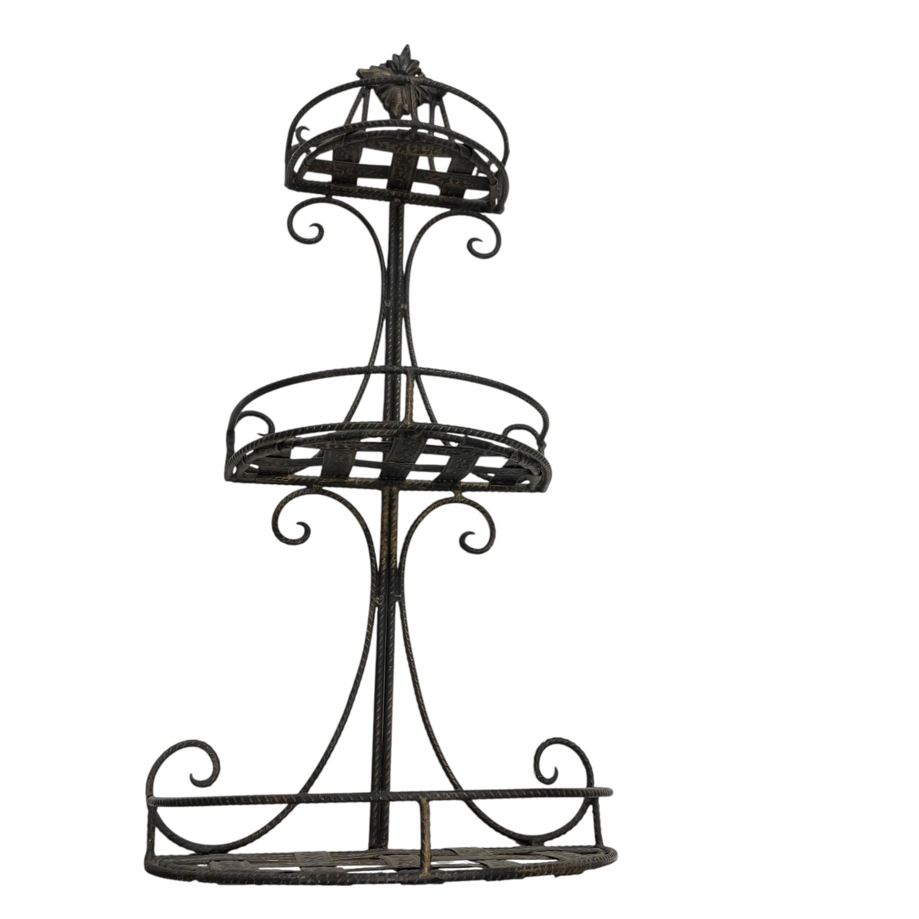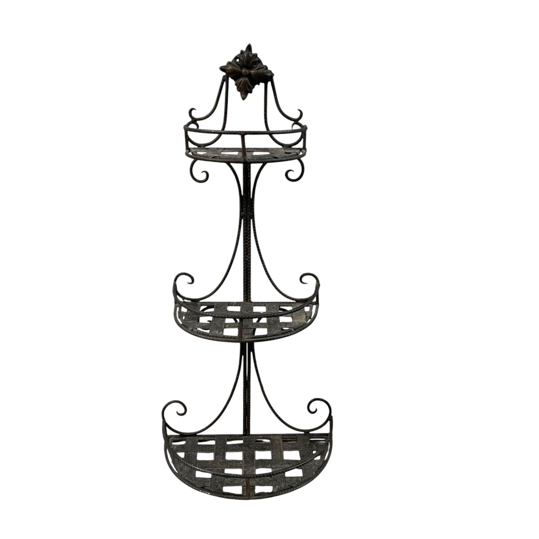 3 tiered metal wired shelf designed for home decor use. Measures 11-Inch length, 6-Inch width, and 24-Inch height. Suitable for organizing or displaying items in various settings. Item is as pictured.
