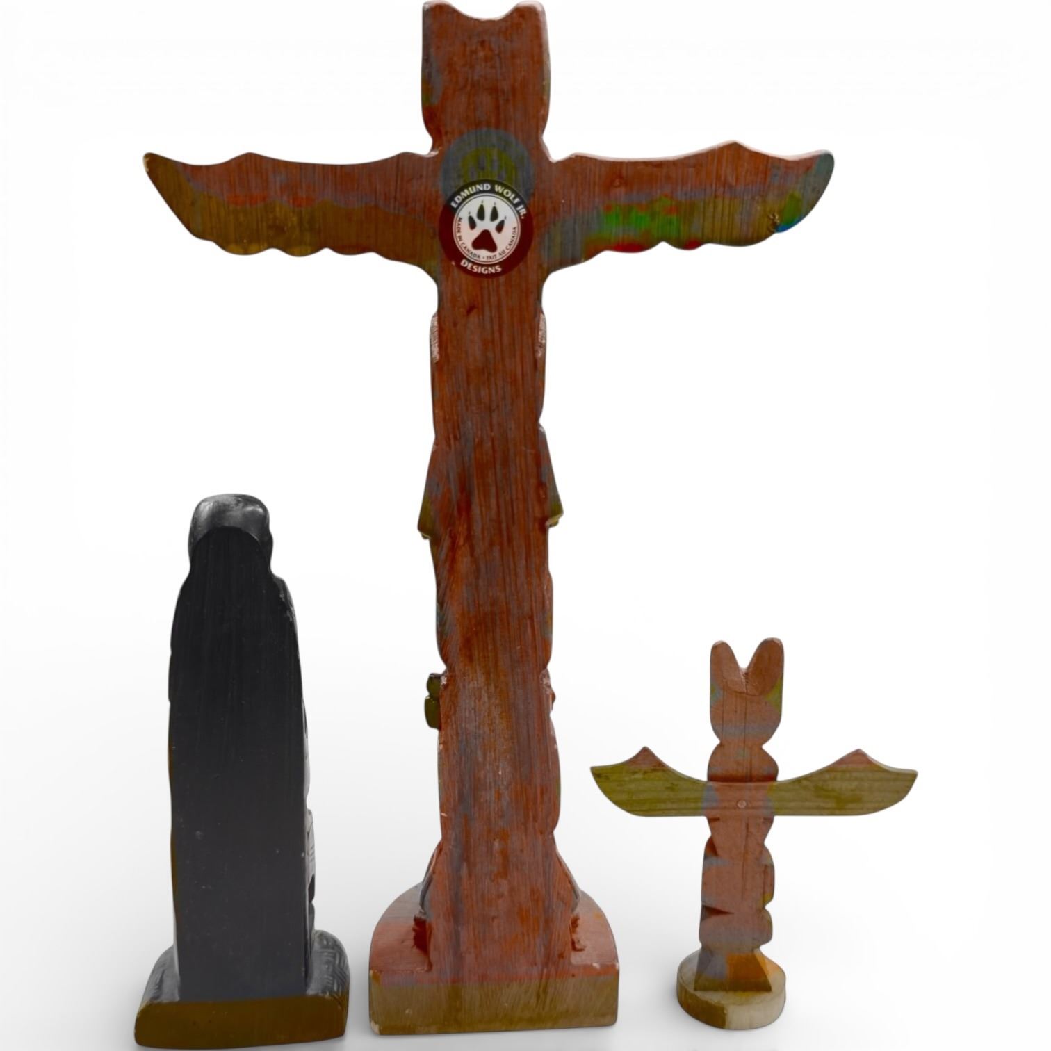 3 Totem Pole Figurines (11" Edmund Wolf, 6" Black Resin & 4.5" Carved & Painted Wood)