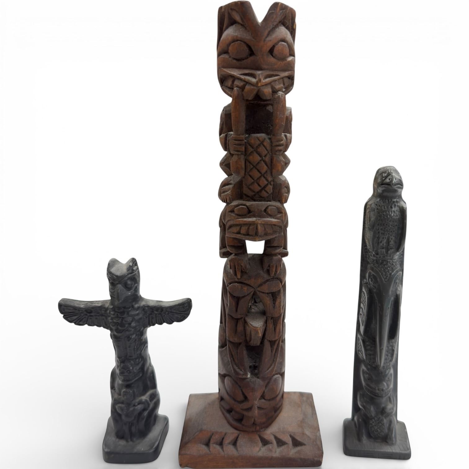 3 Totem Pole Figurines (2 black resin & one 9" carved wood)