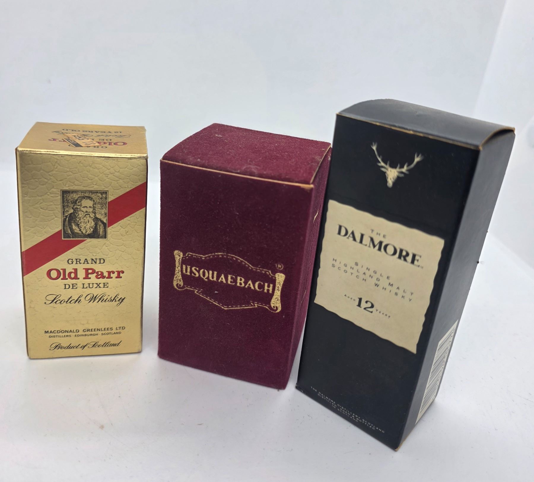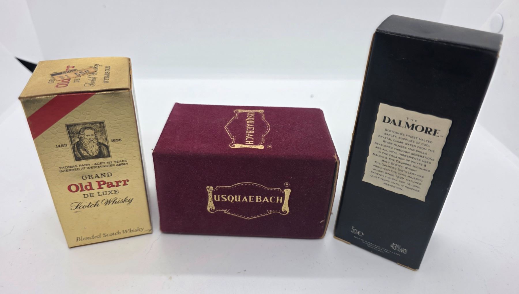 3 Vintage 50ml Scotch Whiskeys in Original Boxes (full) Old Parr, Usquaebach, and Dalmore