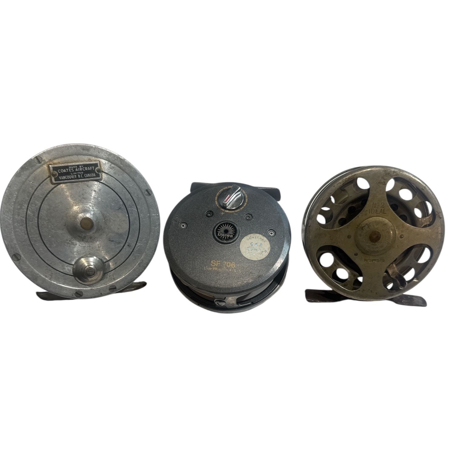 Lot of 3 vintage fly fishing reels including Coates Aircraft, Rochester Reel No 2 Ideal, and Diawa Sf706. Coates Aircraft and Rochester Reel are older models often associated with traditional fly fishing, while Diawa Sf706 reflects a more modern design. Items are as pictured.