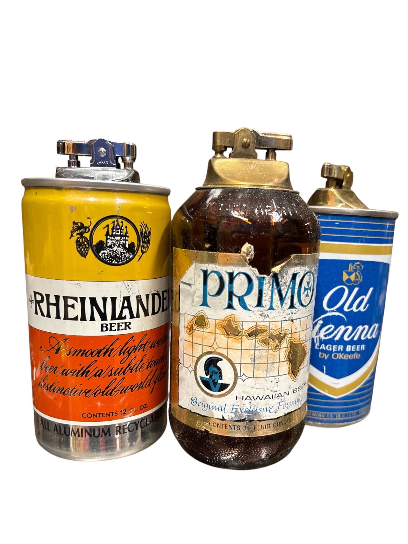 Lot of 3 vintage beer-themed items includes Primo, Rheinlander, and Old Vienna beer cans and bottle lighters. Collectible beer advertising memorabilia. Item is as pictured.