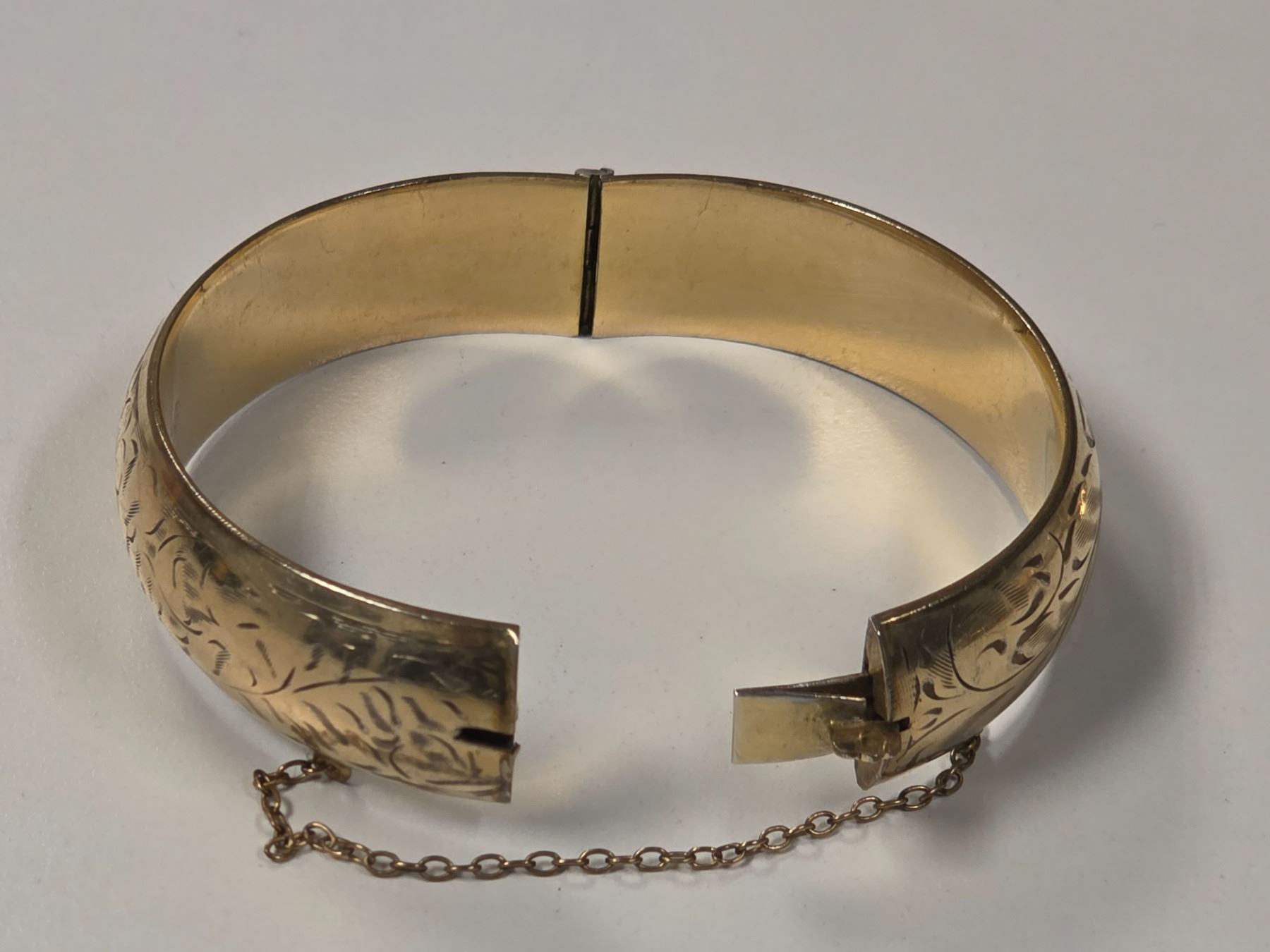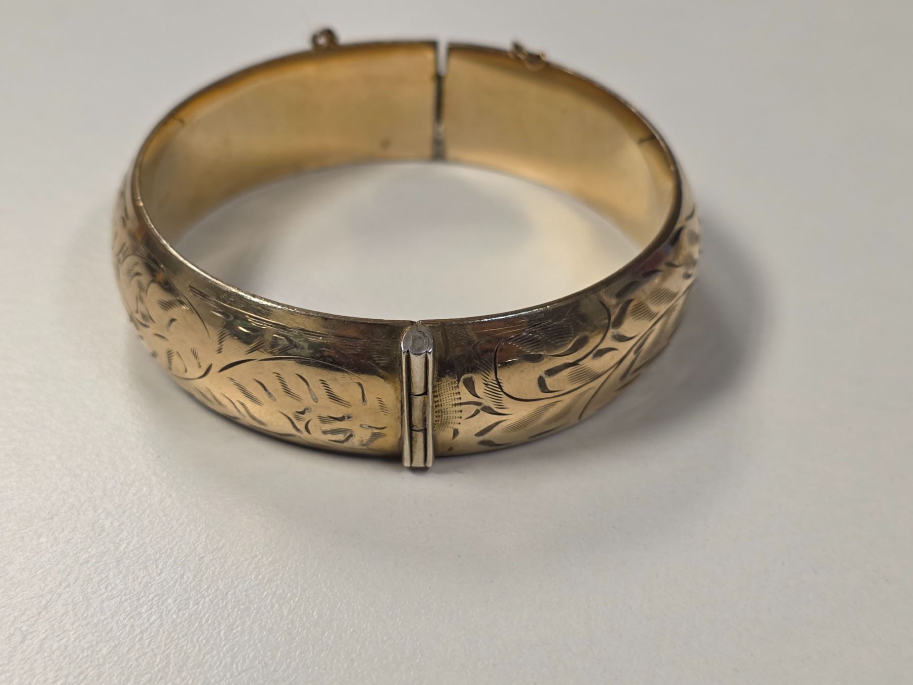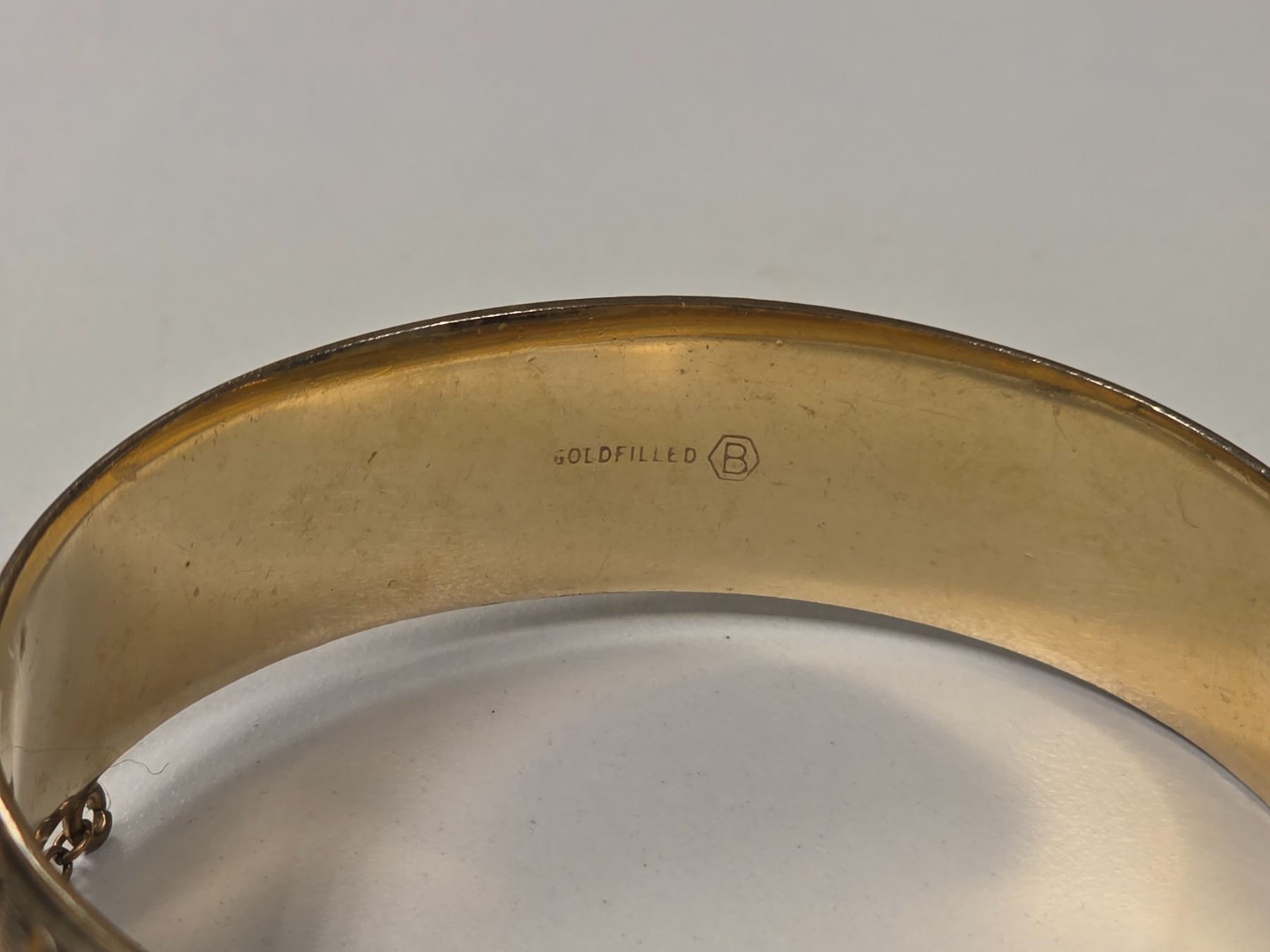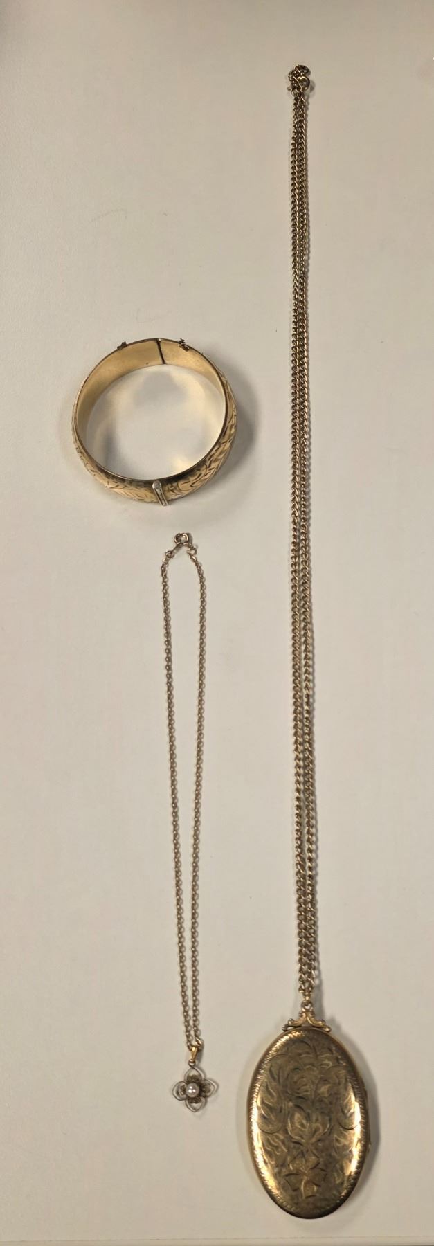 3 Vintage Gold Filled Jewelry Pieces - Hinged Cuff Bracelet, 39 x 60mm Oval Locket, & 13mm Pearl Pendant