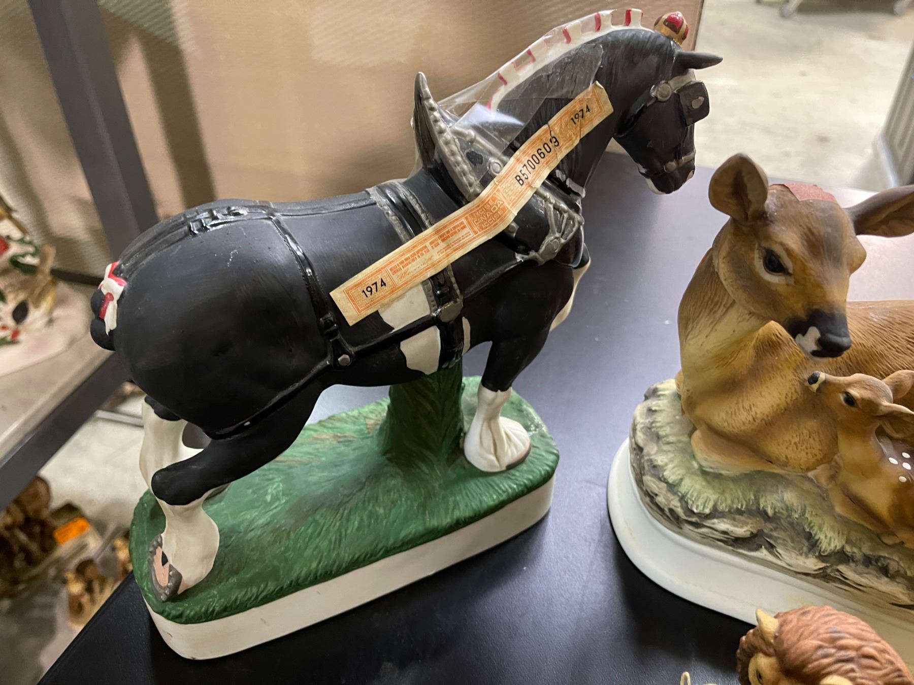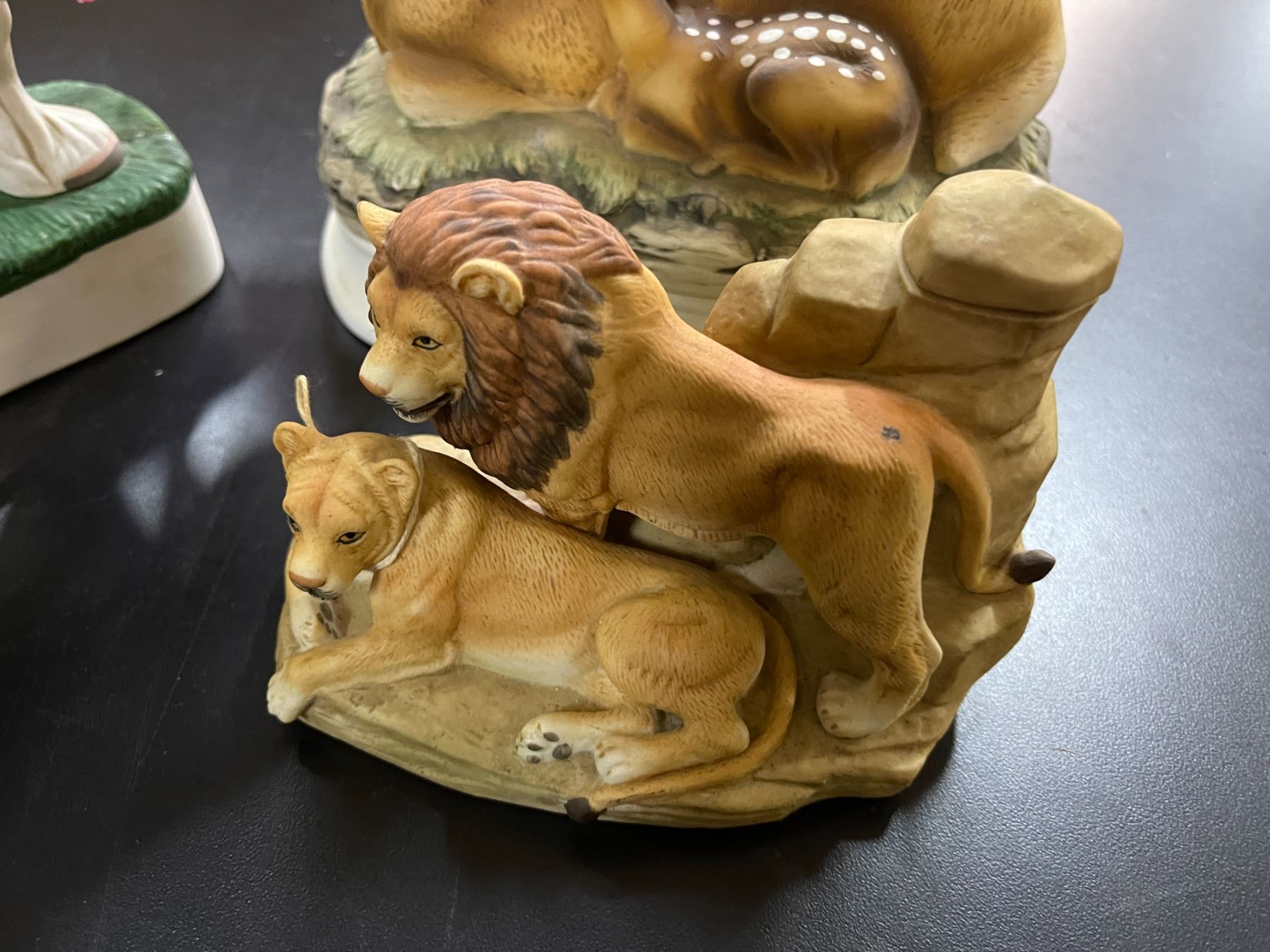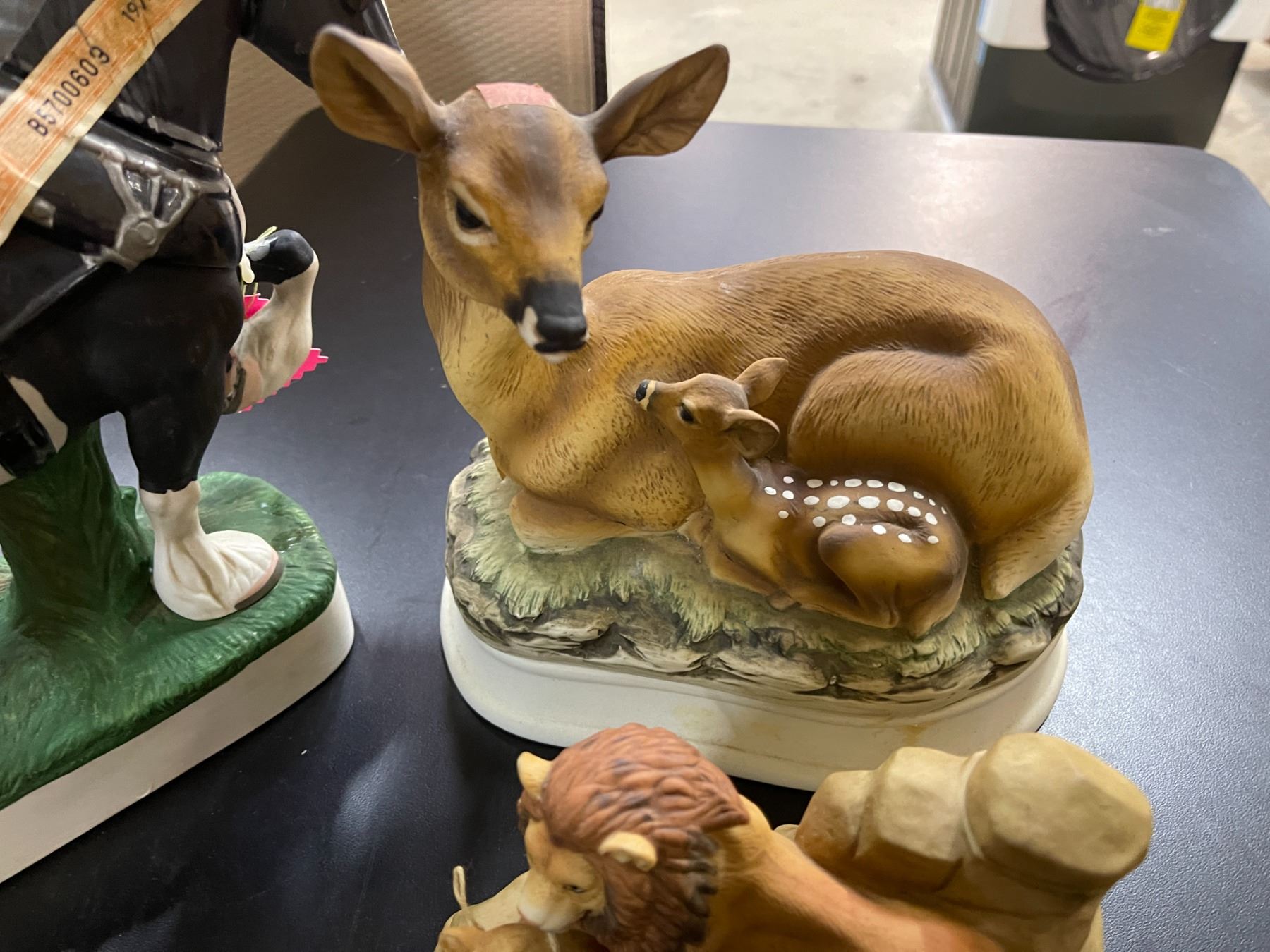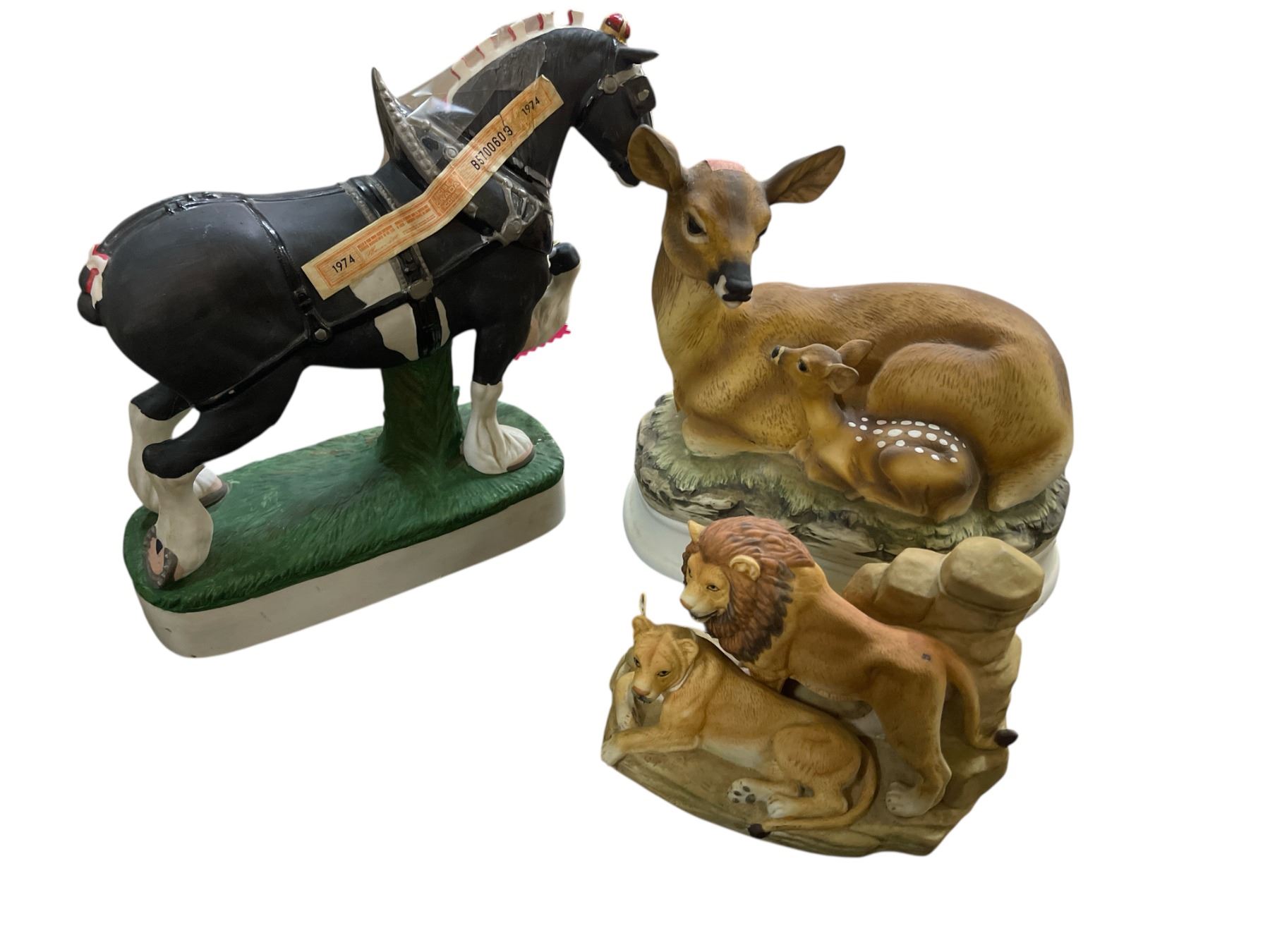 3 Whiskey Empty Decanters: 1978 Potter's Clydesdale, Large Deer & Fawn Decanter Music Box (Aprox 9" tall), and 1987 Ski Country African Lions Mini