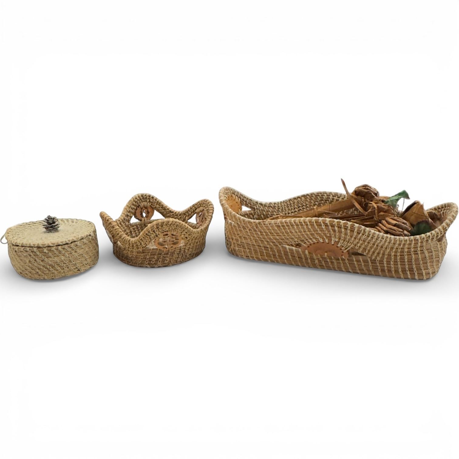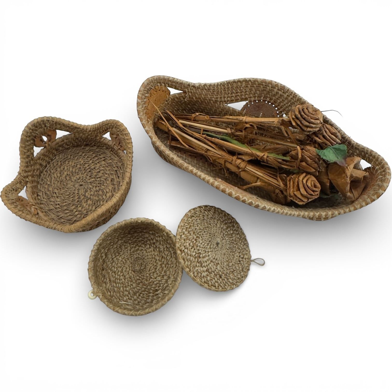 3 Woven Grass Baskets & 8 Cedar Bark Roses (Largest Basket is 6" x 10" x 3")