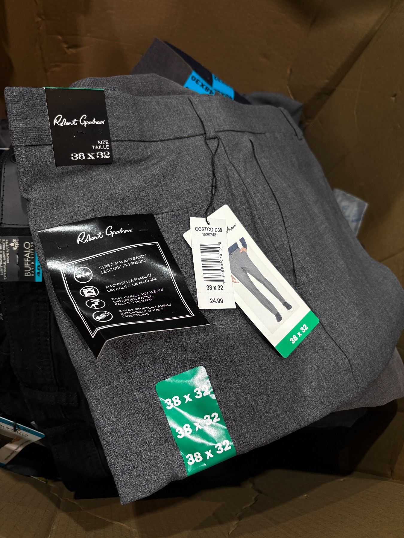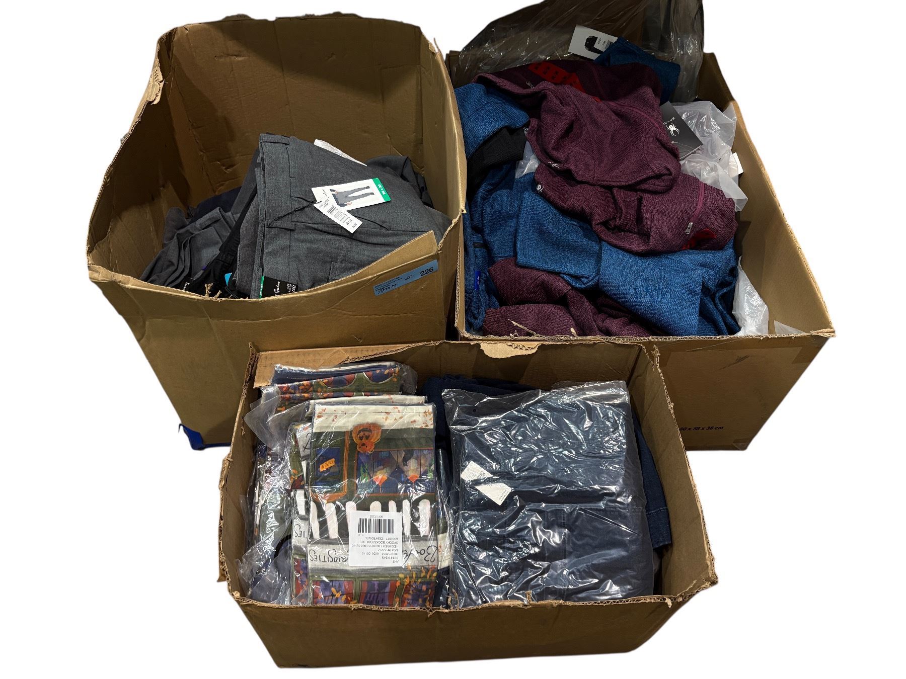 3 boxes of new assorted clothing - Robert Graham trousers, Buffalo jeans, Spyder jackets (assorted sizes)