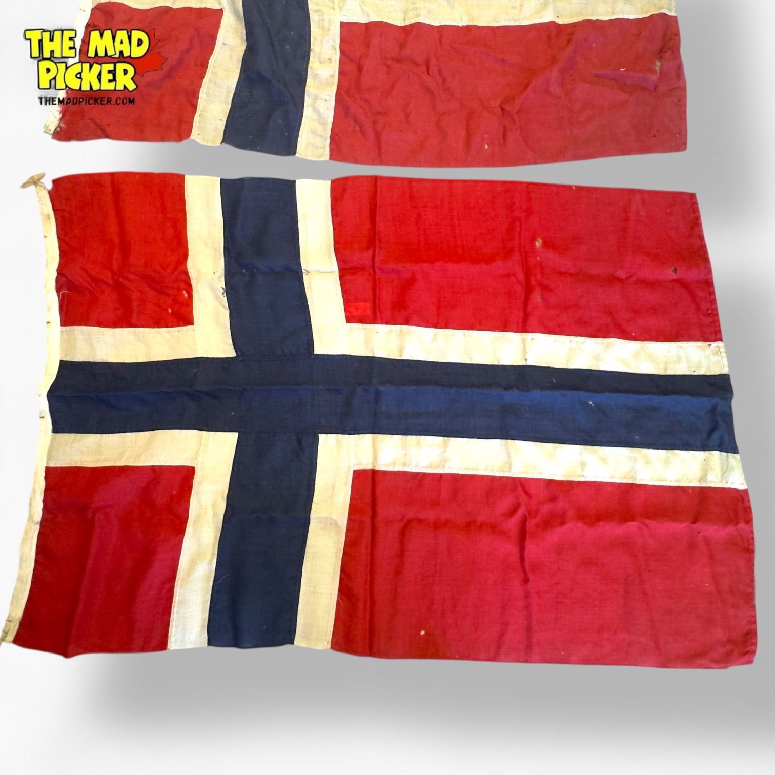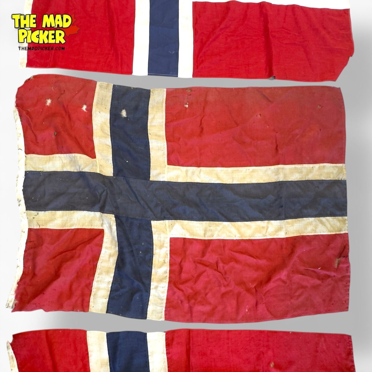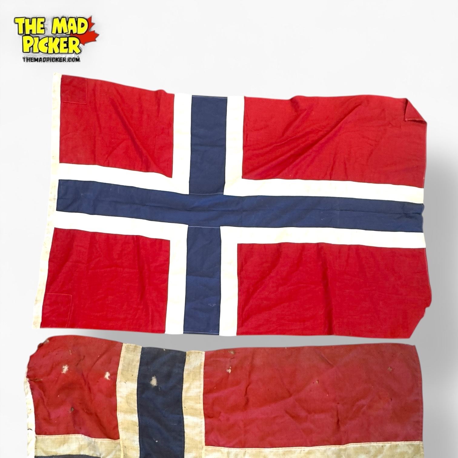 Set of three vintage sewn cloth flags of Norway featuring a red background with a blue and white cross design. Each flag measures approximately 5ft x 3ft. Traditional Nordic flag pattern with evident sewing craftsmanship throughout. Suitable for historical or decorative applications.
