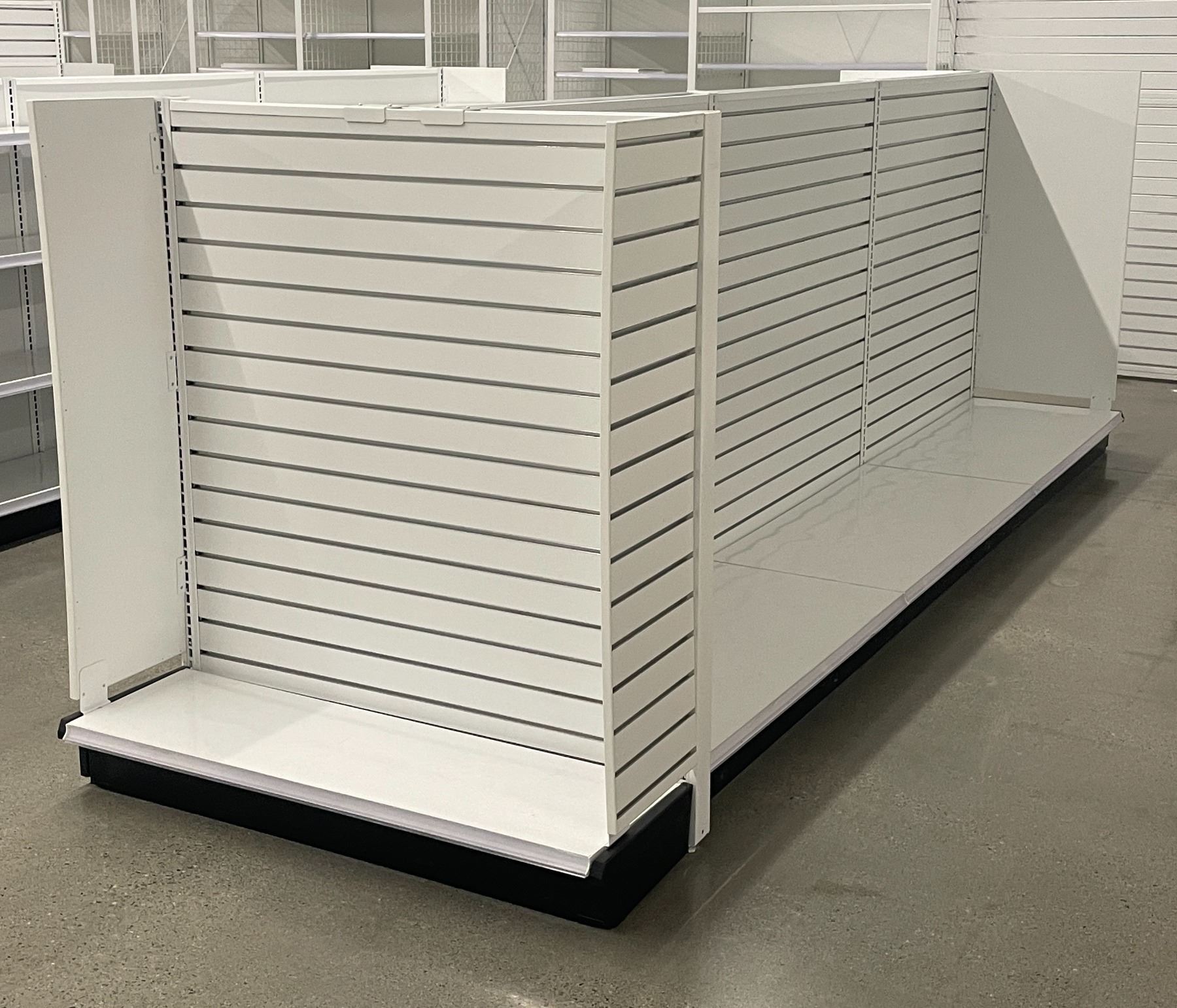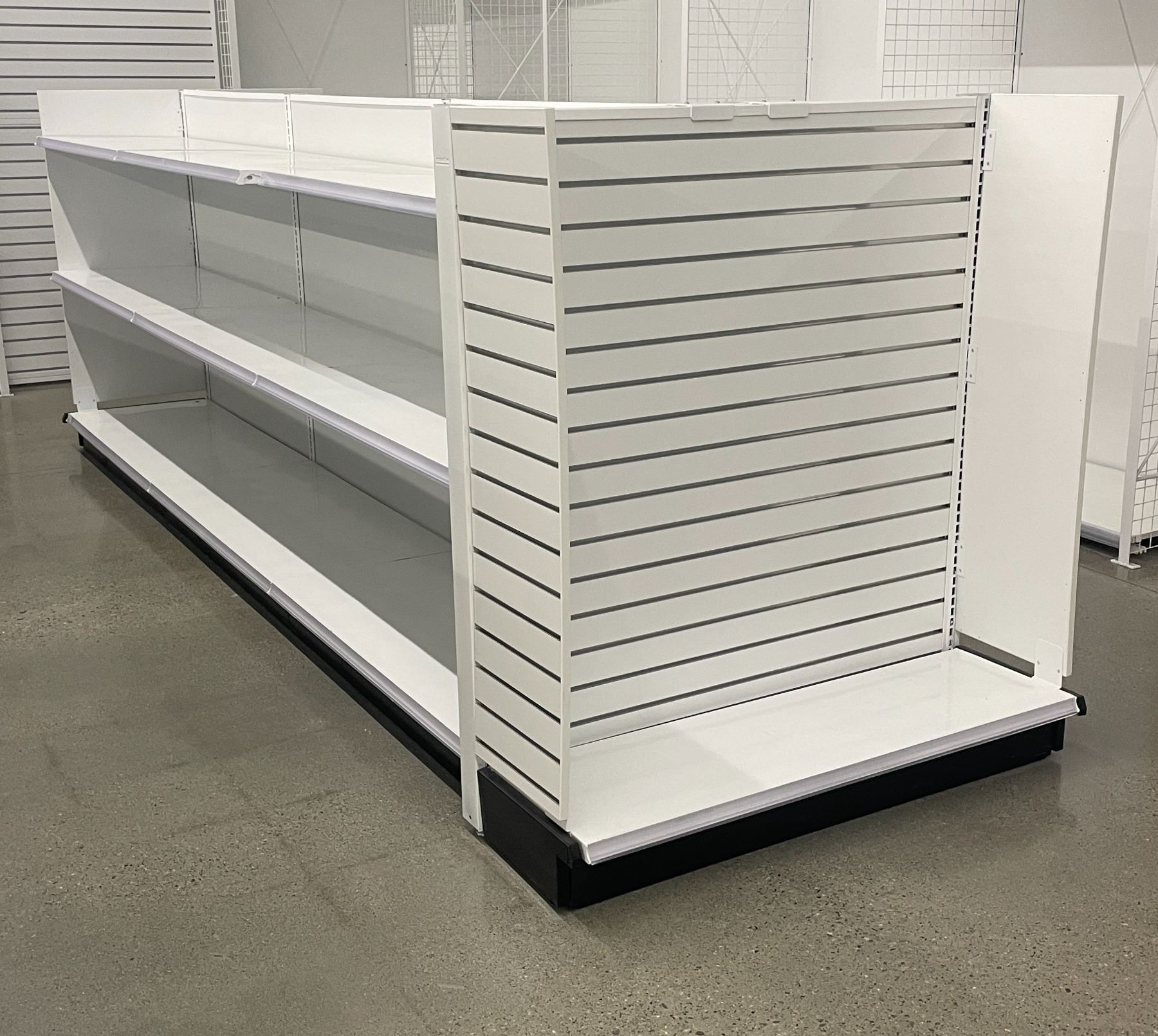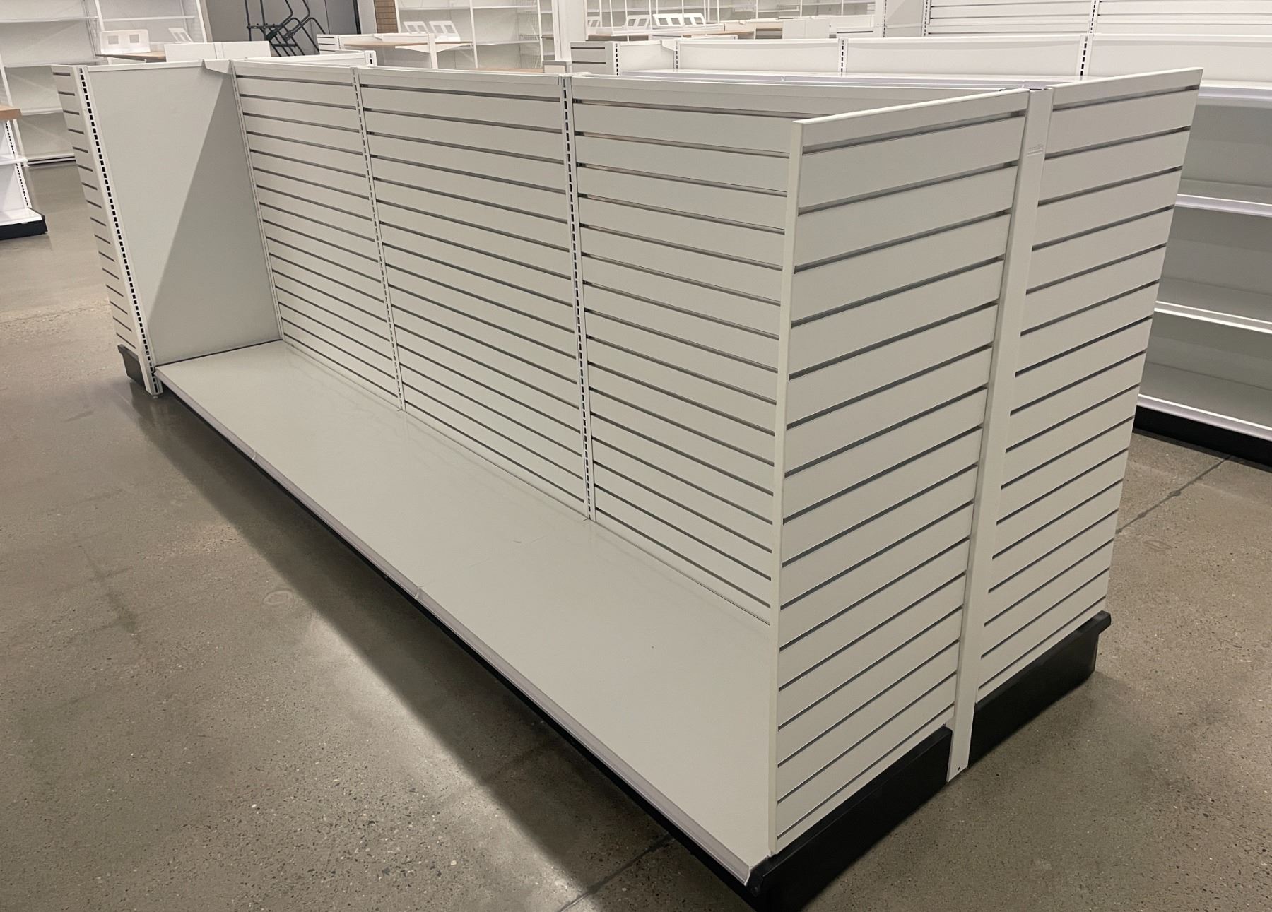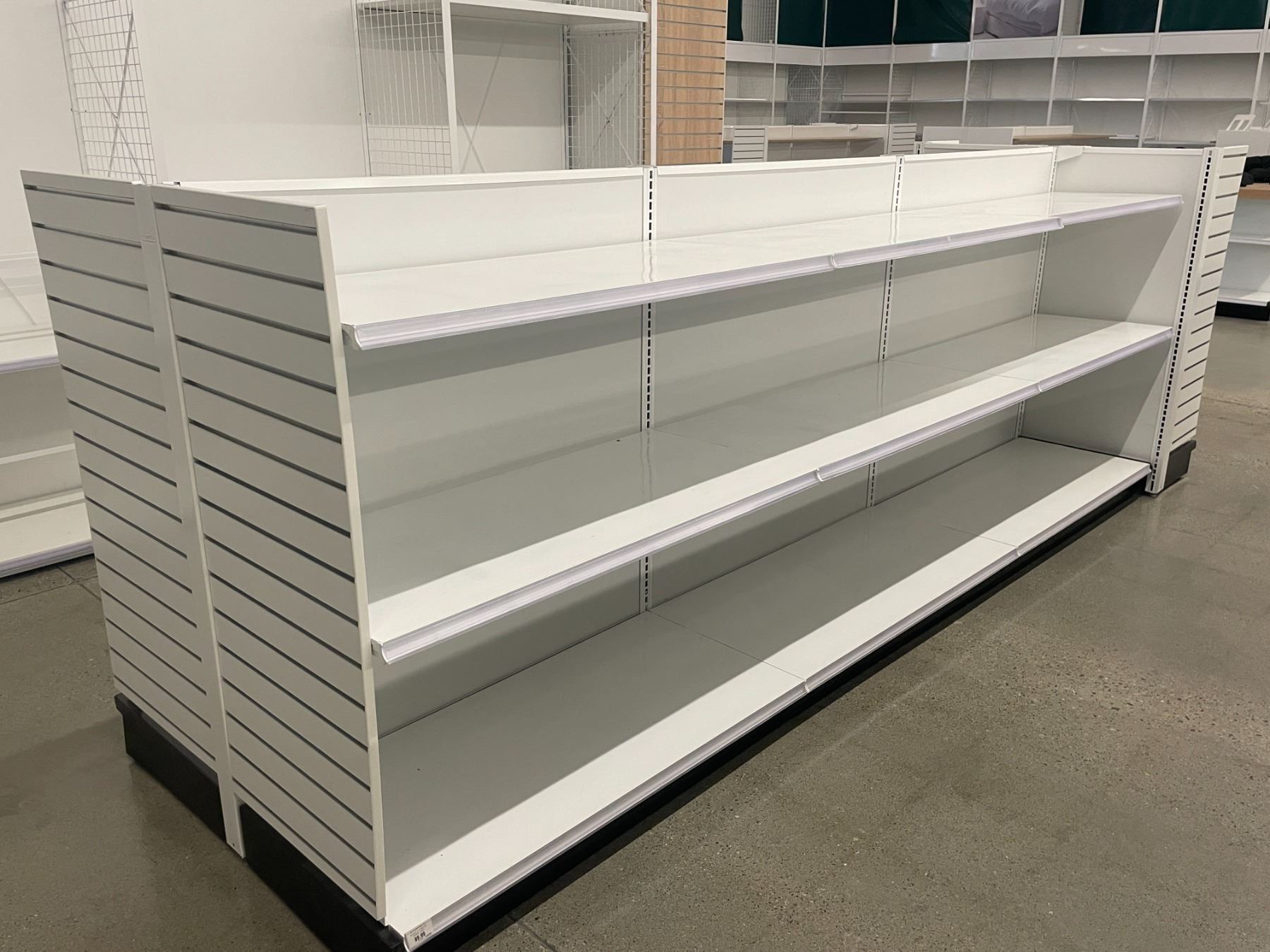 3 tier retail shelving double-sided gondola with single end cap (only one side has shelves - approx. 168in W 55 1/2 H 38in D - excellent condition - Madix brand) BIDDERS ARE RESPONSIBLE FOR ALL COSTS ASSOCIATED WITH PICKUP OF THEIR LOTS INCLUDING BUT NOT LIMITED TO RENTAL OF EQUIPMENT, FORKLIFTS, LABOUR, TRUCKING, TOOLS ETC.