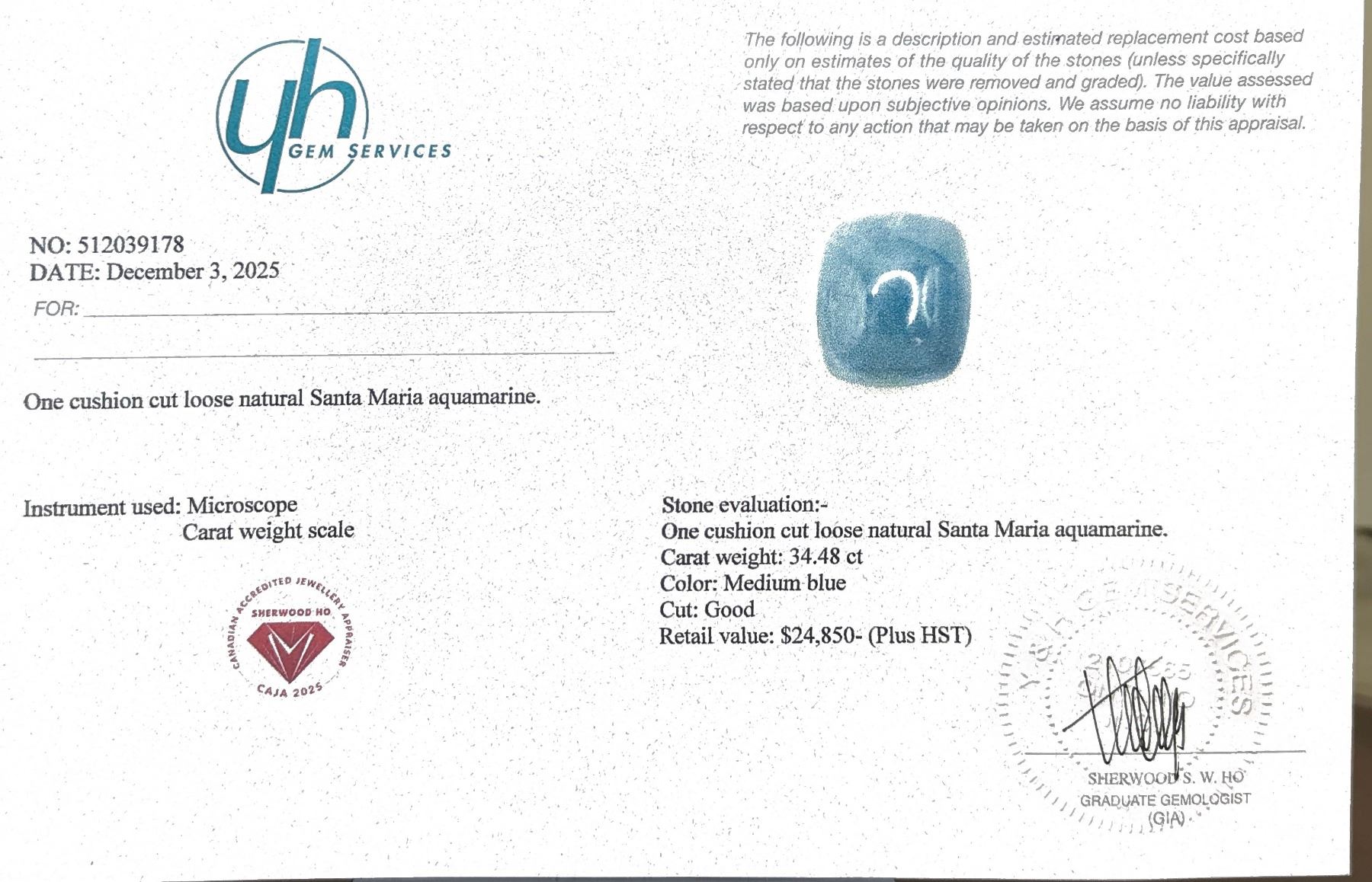 34.48 ct Certified Santa Maria Aquamarine gemstone ($24,850 Appraisal)