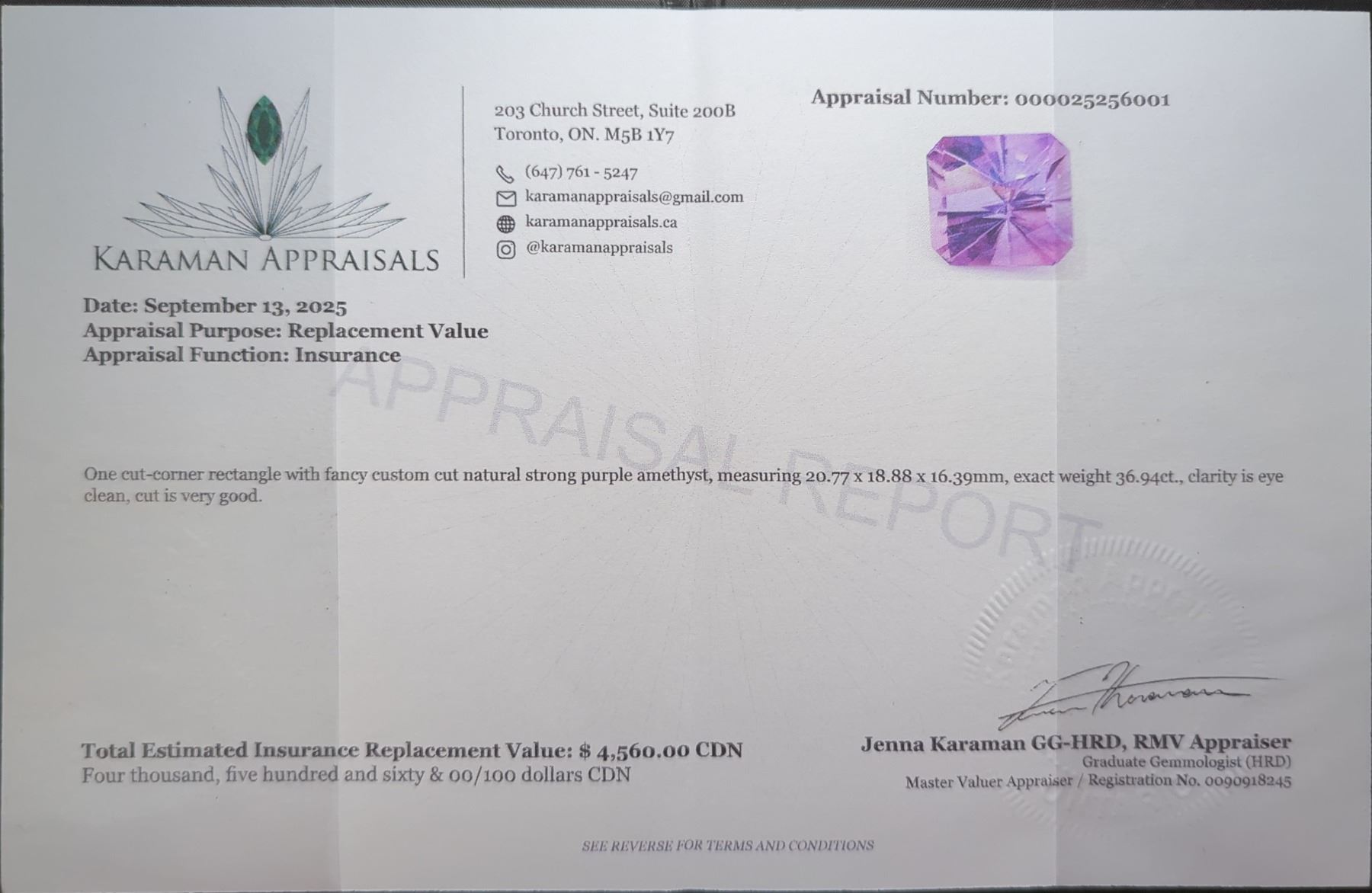 36.94 ct Authenticated Purple Amethyst gemstone ($4,560 Appraisal)
