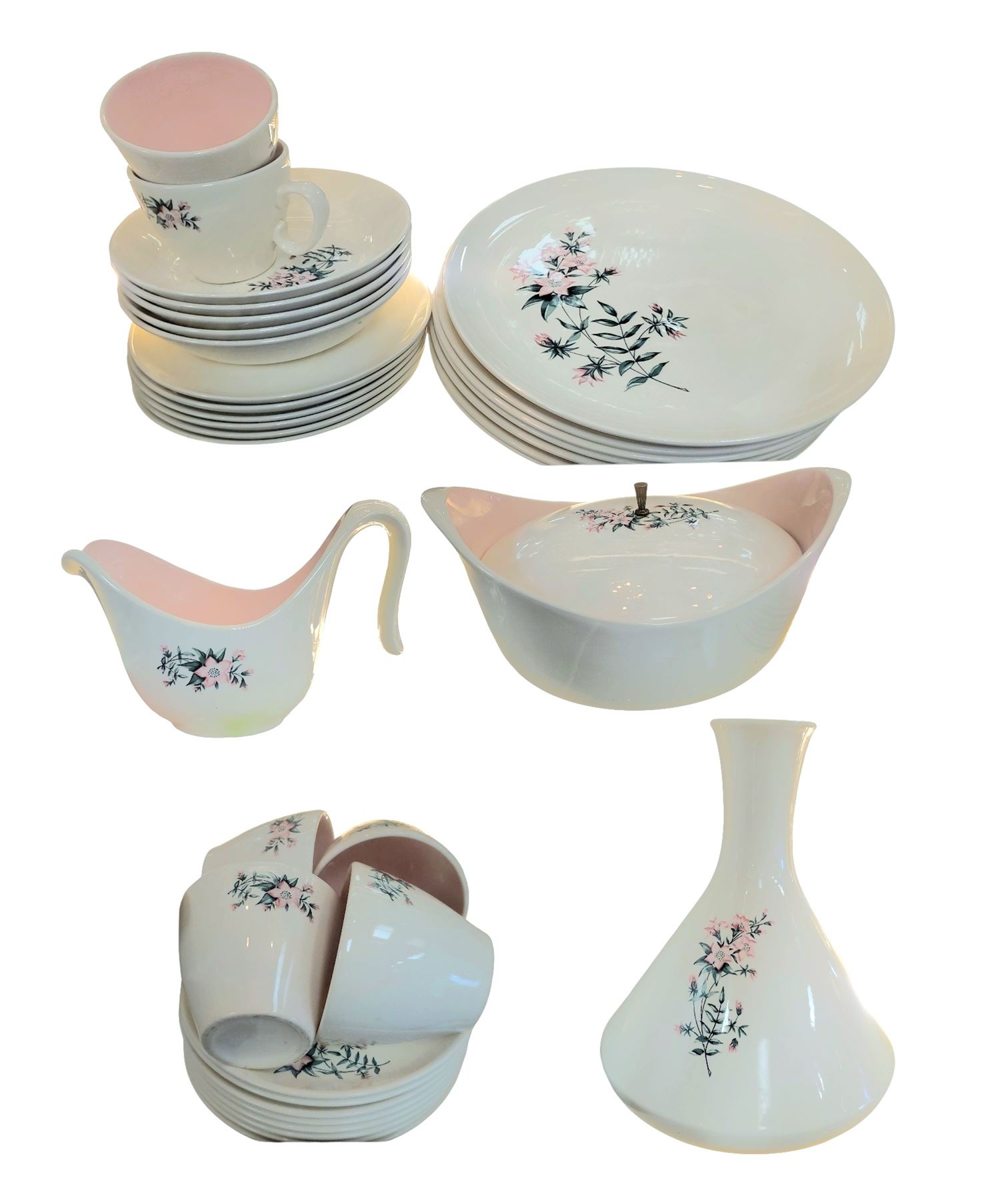 36 piece dinnerware set made in Japan, typical of the patterns sold at Woodward's stores during the 1970s and 1980s. Includes plates, bowls, cups, and saucers. Decorative designs reflect popular styles from the era. Item is as pictured.