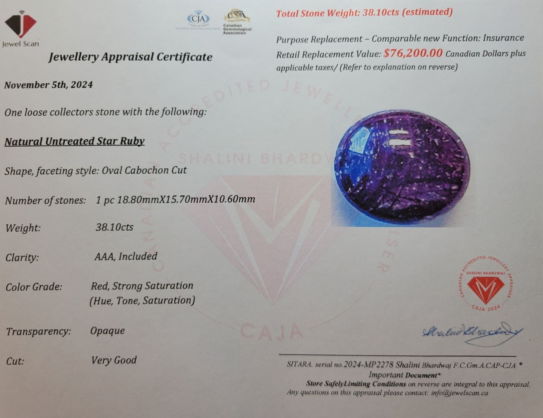 38.1 ct Certified Burmese Star Ruby gemstone ($76,200 Appraisal)
