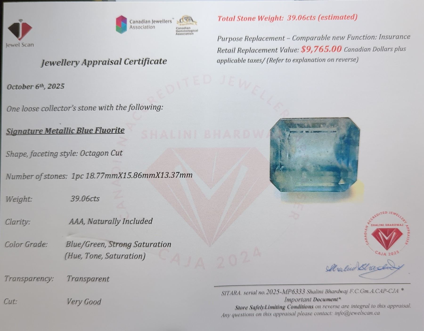 39.06 ct Certified Metallic Blue Fluorite gemstone ($9,765 Appraisal)