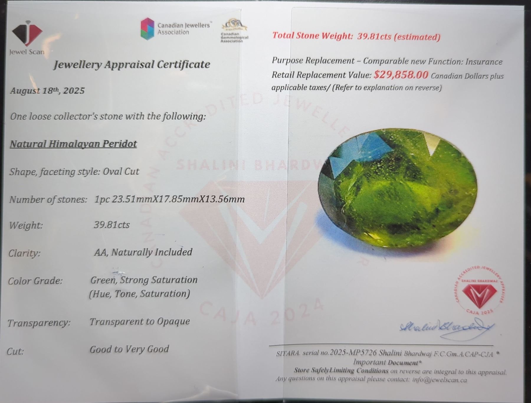 39.81 ct Authenticated Himalayan Peridot gemstone ($29,858 Appraisal)