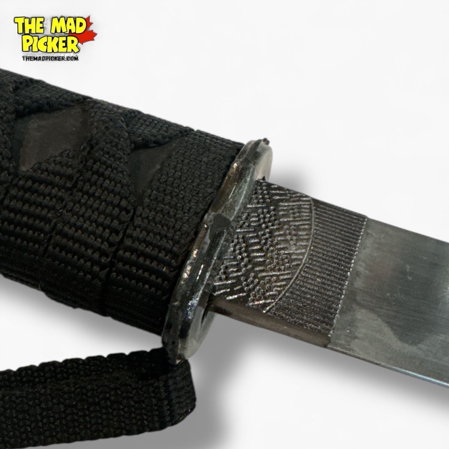 39-inch ninja-style movie prop katana featuring a medium-length blade. Designed with a black handle and scabbard for aesthetic consistency. This prop is non-functional and intended for display or cosplay purposes. Ideal for reproduction use in film or theatrical productions.