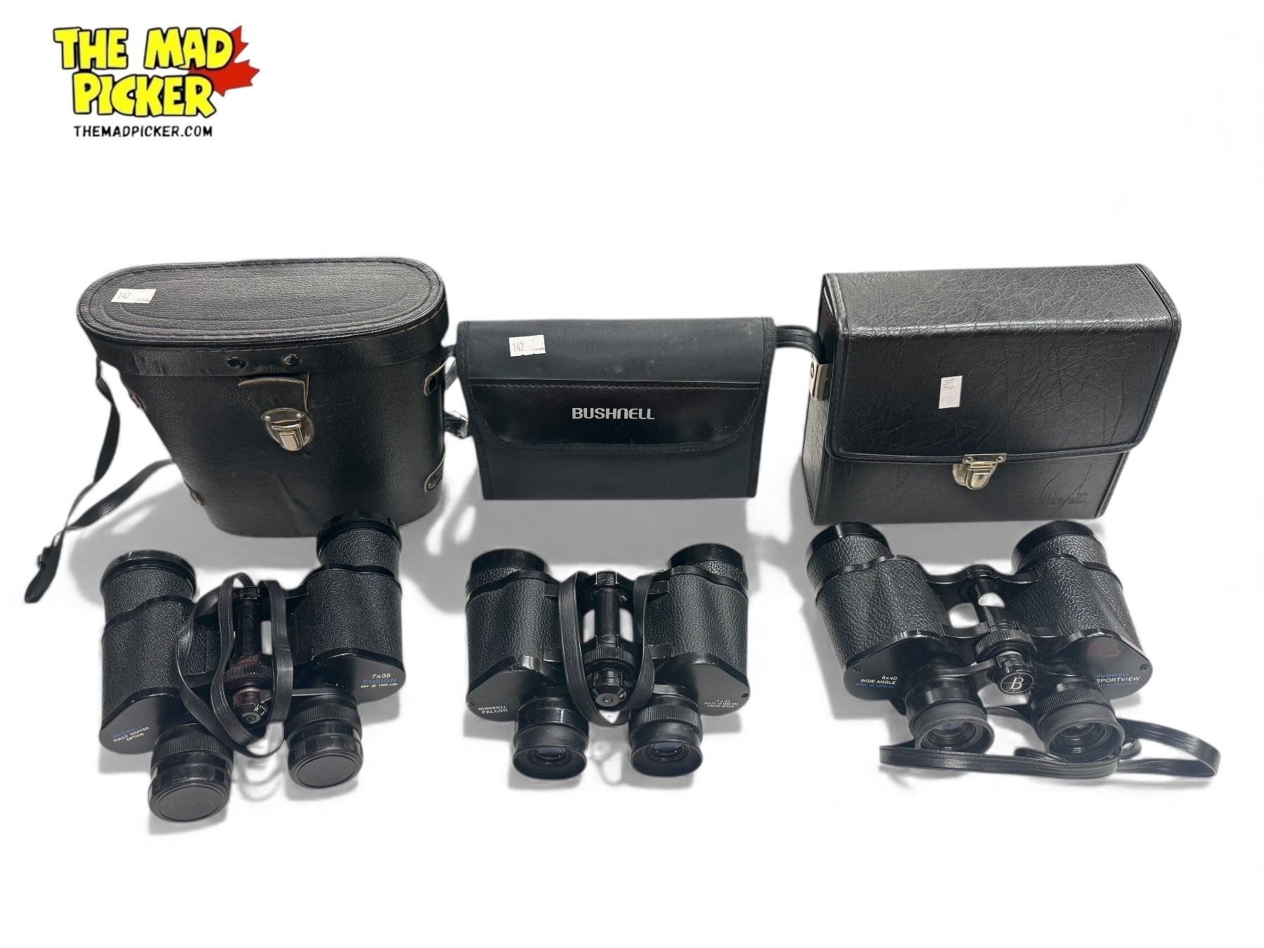 3x Bushnell Binoculars: Falcon 7 x 35, Sportview 8 x 40, & Ensign 7 x 35"
