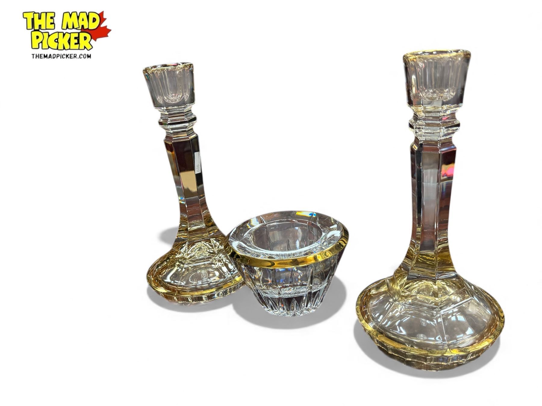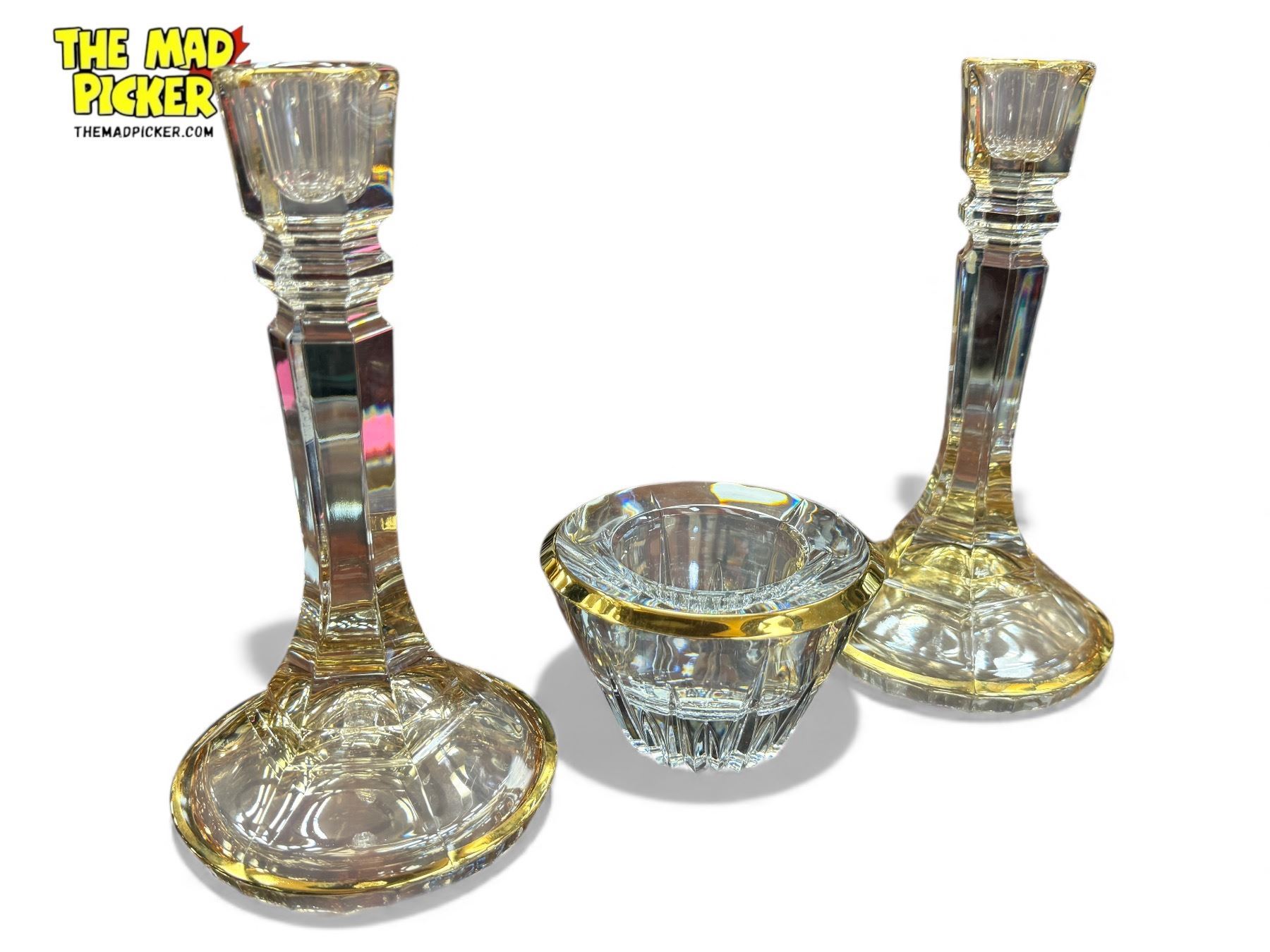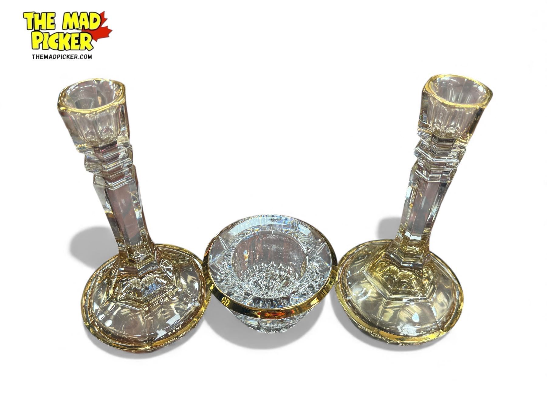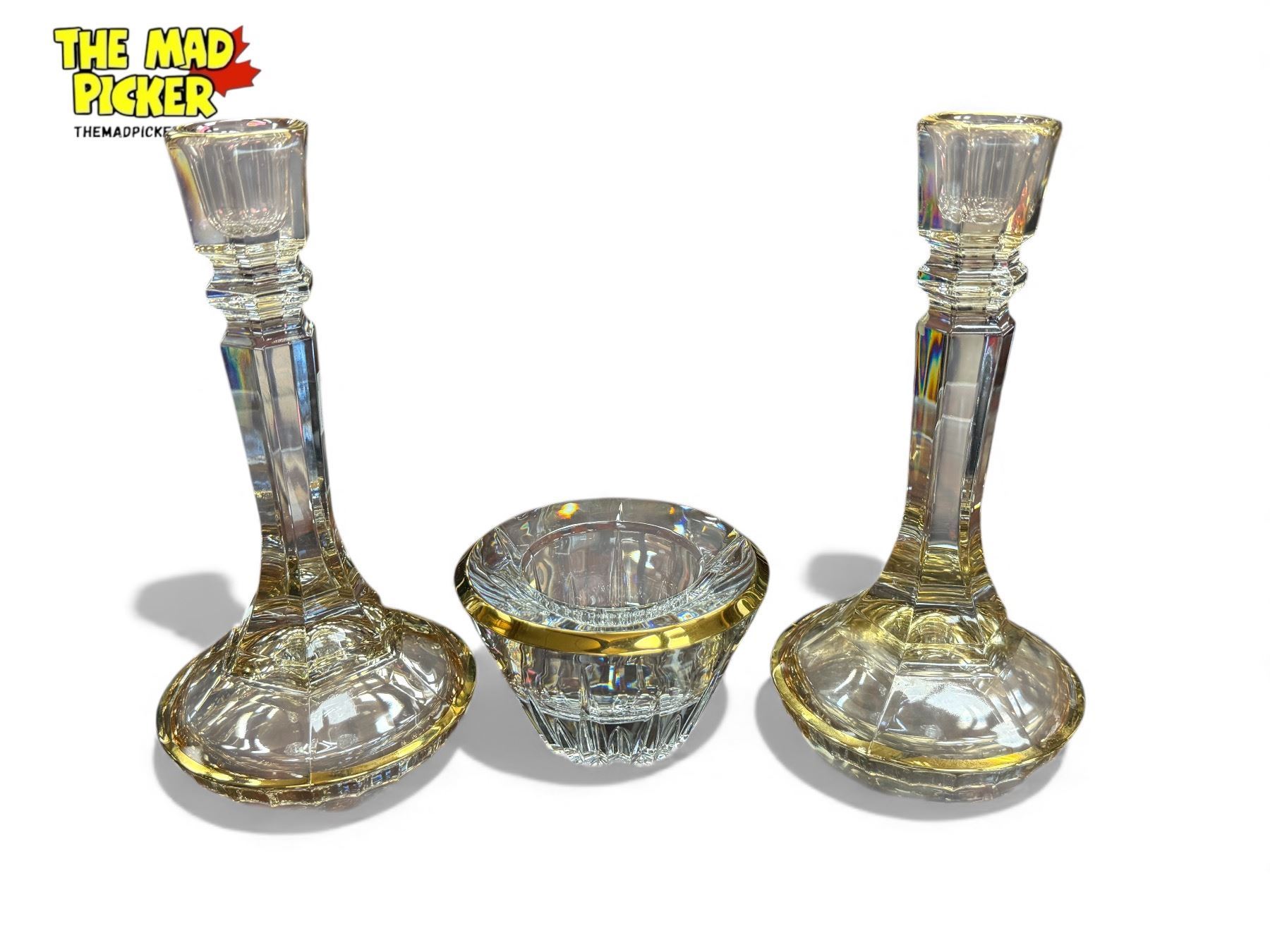 3x Gold Rimmed Glass Collectibles: Candle Stick Holders & Bowl