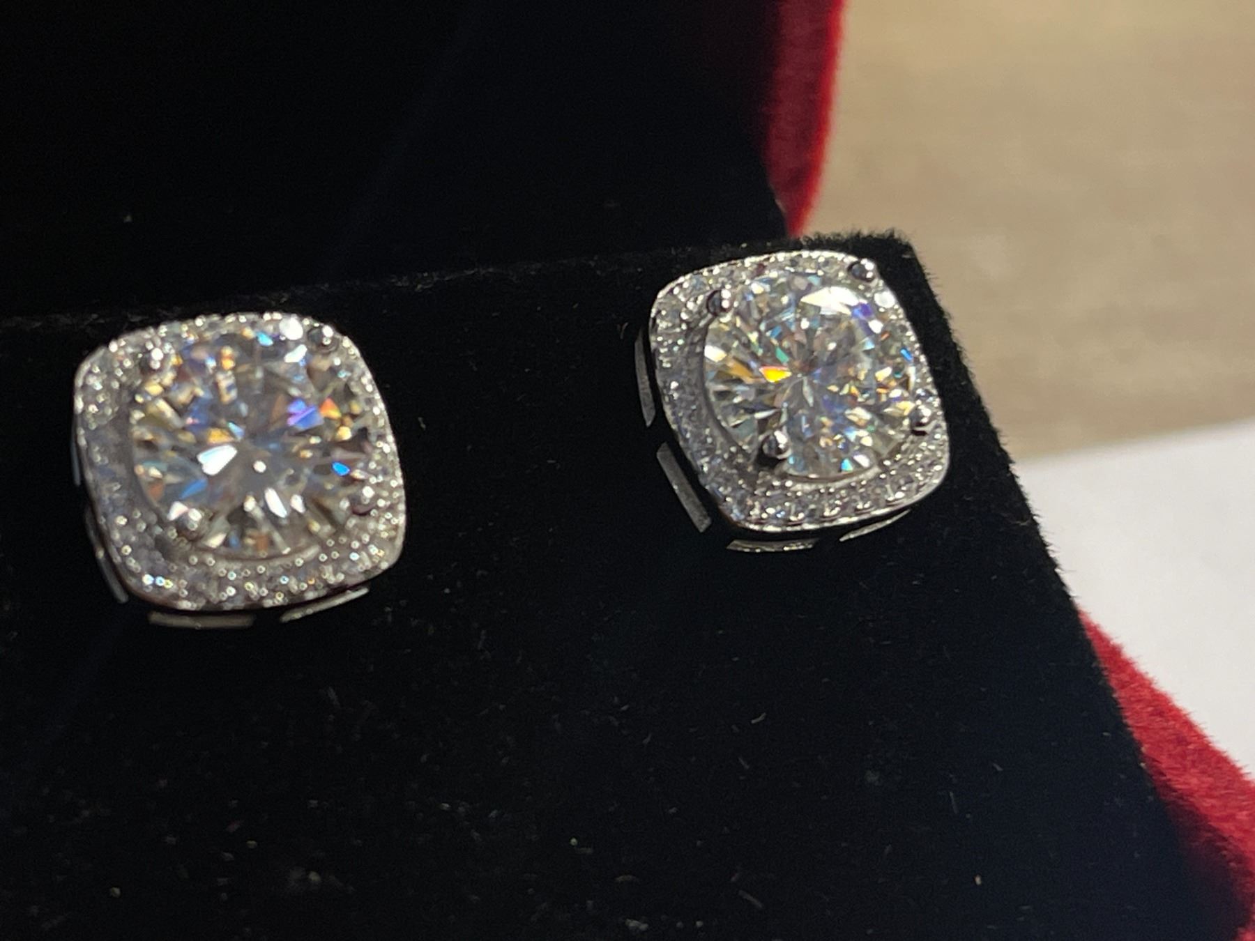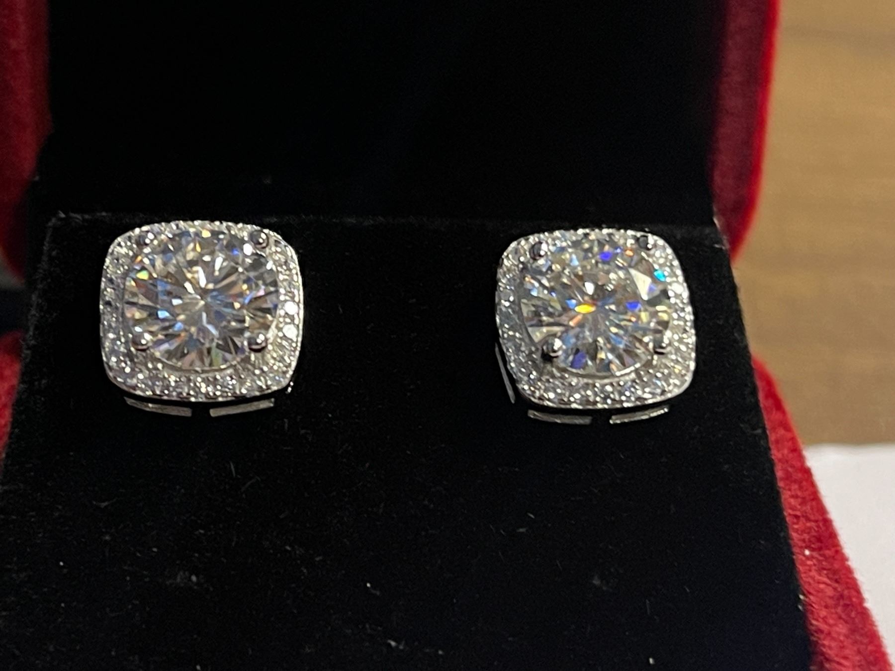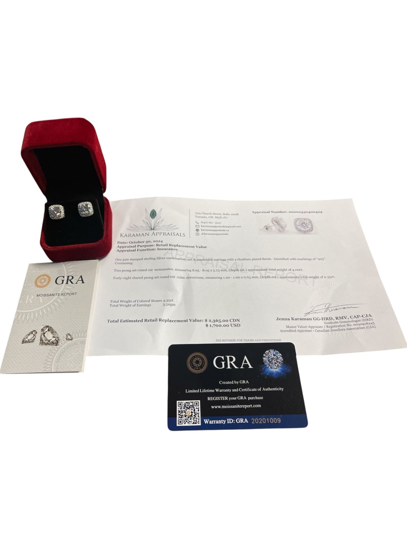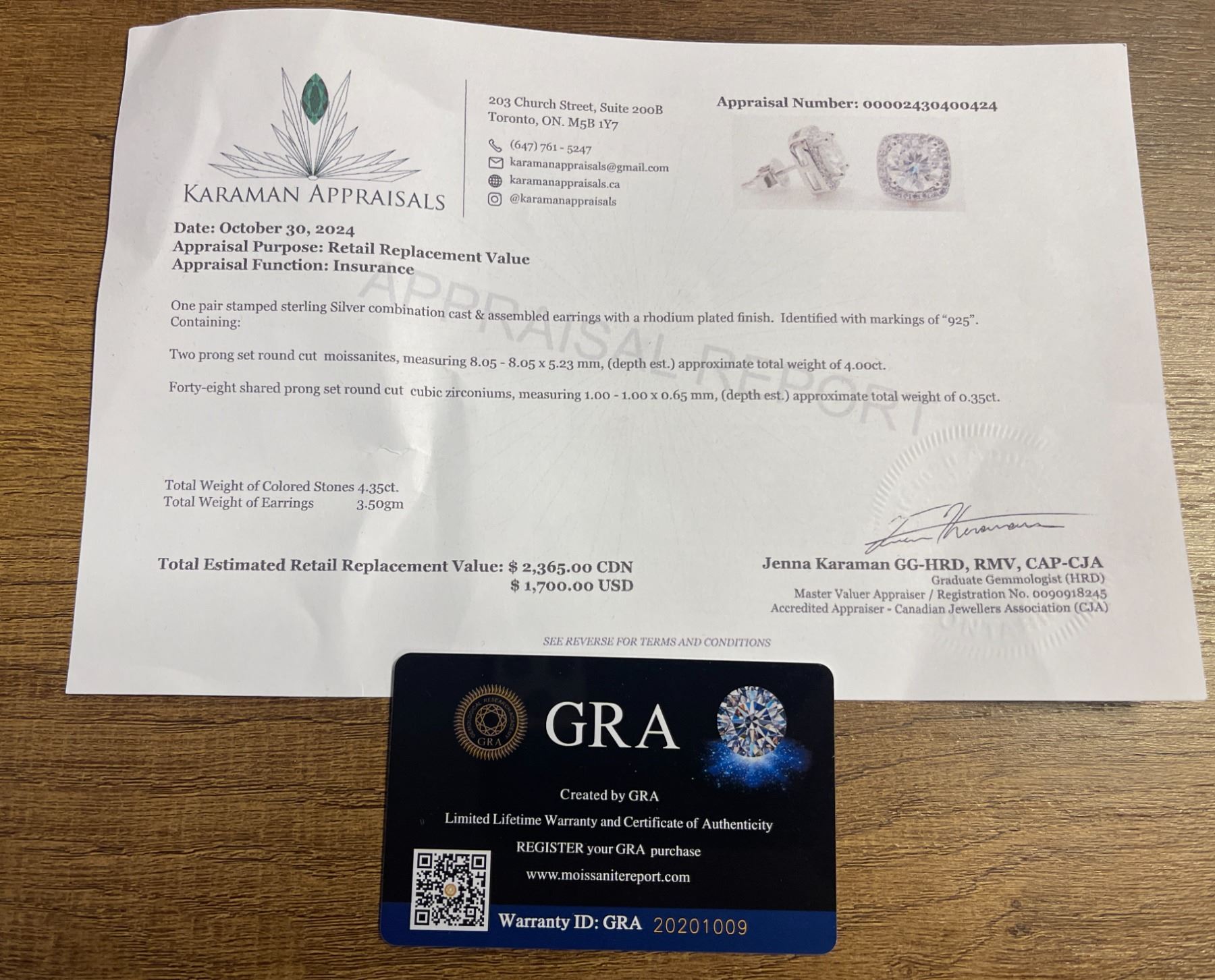 4.00 CT TW GRA CERTIFIED ROUND BRILLIANT CUT MOISSANITE STONE VVS D COLOR WITH 48 ROUND BRILLIANT CUT CUBIC ZIRCONIA SET IN SQUARE HALO SET IN 925 SILVER EARRINGS RETAIL VALUE $2,365.00