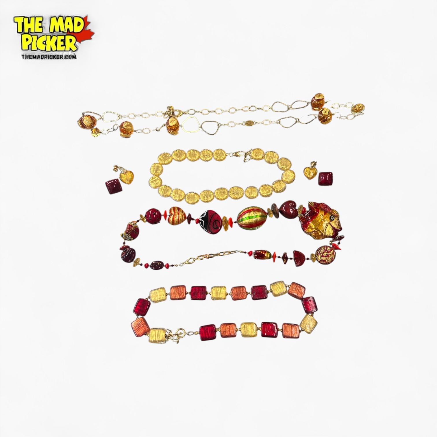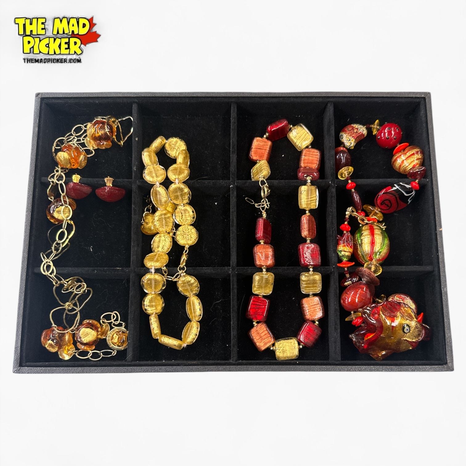 4 Art Glass Necklaces with 1 Pair of Clip On & 1 Pair of Pierced Earrings (The chain and gold fleck necklace is signed Antica Murrina). Display tray is not included.