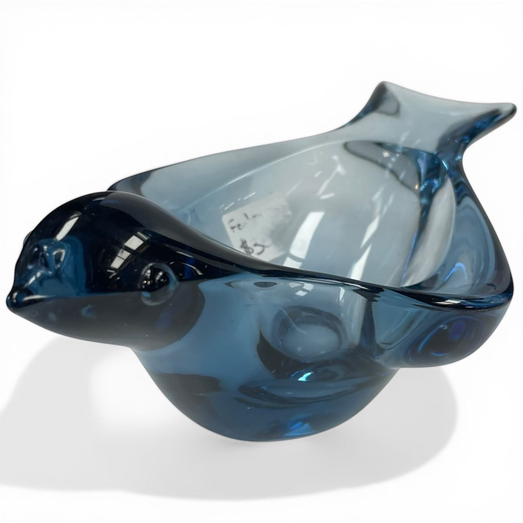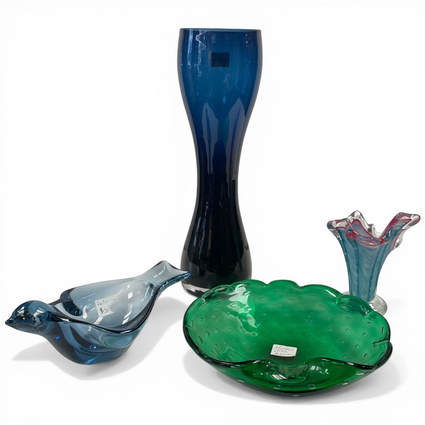 4 Art Glass Pieces: Bullicante Plate, Fenton Blue Bird, Murano Style Vase & 13" Tall Blue Glass Vase