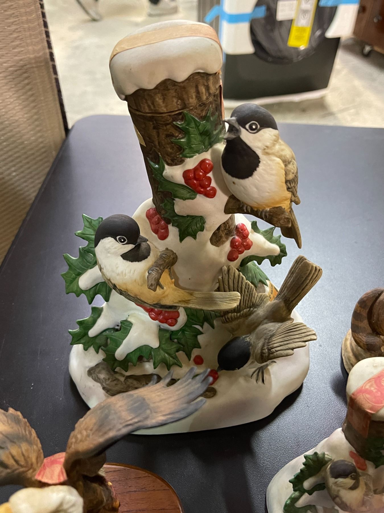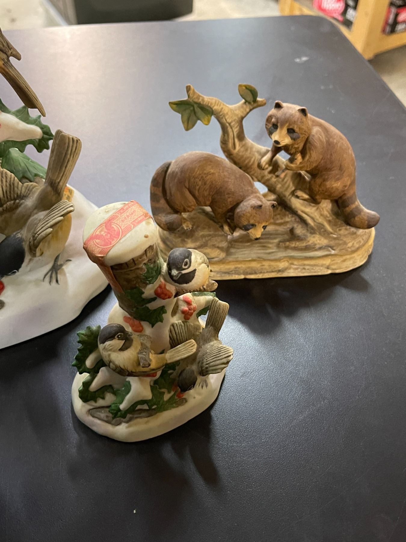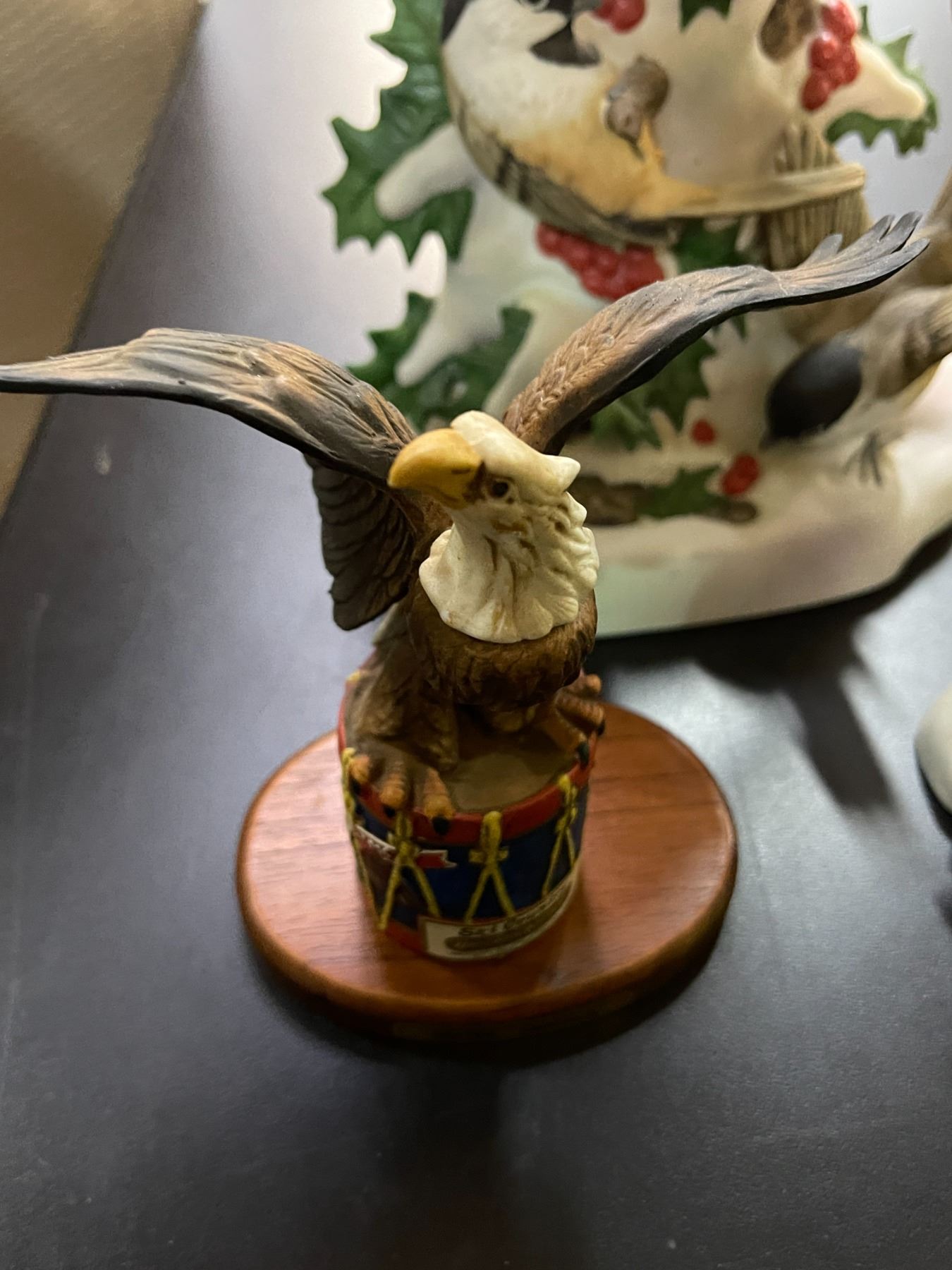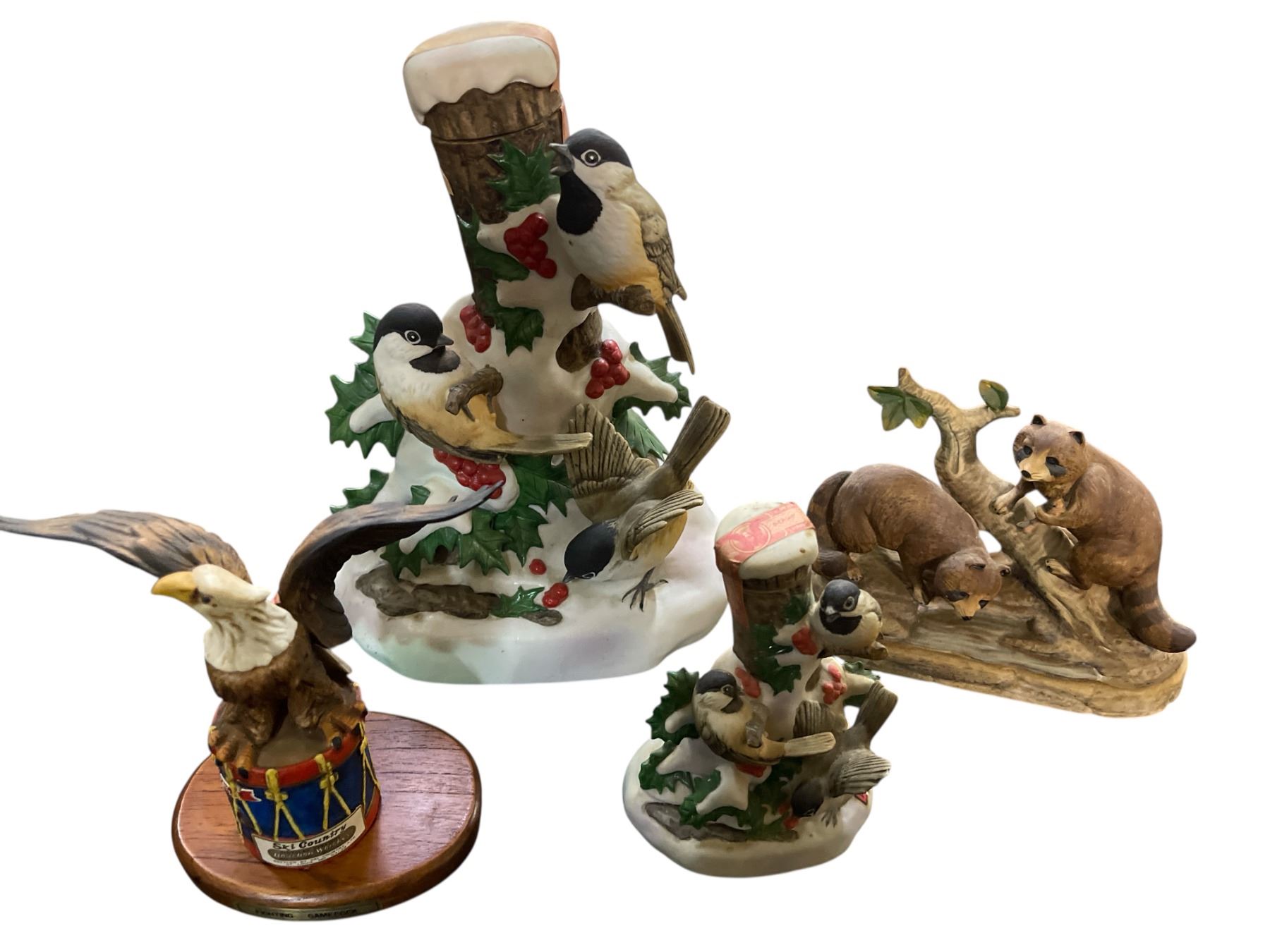 4 Empty Liquor Decanters - 1981 Ski-Country Limited Edition "Chickadee Mini" & "Chickadee", 1973 "Raccoon" No. 220/1200 Mini, "Drum Eagle" Golden Colorado