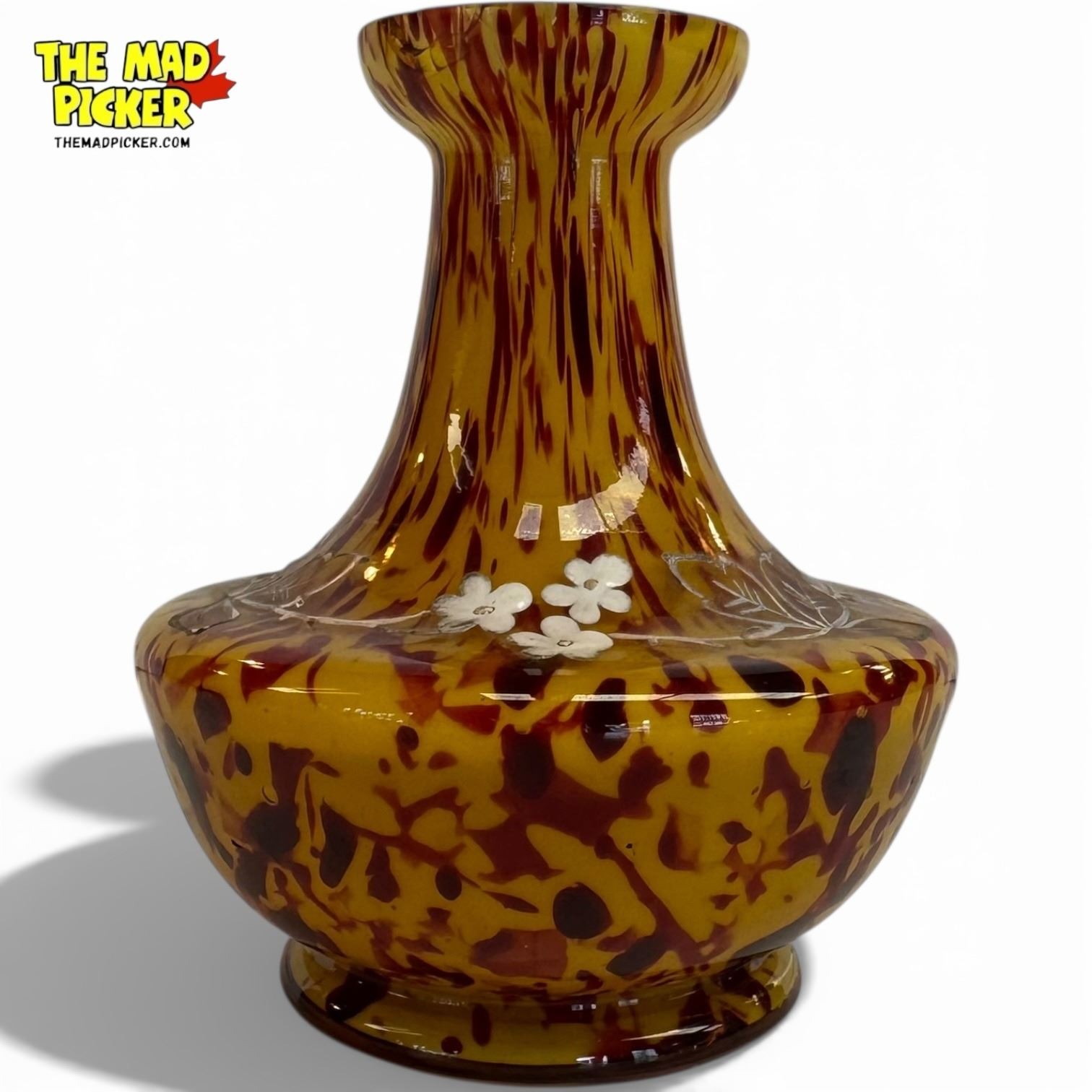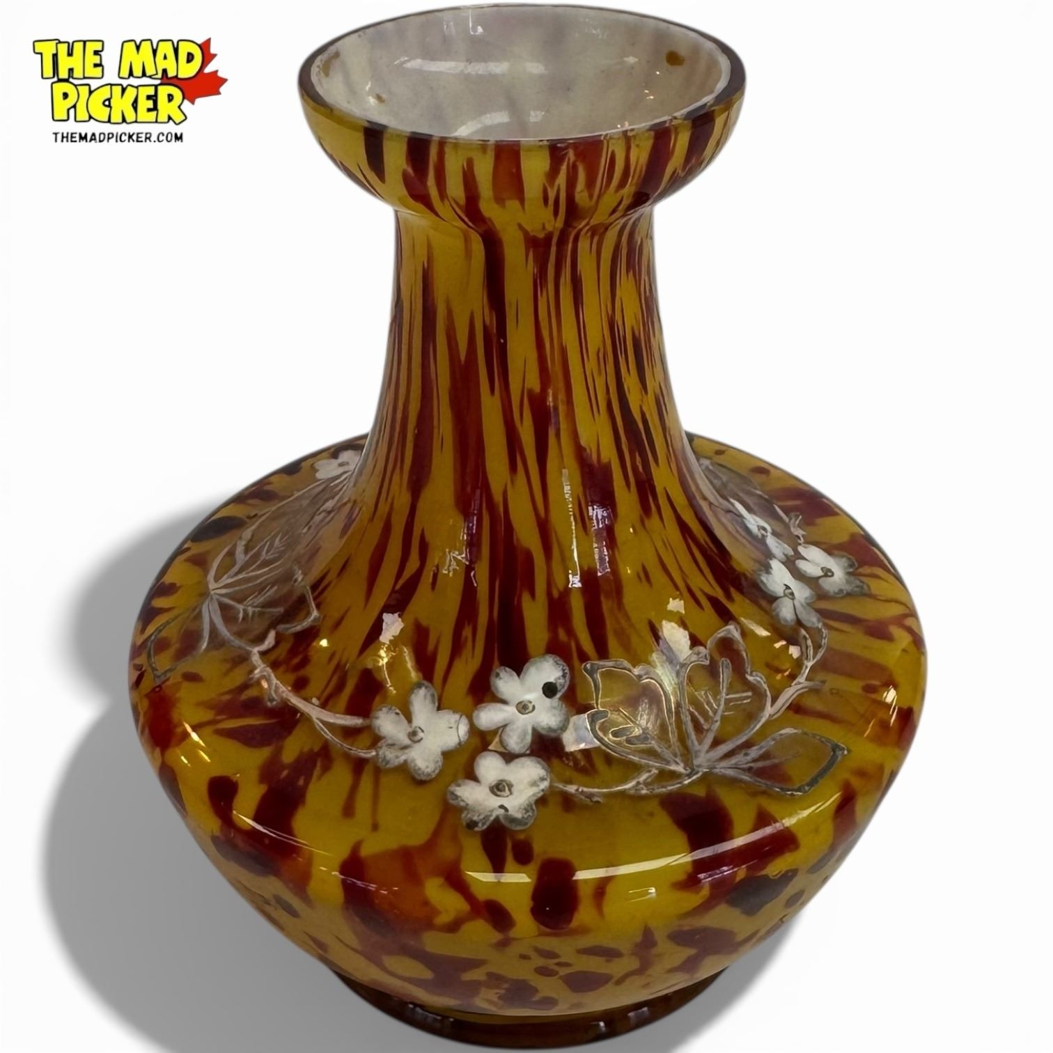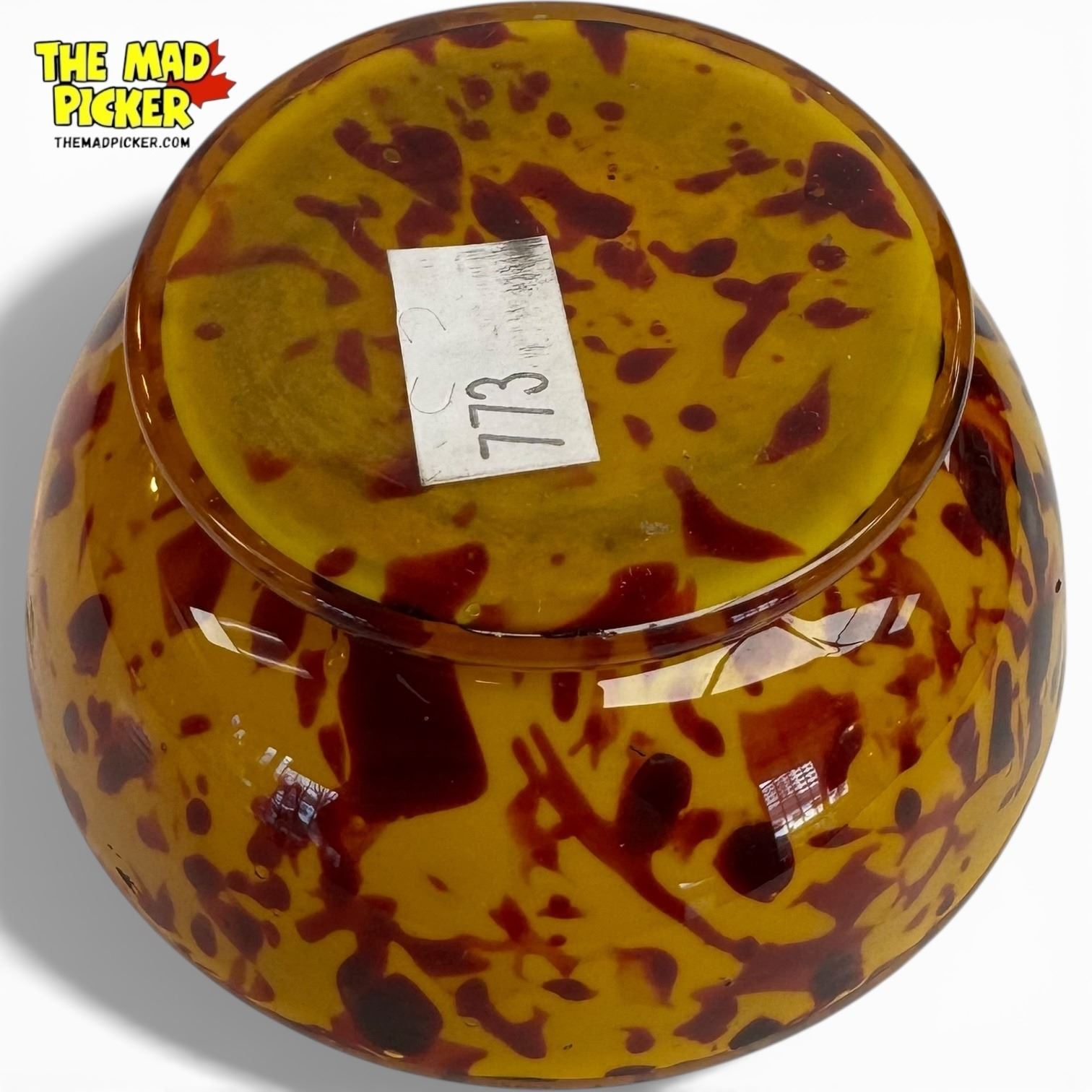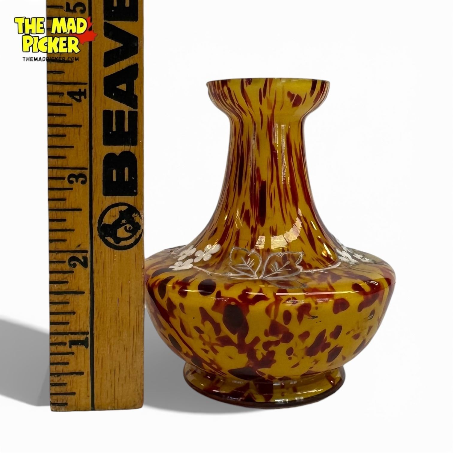 4-inch Bohemian art glass vase in the Franz Welz style, crafted in the Czech Republic during the 1920s Art Deco period. Features hand-blown glass with hand-painted ox blood red and golden yellow spatter pattern. Design includes a bulbous base, narrow neck, and outward taper. Unsigned, characteristic of Welz glass.