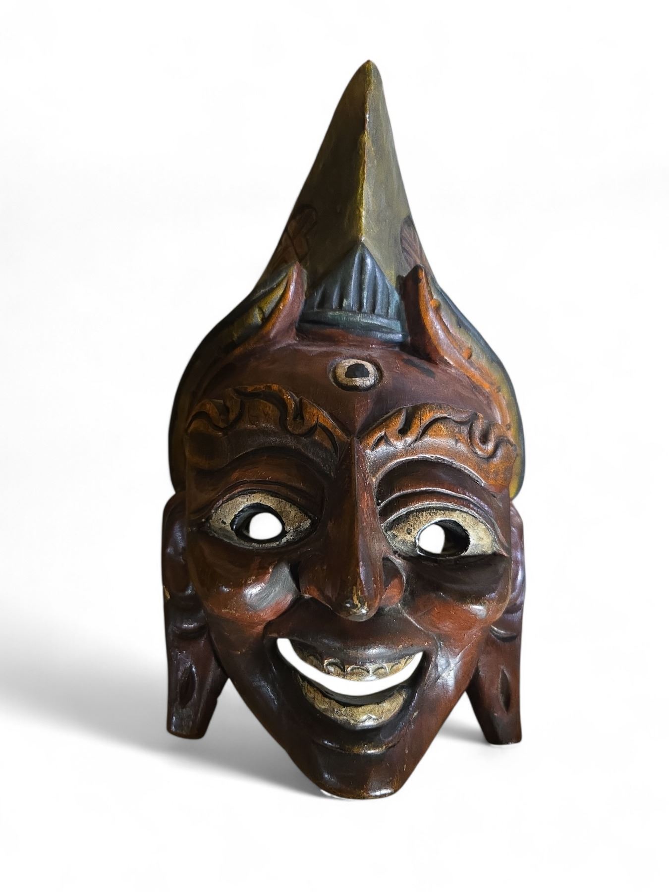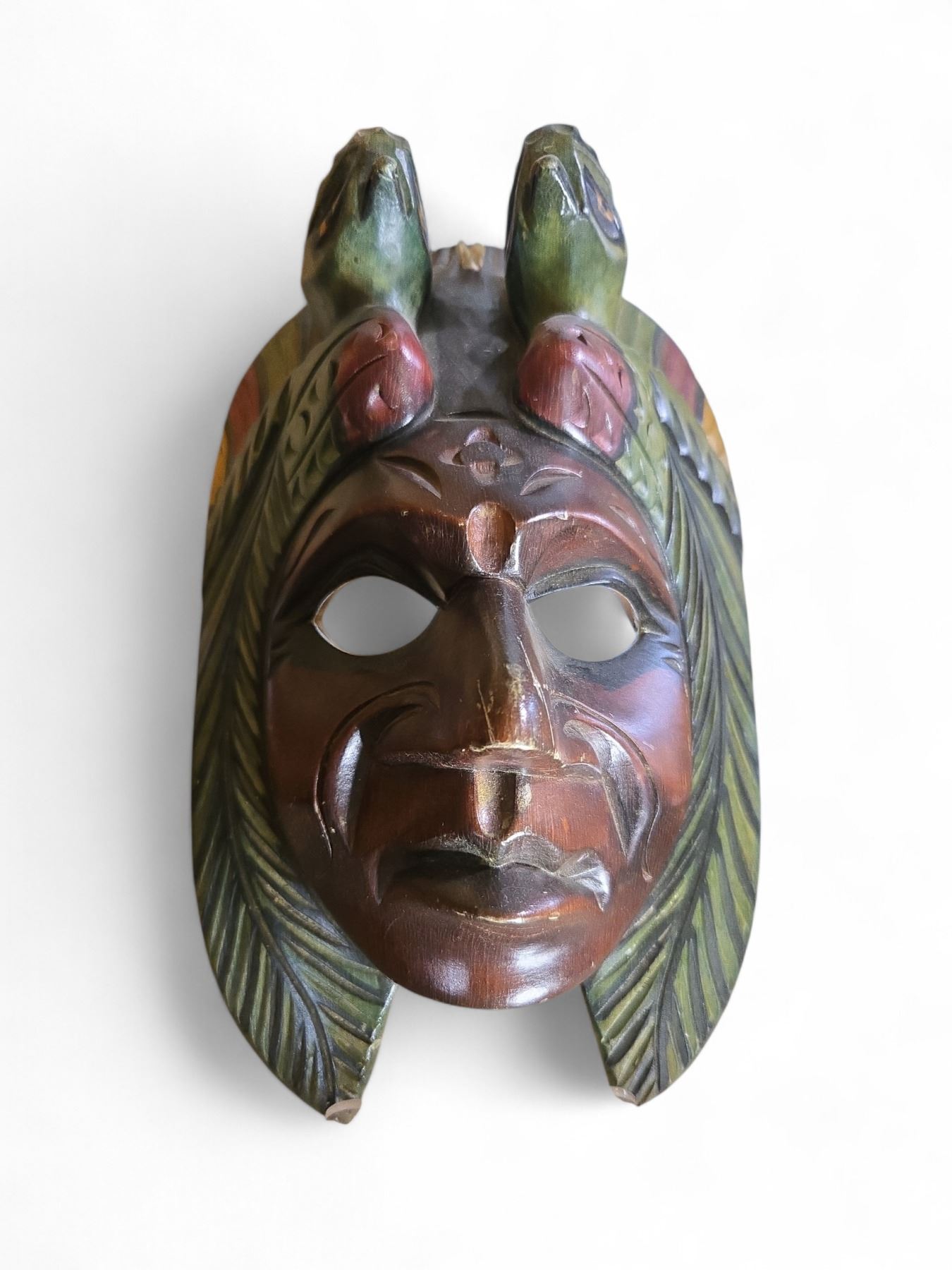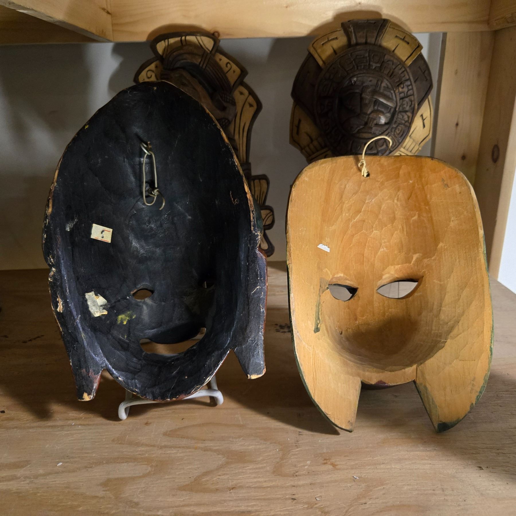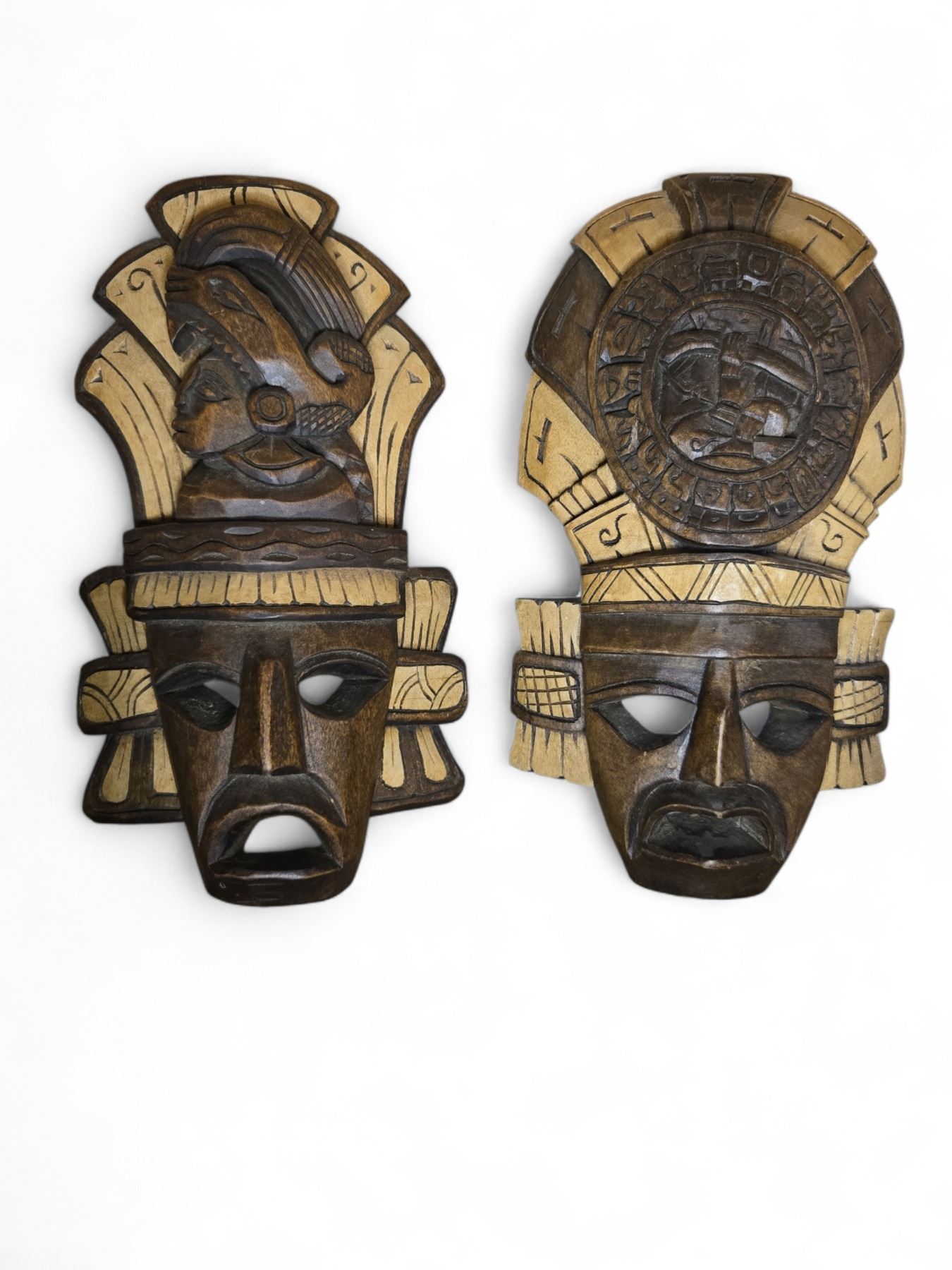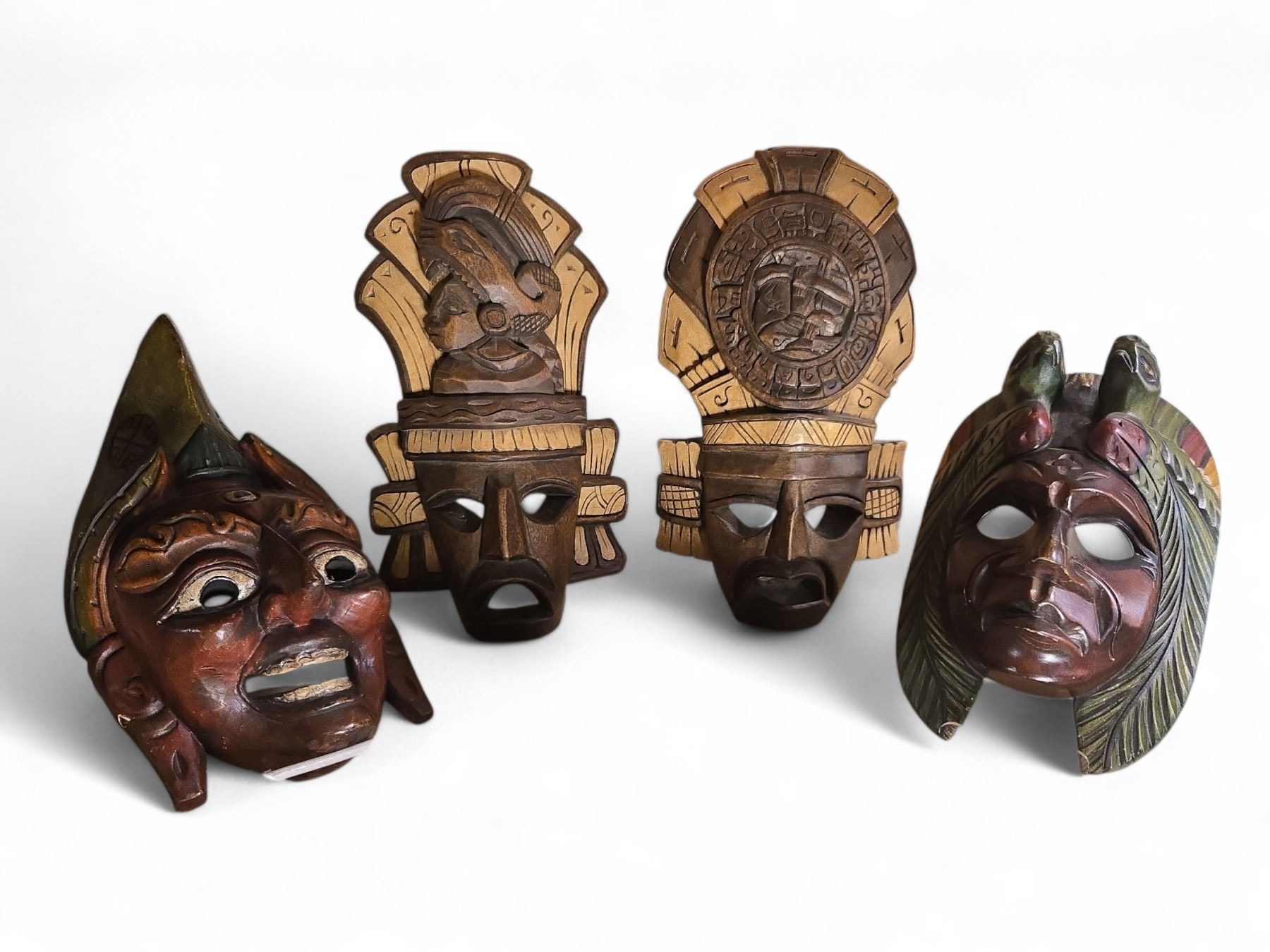 4 Hand-Carved Wooden Decorative Masks (H11-14") - Possibly Maya or Aztec Style