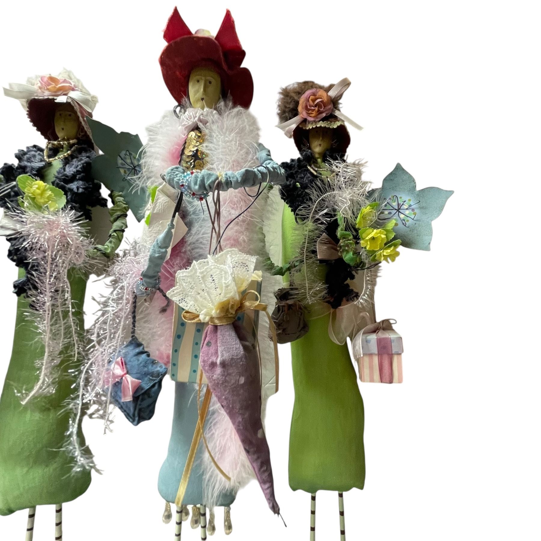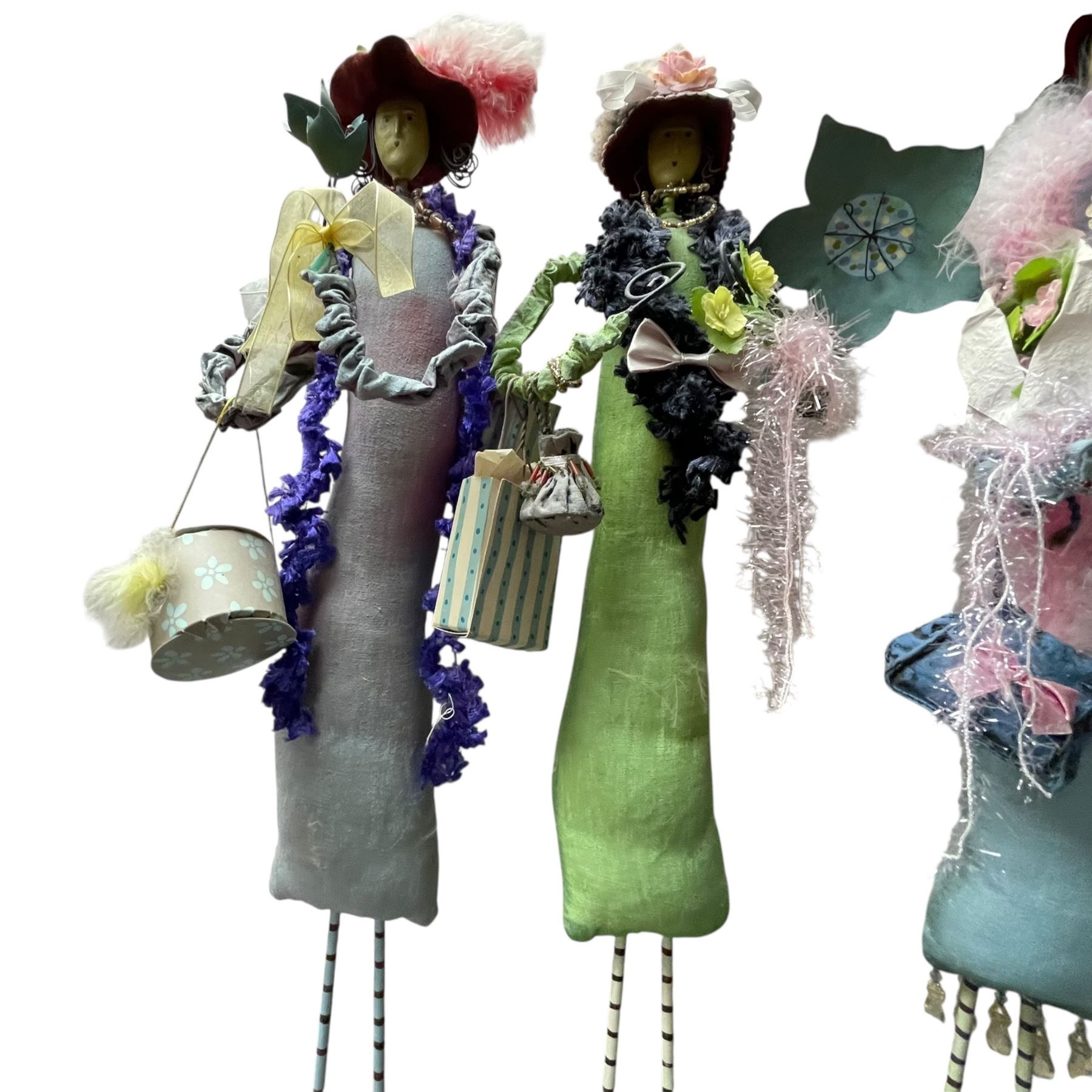 Set of 4 handcrafted folk art dolls with a style similar to works by artists like August Moon, Yvonne Thorp, or Jill Maas. Each doll stands approximately 21-Inch tall. Creative and detailed designs. Item is as pictured.