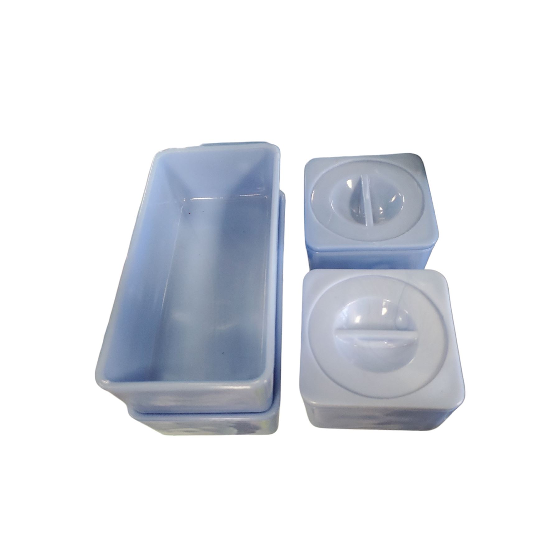 Set of 4 vintage Jeannette Glass refrigerator dishes in Delphite blue glass. Produced during the Depression era, these opaque glass containers were designed for food storage in refrigerators. Known for their striking blue color and durable construction. Item is as pictured.
