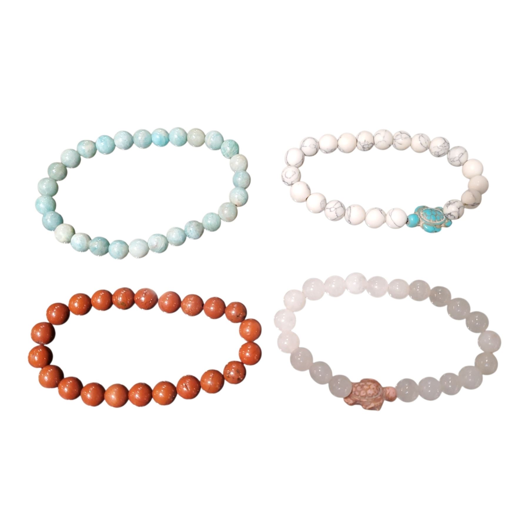 4 Natural Polished Gemstone Bead Bracelets - Rose Quartz, Howlite, Red Jasper & Amazonite (7.5 to 8 mm beads)