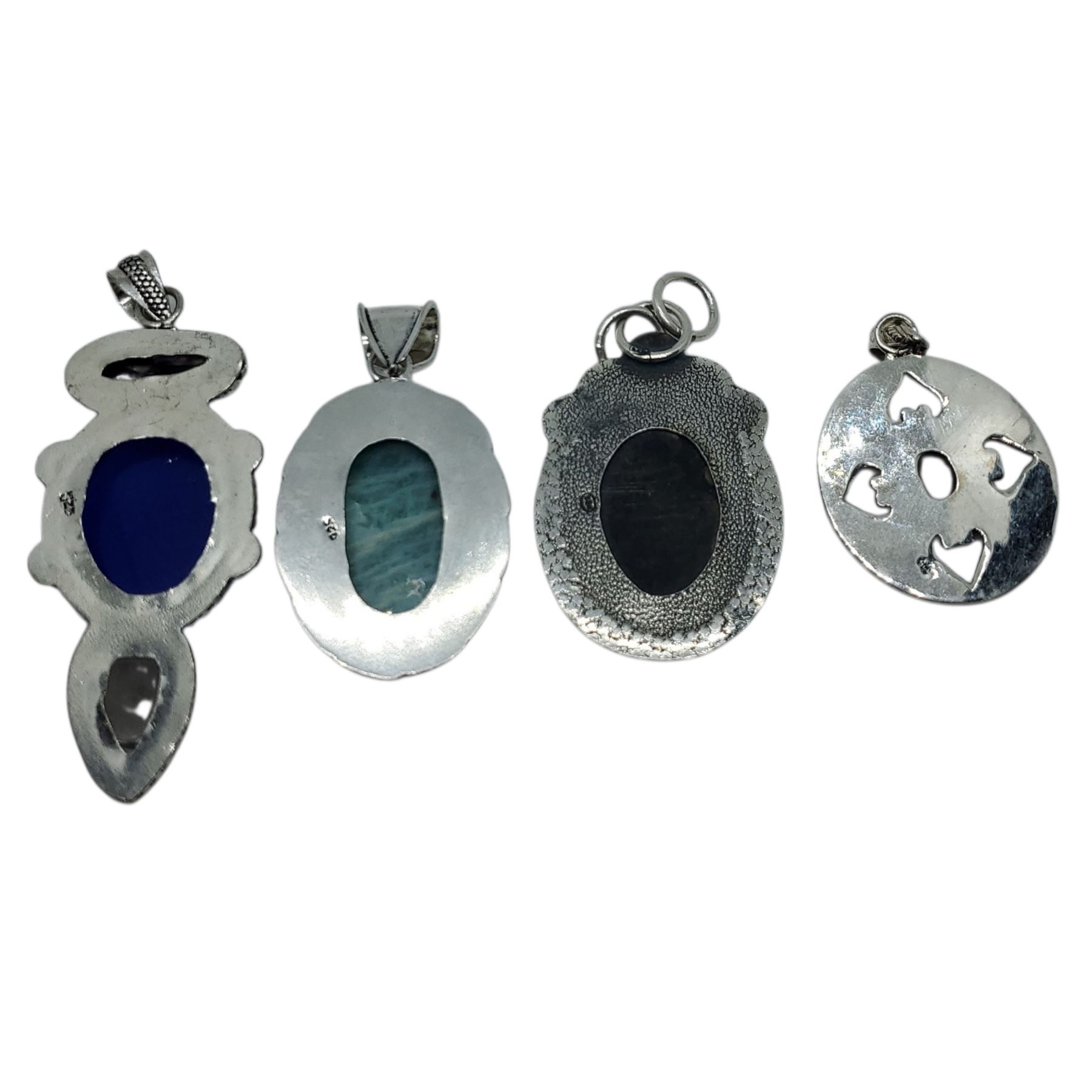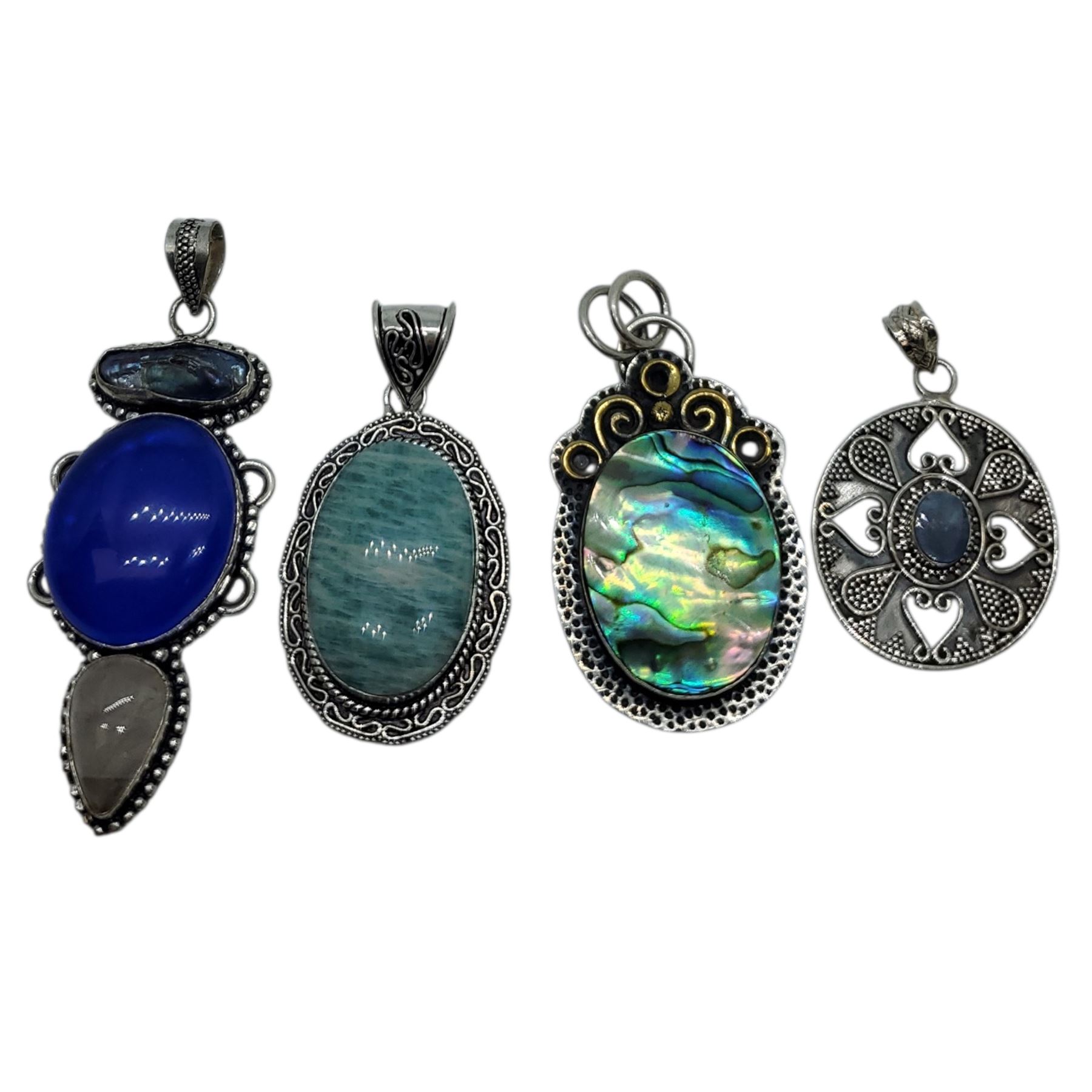 4 New Natural Gemstone & Abalone Pendants * all stamped .925 (Abalone, Opal, Blue Kyanite, and Amazonite) Longest pendant is 68 mm * Total weight: 58.7 grams