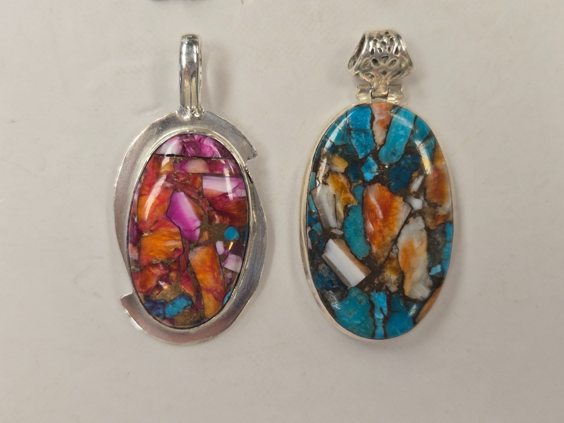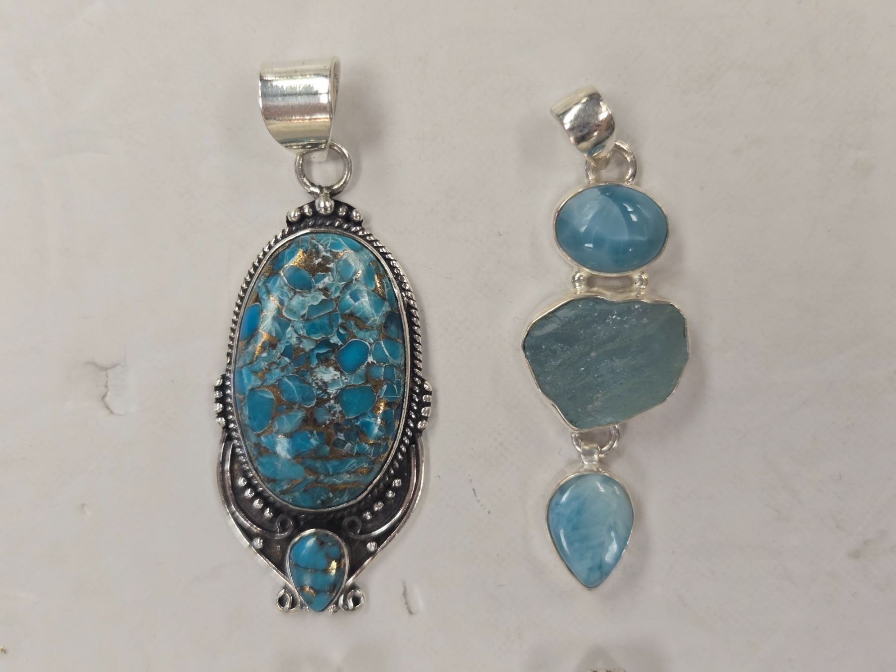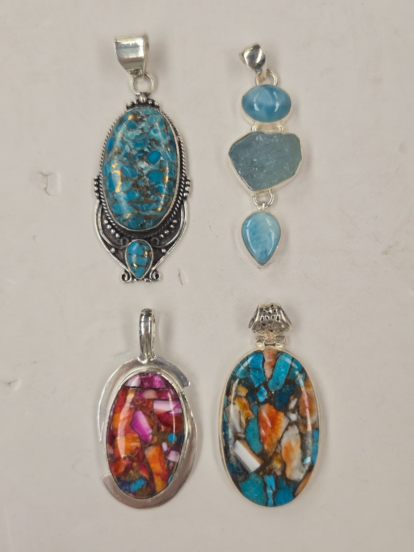 4 New Natural Stone & Crystal Pendants in Silver Settings - Spiny Oyster Copper Turquoise, Turquoise, & Larimar (all stamped .925) Total weight: 40.2 grams