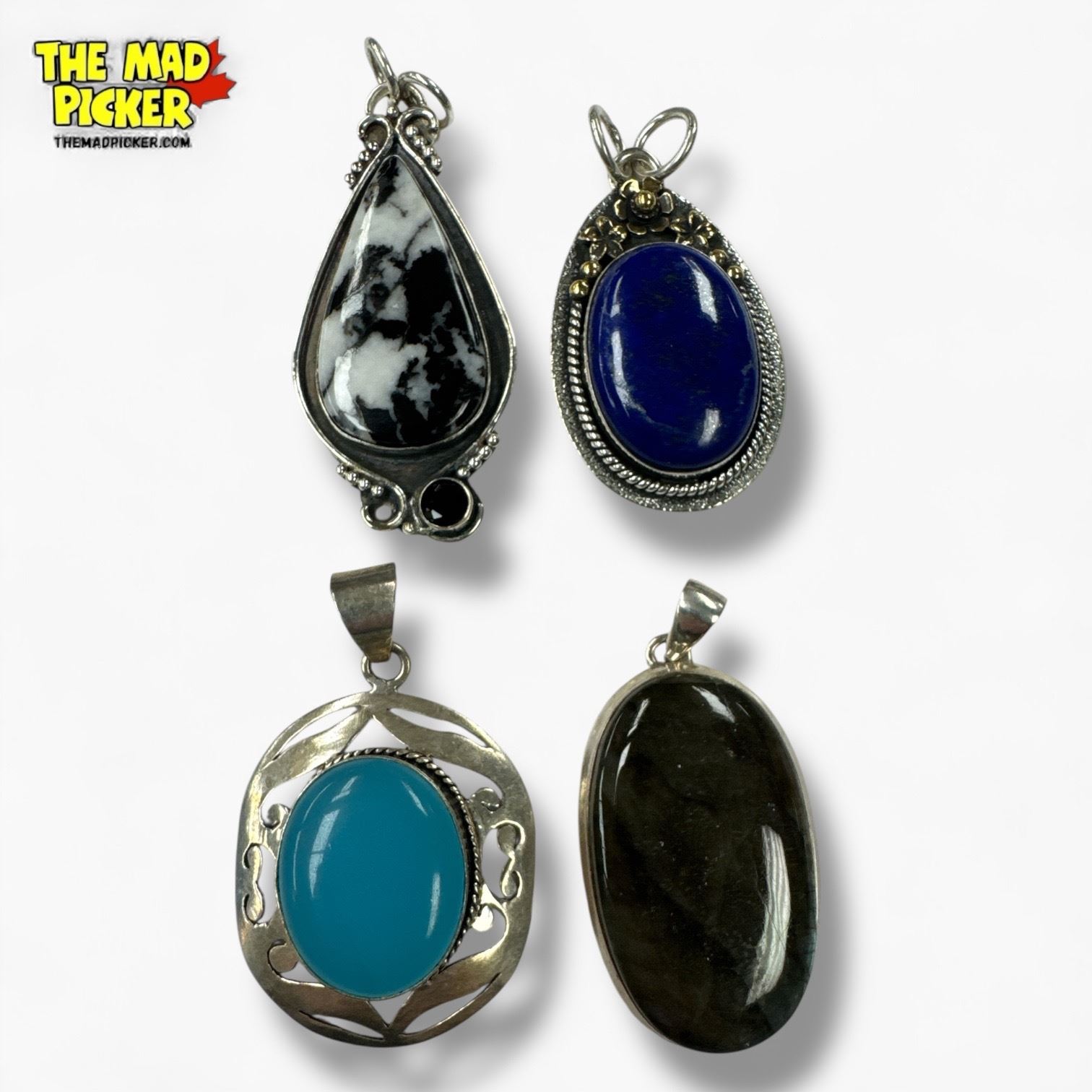 4 New Natural Stone Pendants in Silver Settings - all stamped .925 - 1 has gold-tone accents (Chalcedony, Labradorite, Lapis and Buffalo Turquoise) Total weight: 65.7 grams
