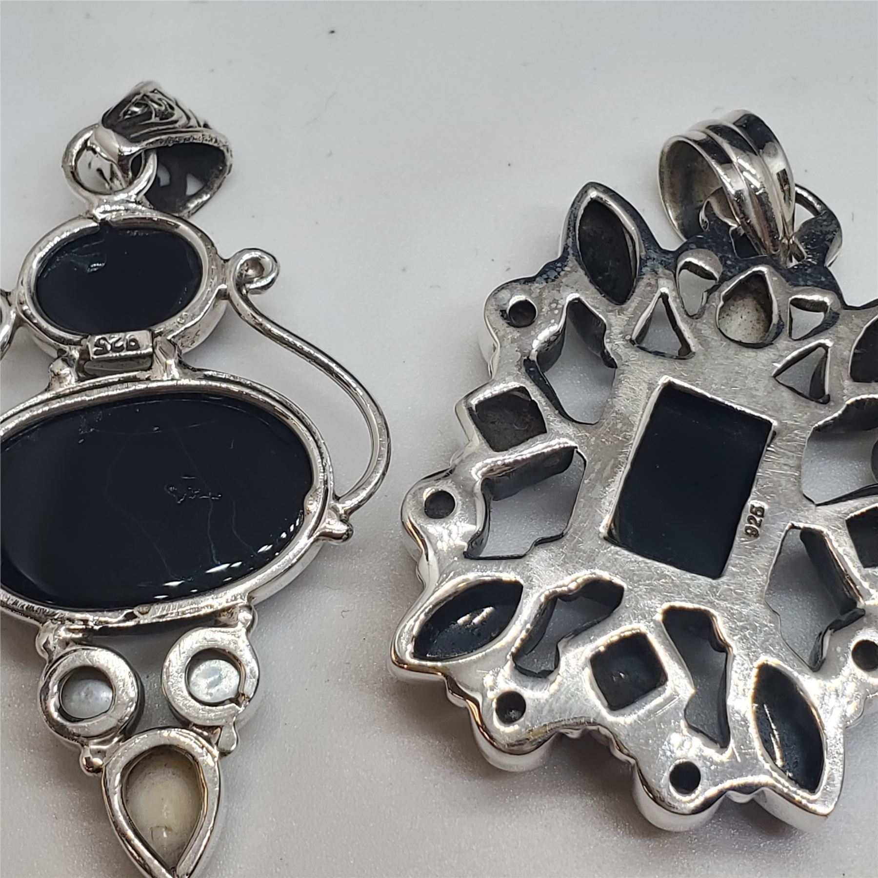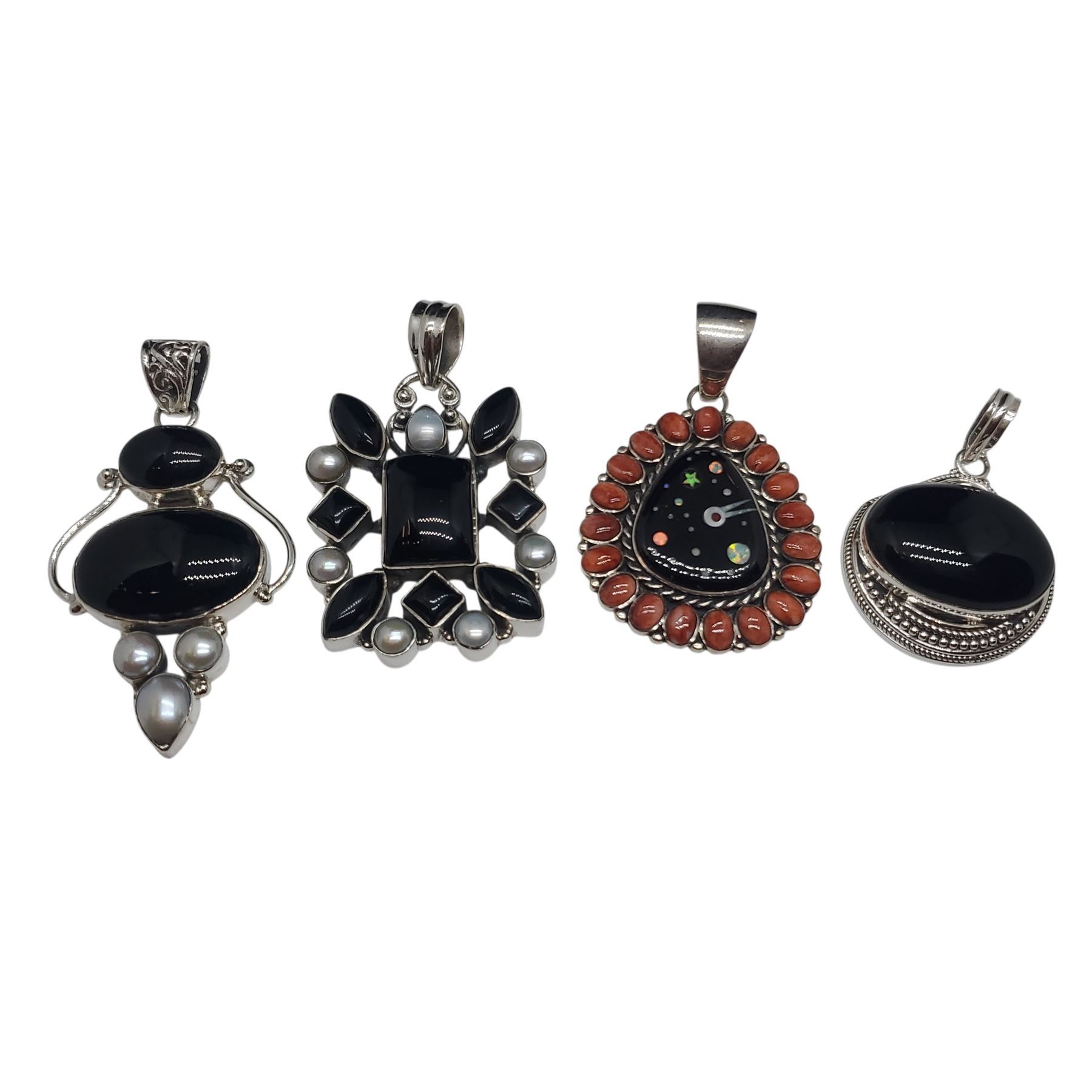 4 New Onyx & Gemstone Pendants in Silver Settings (all stamped .925) - Total Weight: 59 grams