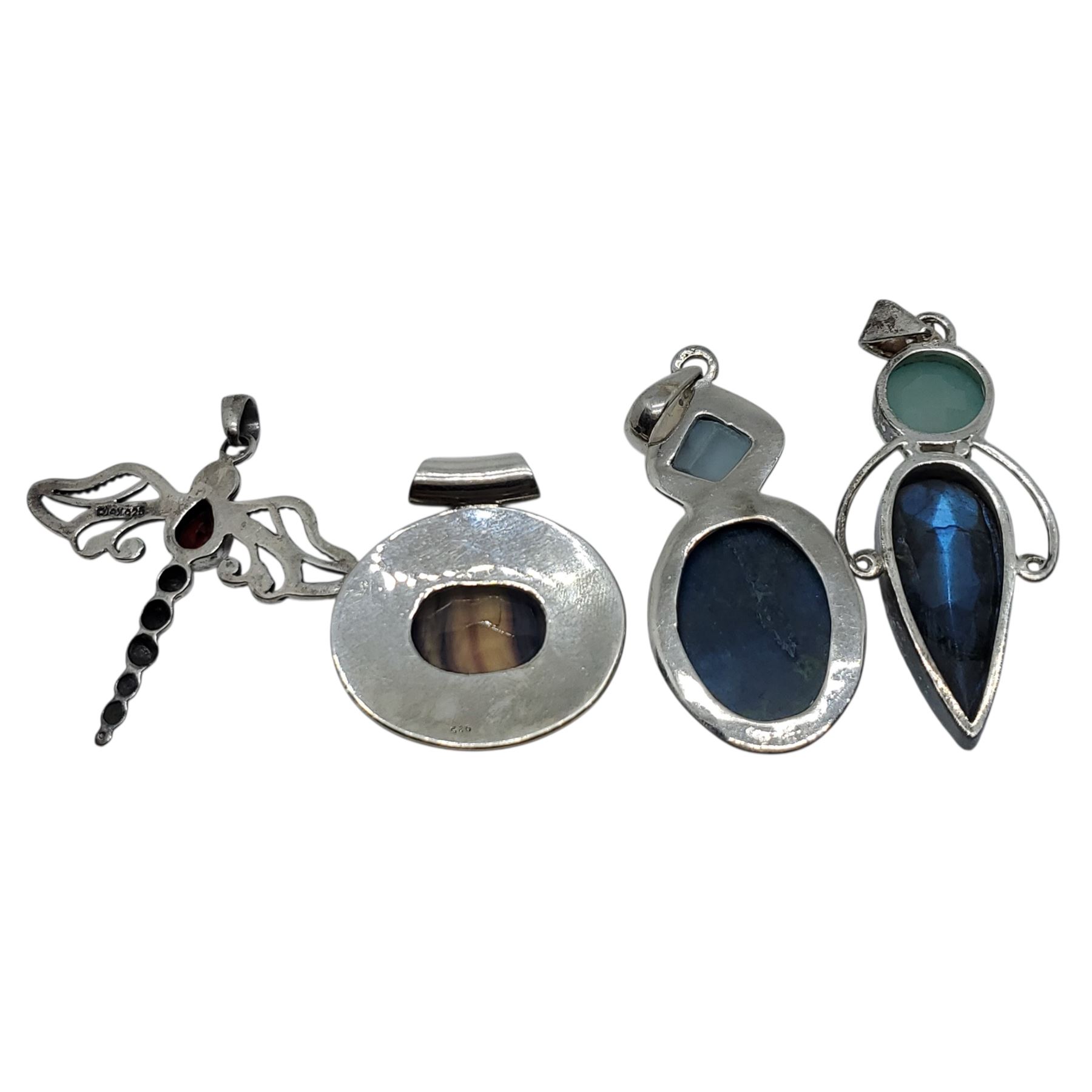 4 New Polished & Faceted Gemstone & Crystal Pendants * all stamped .925 (Garnet, Fluorite, Labradorite with Chalcedony, & Blue Apatite) Longest pendant is 47 mm * Total weight: 33.0 grams