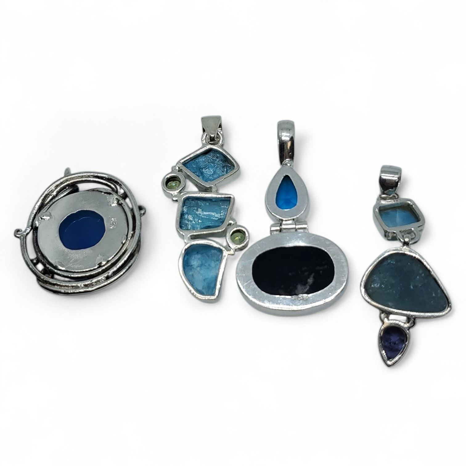 4 New Polished & Faceted Natural Gemstone & Crystal Pendants * all stamped .925 (Raw Aquamarine, Chalcedony, Triplet Opal & Sapphire Crystal) Longest pendant is 49 mm * Total weight: 36.5 grams