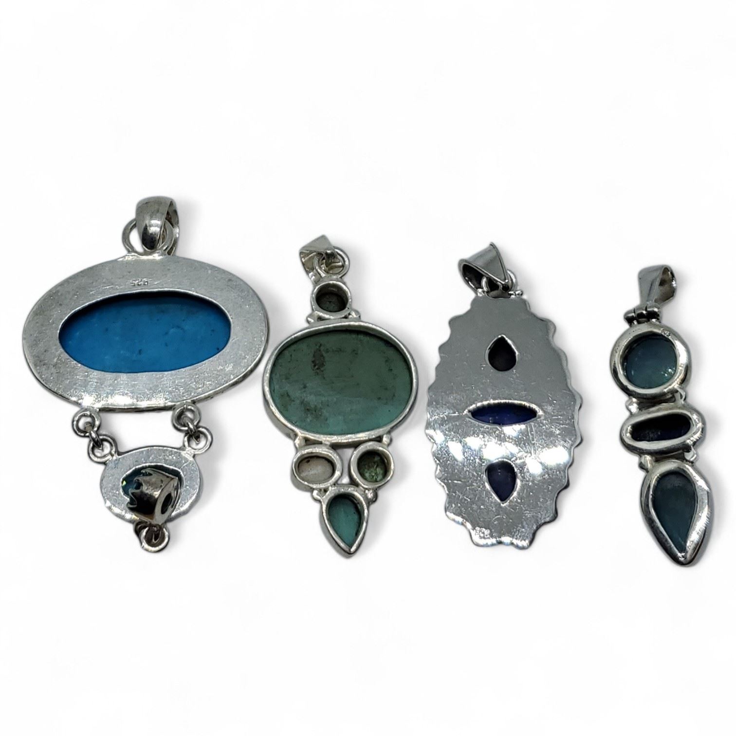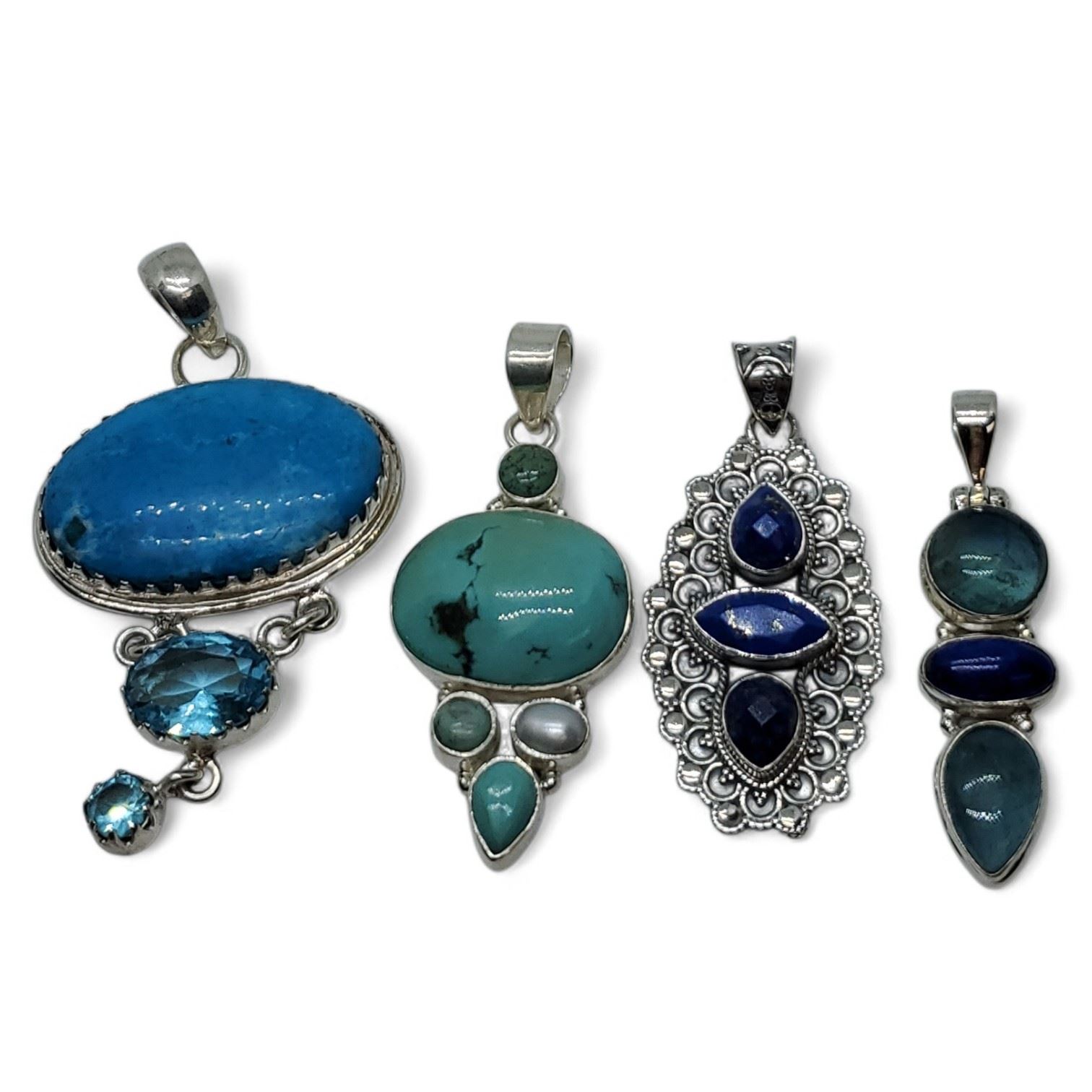 4 New Polished & Faceted Natural Gemstone & Crystal Pendants * all stamped .925 (Turquoise, Aquamarine, Lapis with Blue Kyanite & Blue Topaz) Longest pendant is 60 mm * Total weight: 44 grams