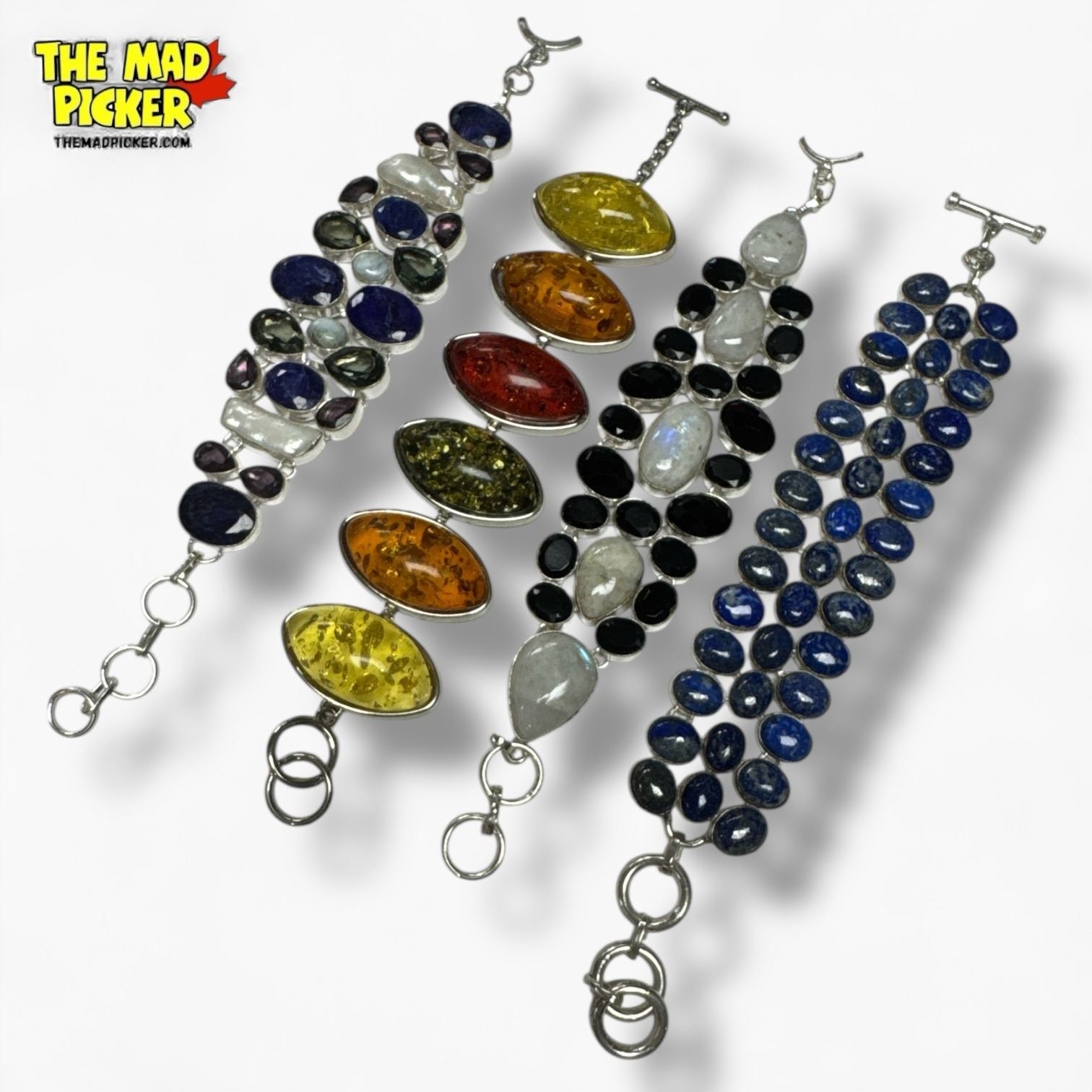 4 New Wide Gemstone Toggle Bracelets in Silver Settings - Moonstone, Amber Resin, Amethyst, Mabe Pearl, and more